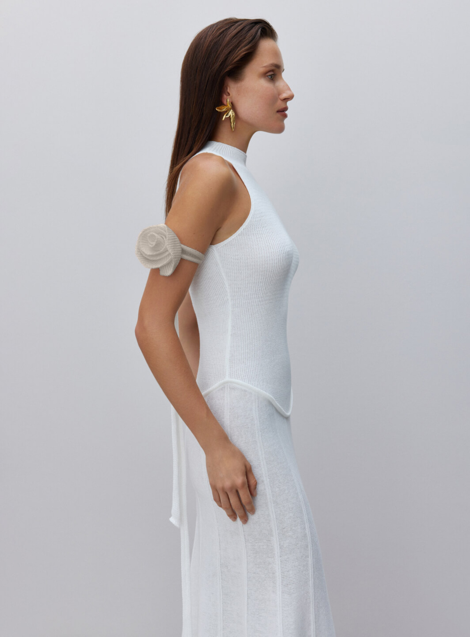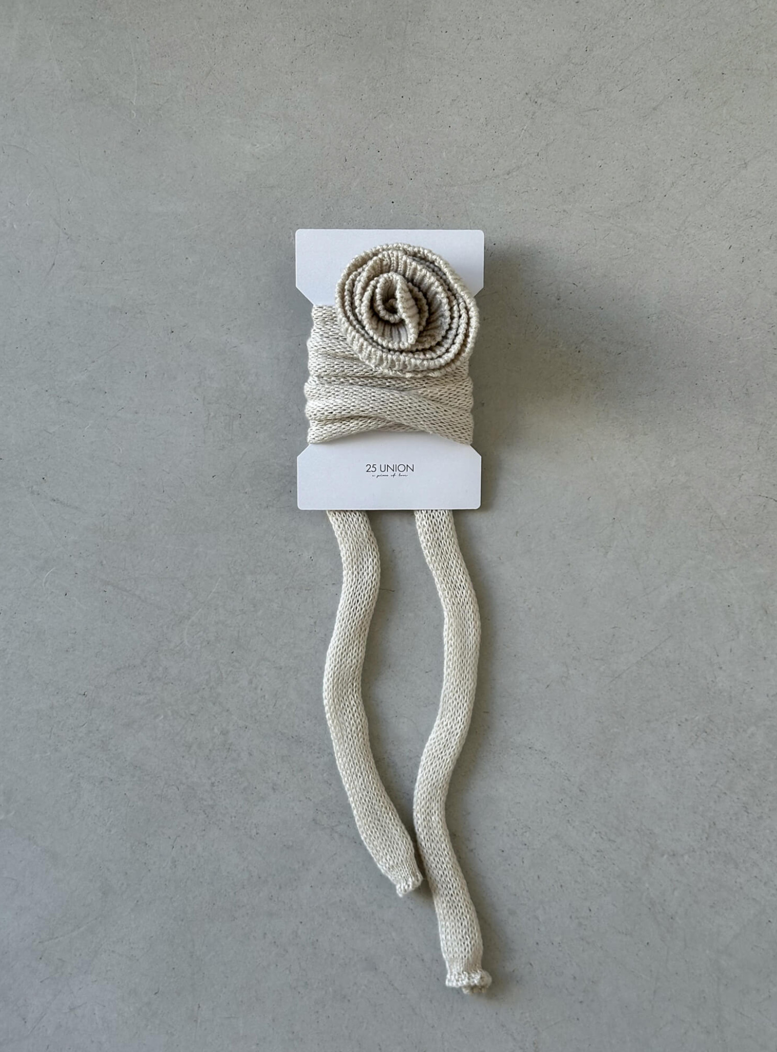 An accessory in the form of a closed rose bud, painstakingly assembled by hand. The flower is attached to a scarf, which can be styled into images by tying it around the waist, neck, or arm. A trendy accessory that will complement images with a spectacular accent.
