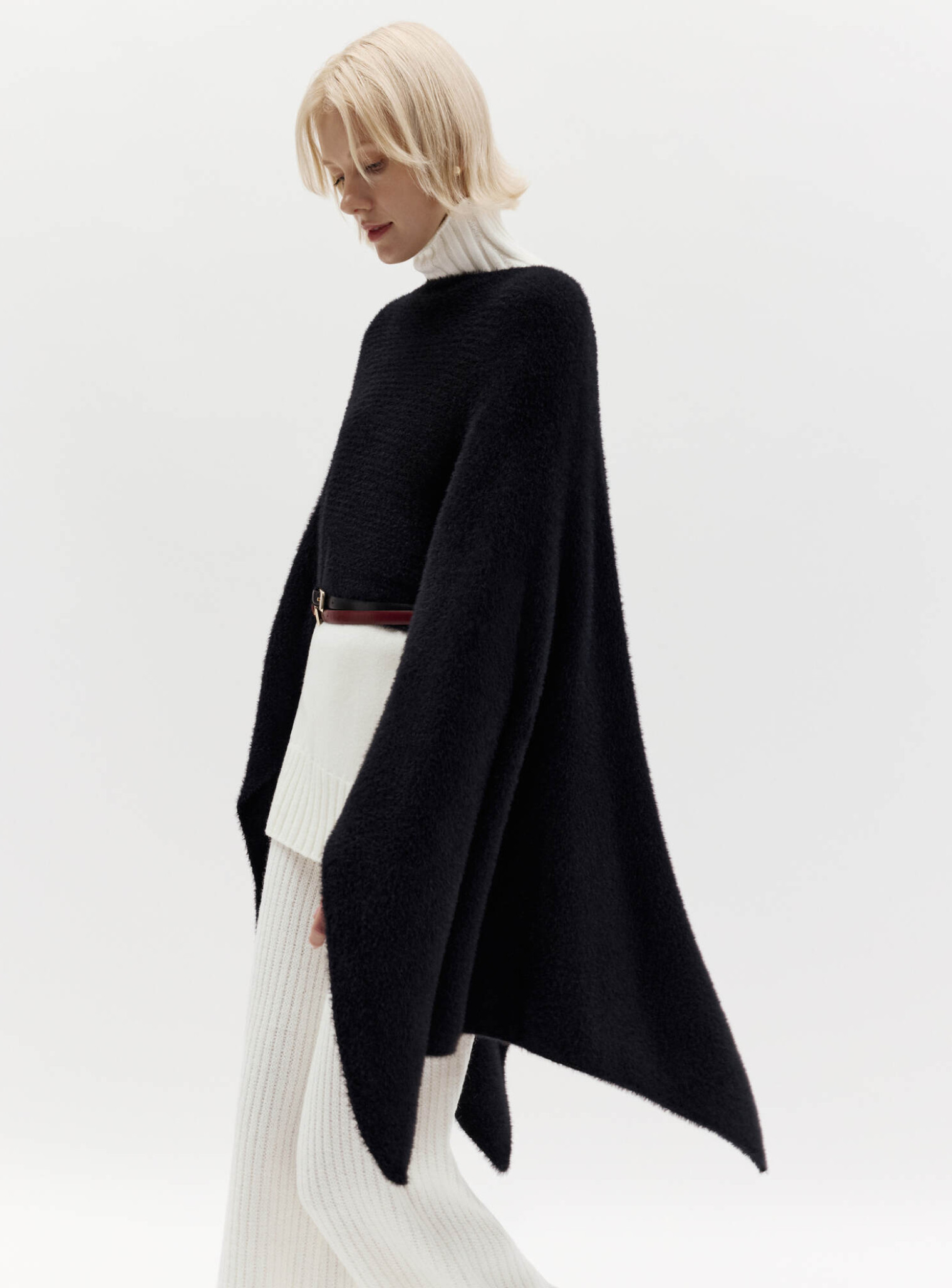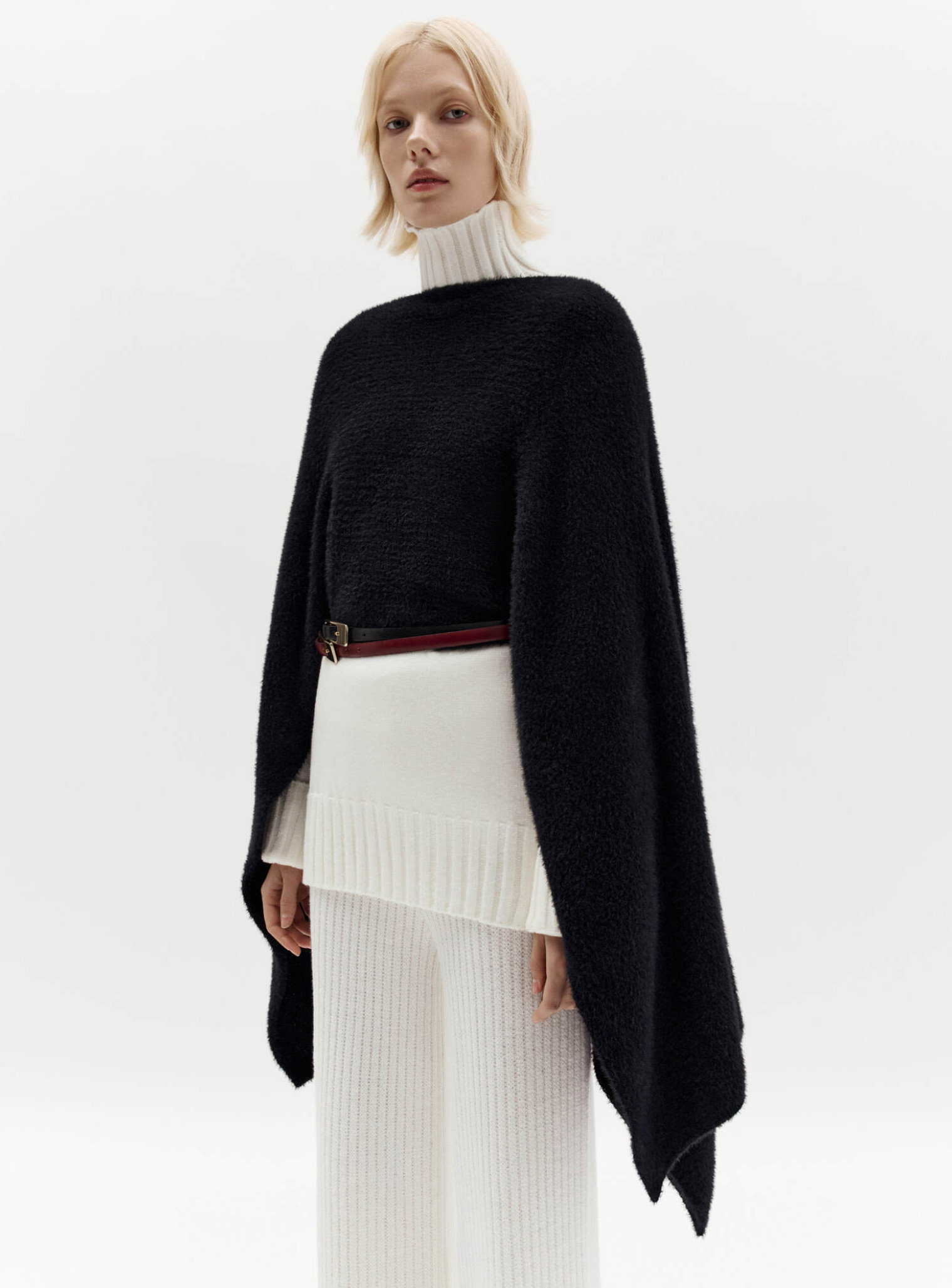 A rectangular elongated stole. It has a cut in the center that allows you to wear it over your head or sleeve, changing the styling. Made of soft and delicate fluffy yarn that retains heat well. Combines with sweaters and jumpers of the brand.