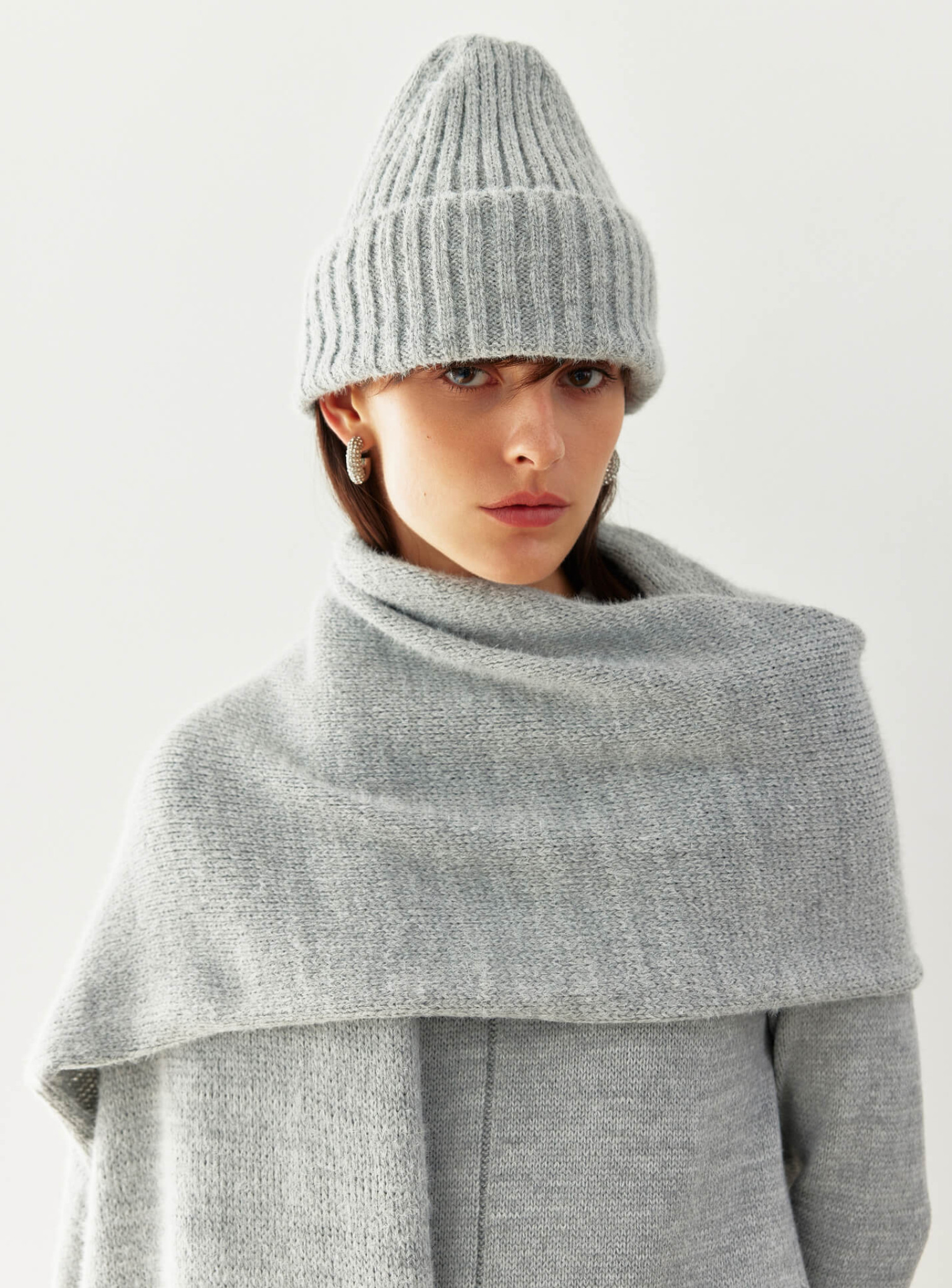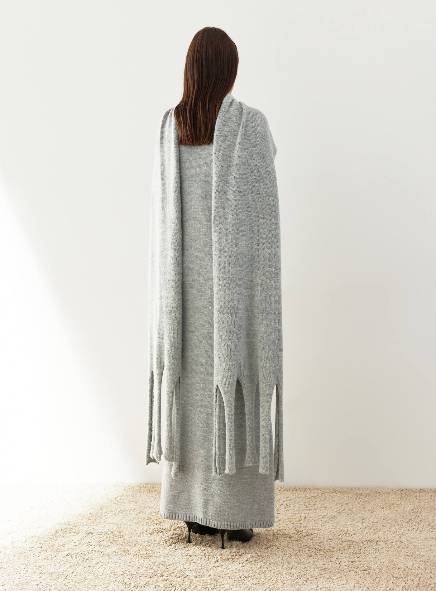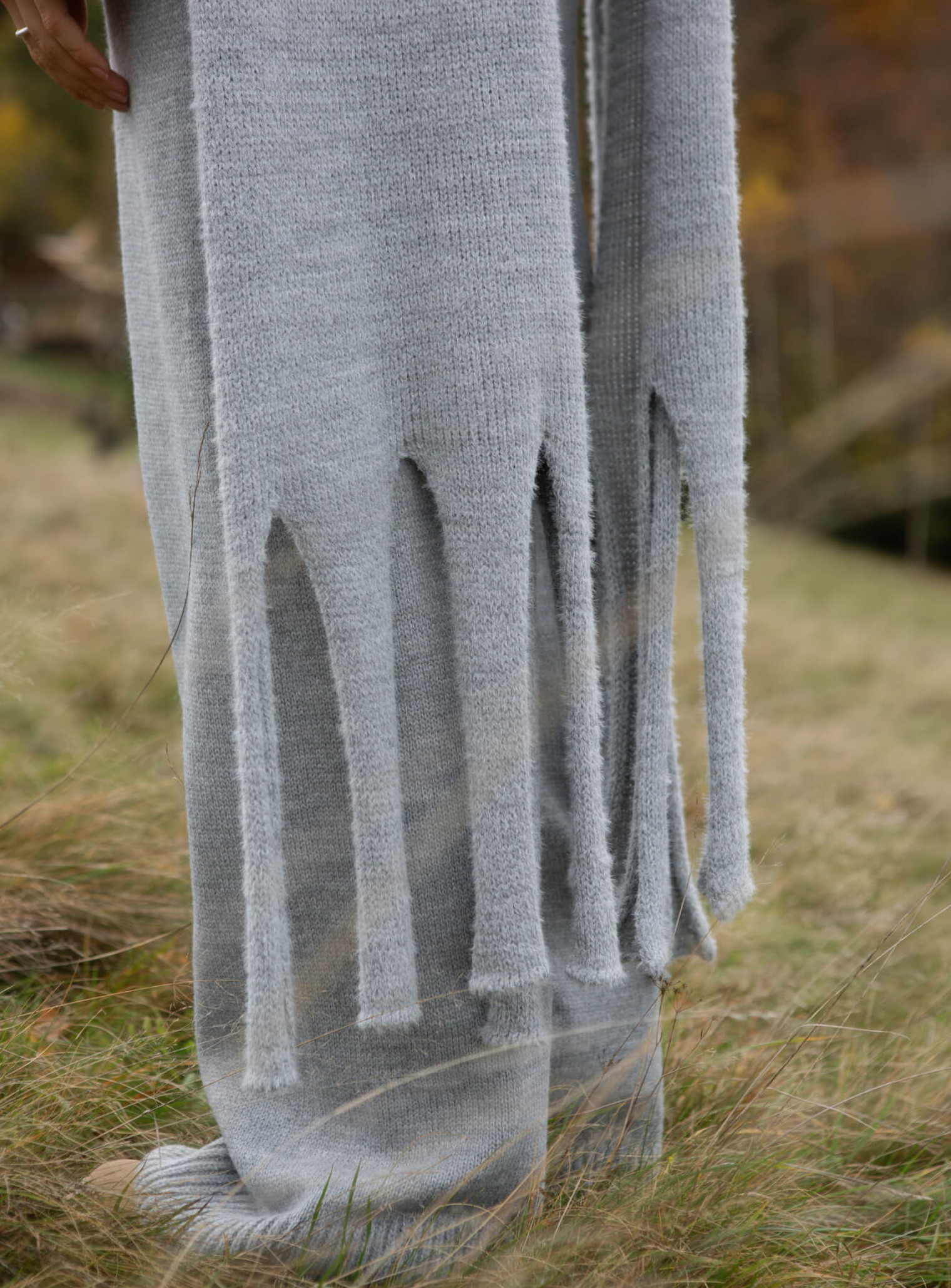A trendy oversized scarf with active slits along the edges that will complement the look with accents. The current model is made of soft warm yarn with the addition of fluffy thread. It goes well with a cap with a cowl.