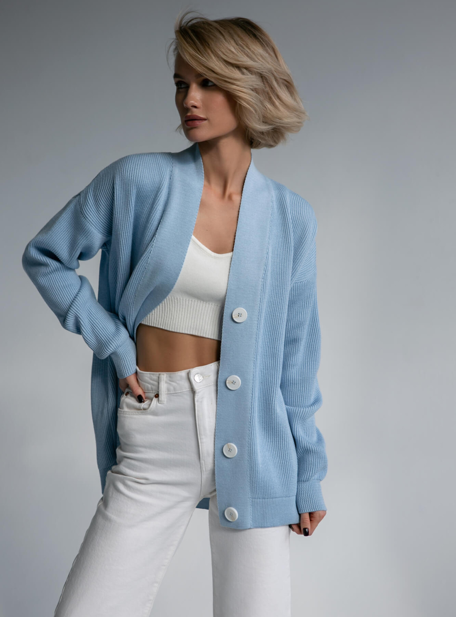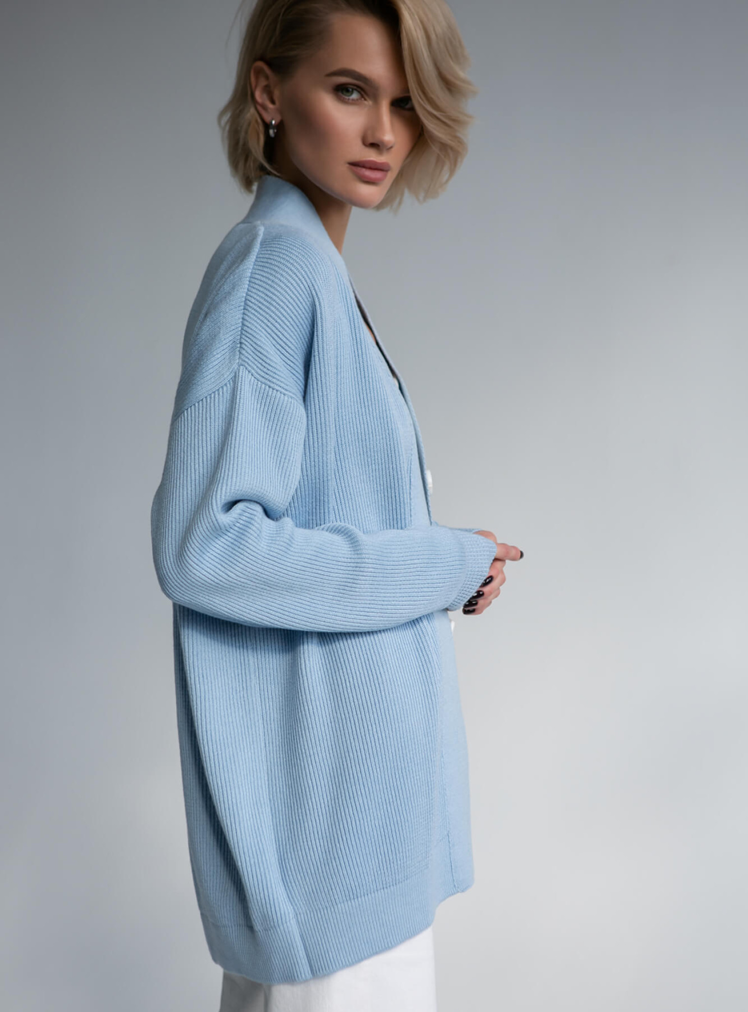 Oversized cardigan made from natural cotton thread. Ideal with a signature top, flared trousers and mini dress.