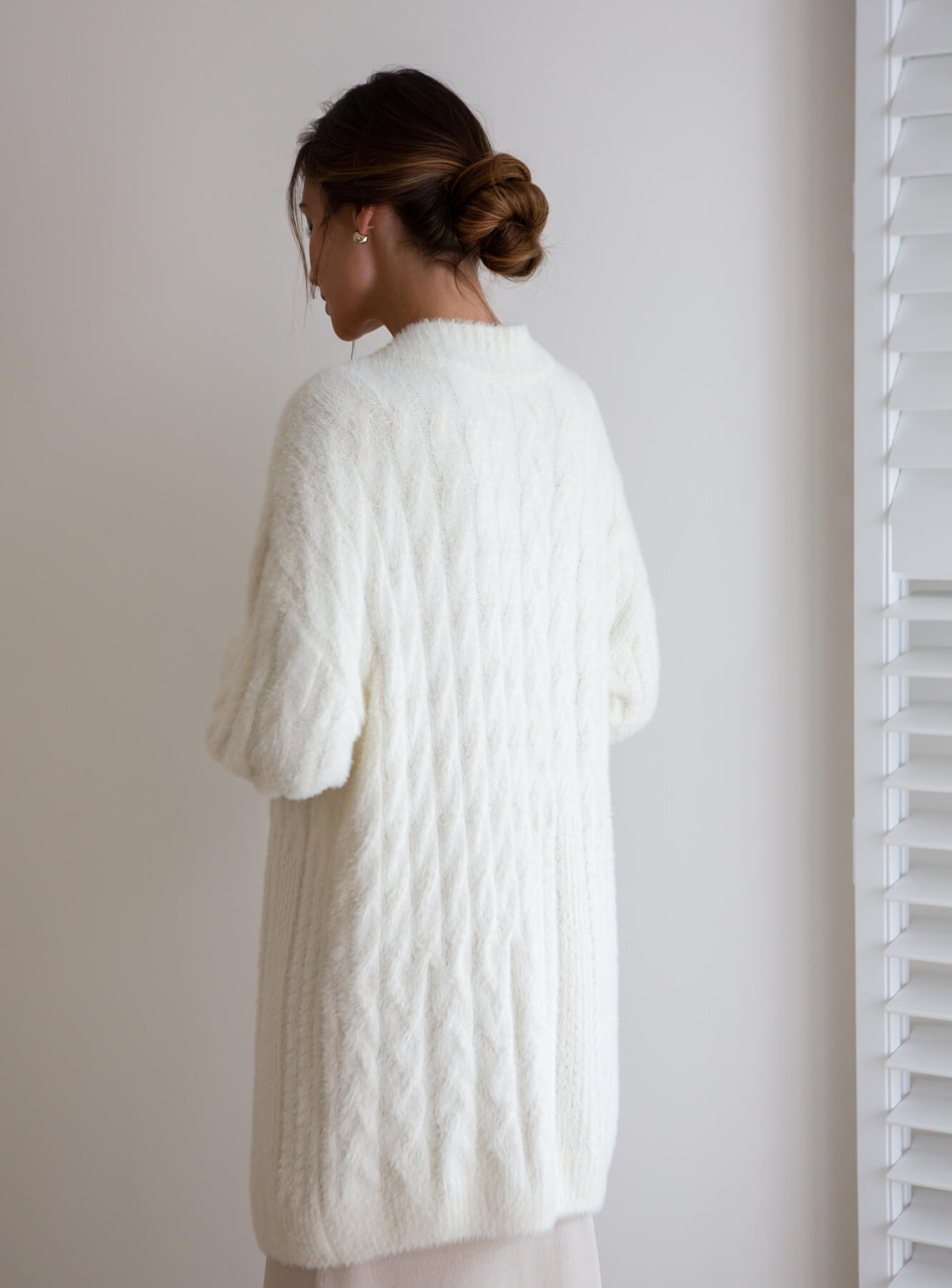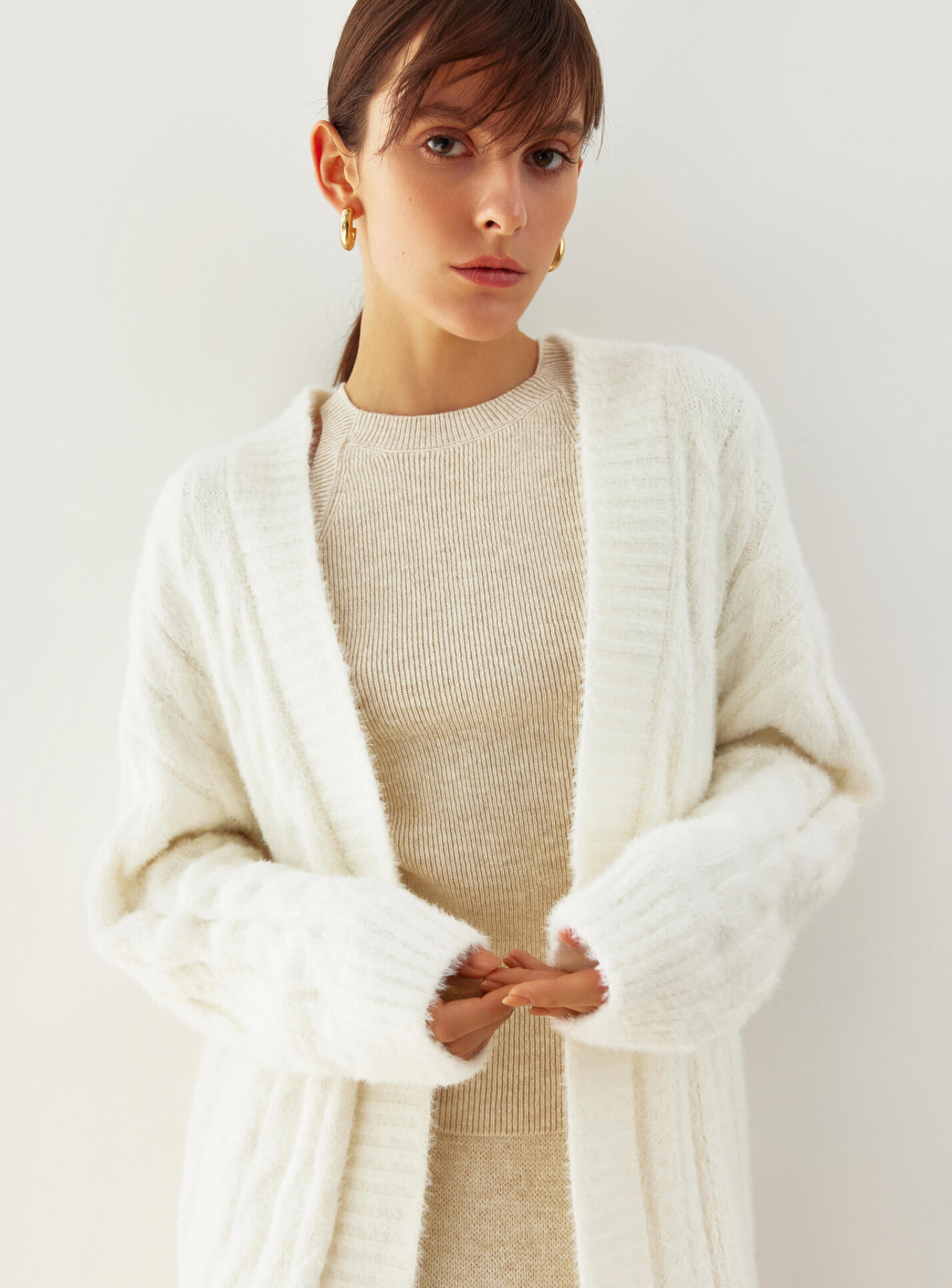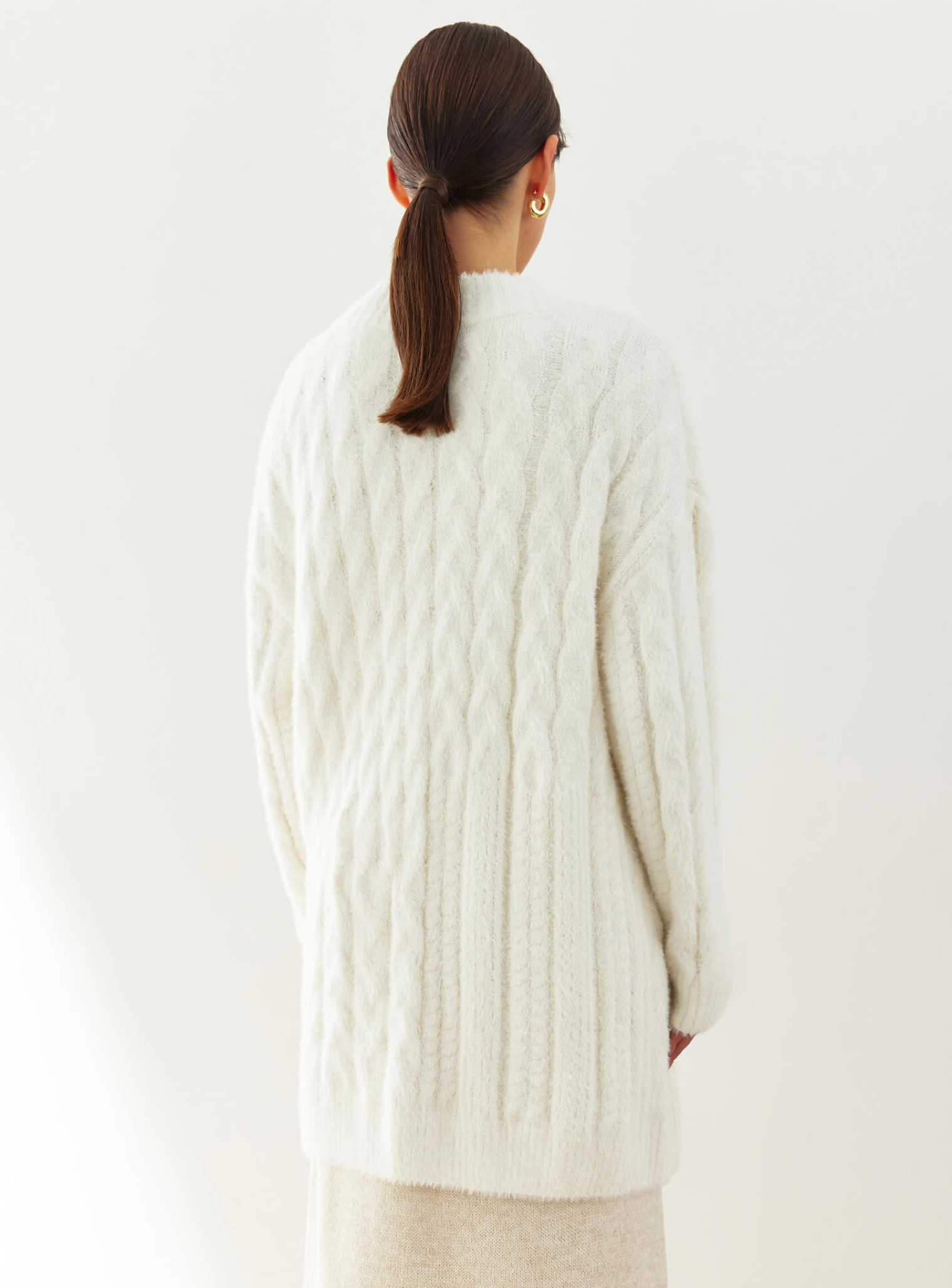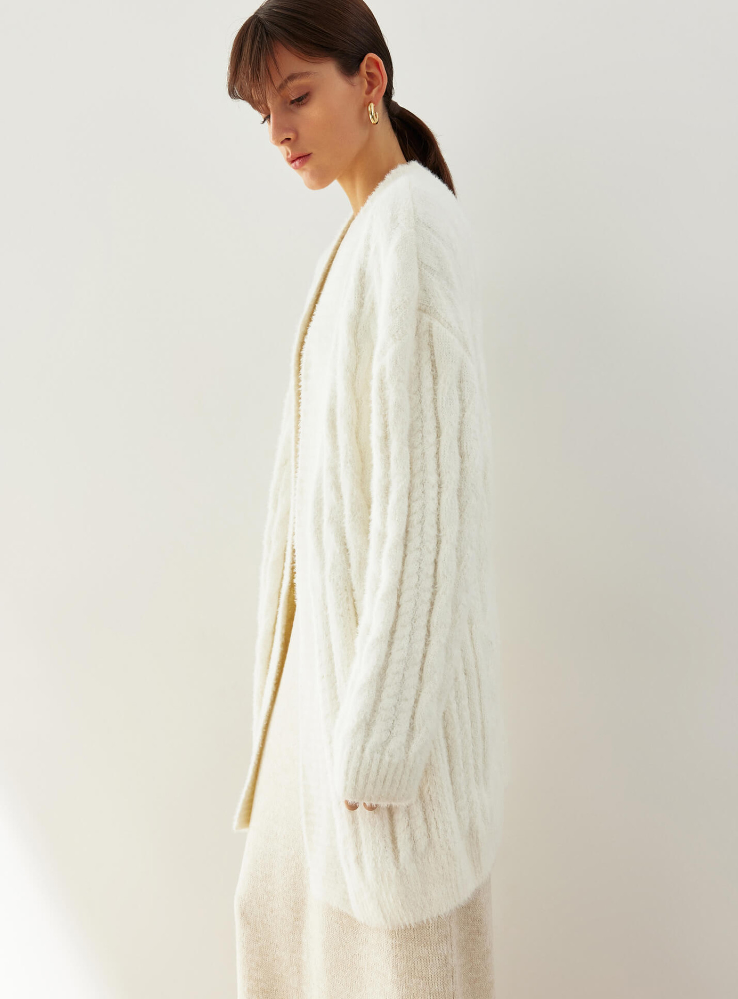 A cozy cardigan made of soft fluffy yarn with a textured pattern that varies in width. The straight cut creates a beautiful silhouette that will complement autumn looks and keep you warm in cold weather.