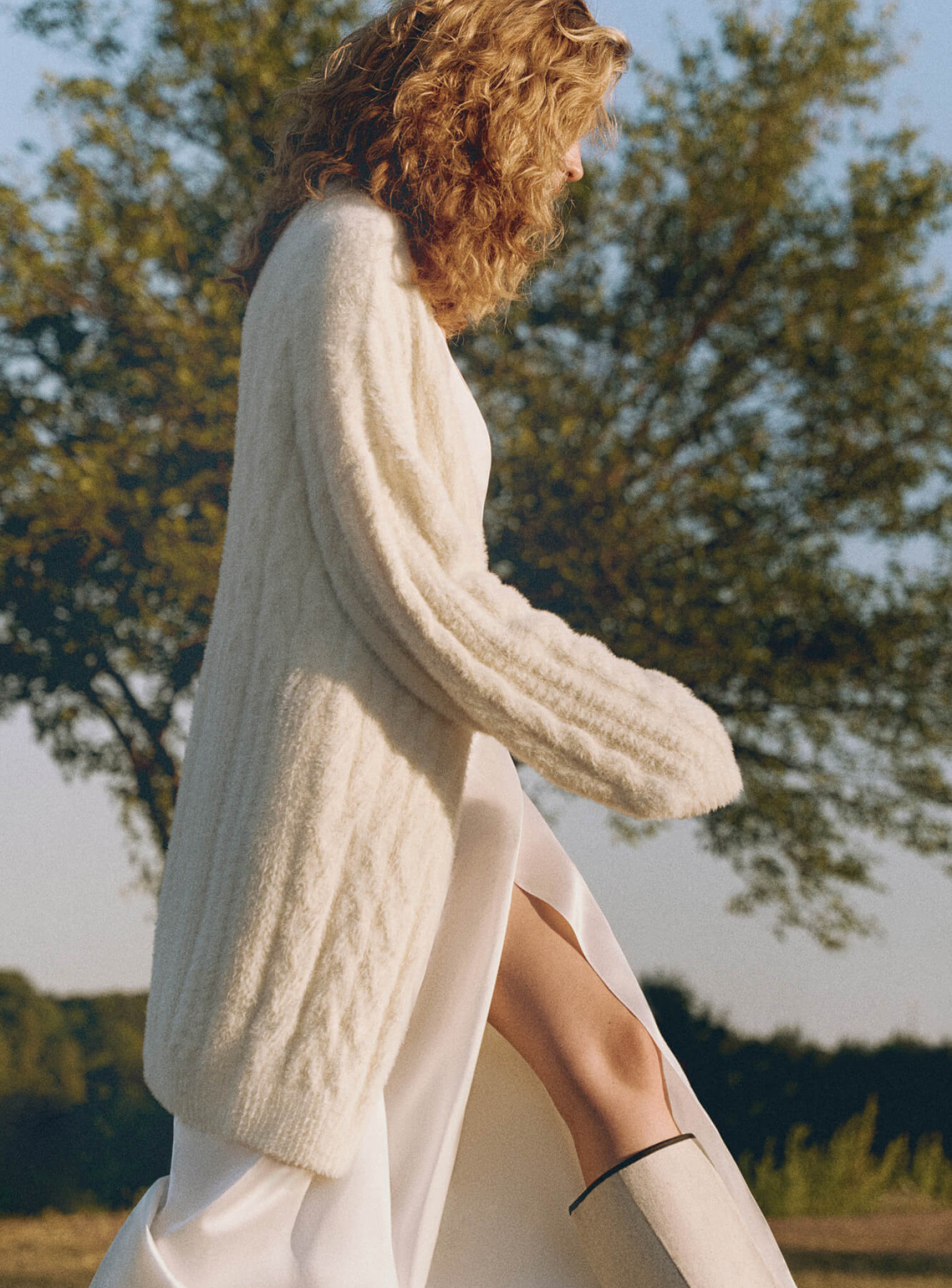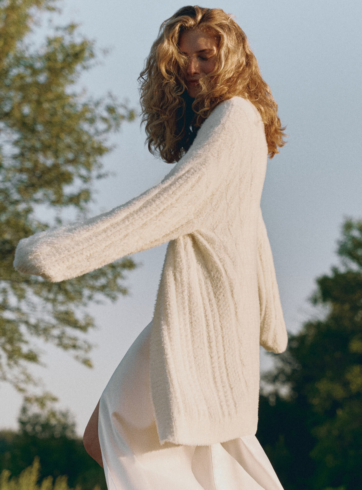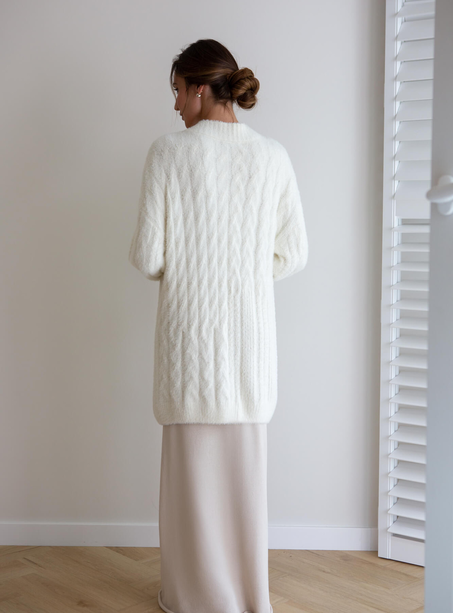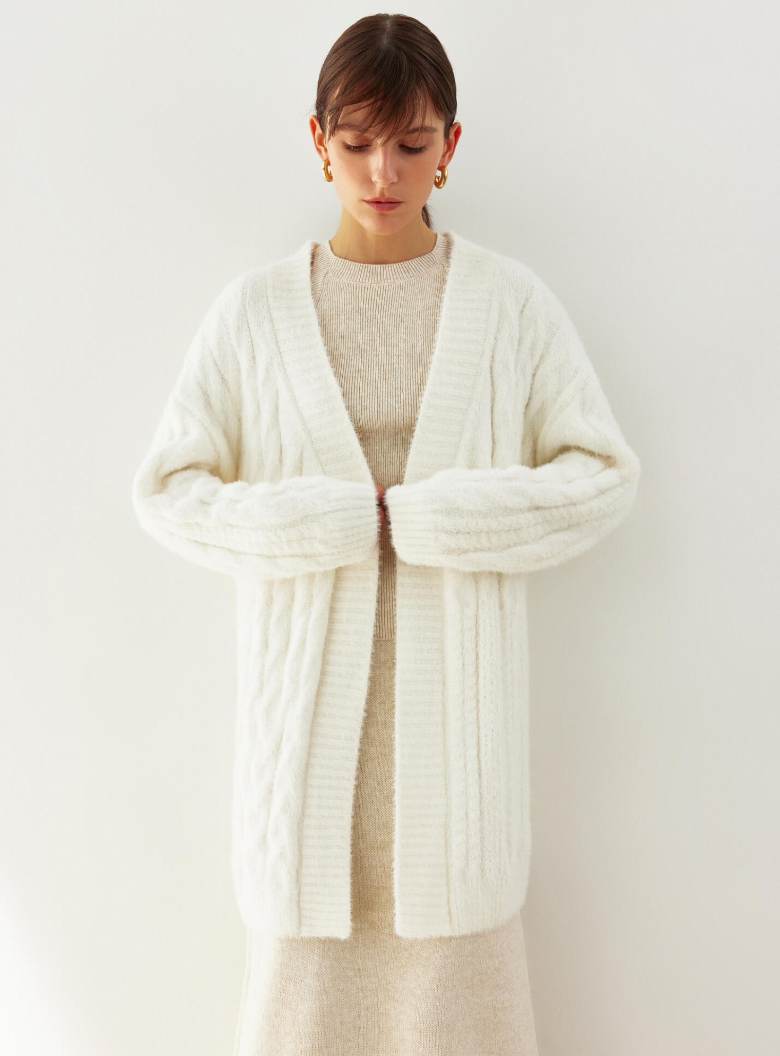 A cozy cardigan made of soft fluffy yarn with a textured pattern that varies in width. The straight cut creates a beautiful silhouette that will complement autumn looks and keep you warm in cold weather.