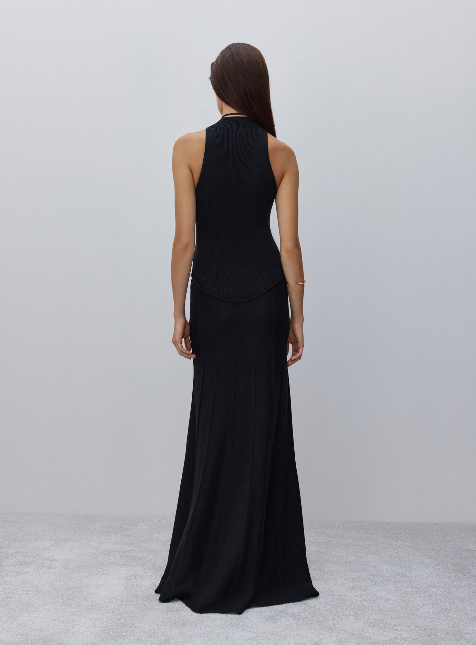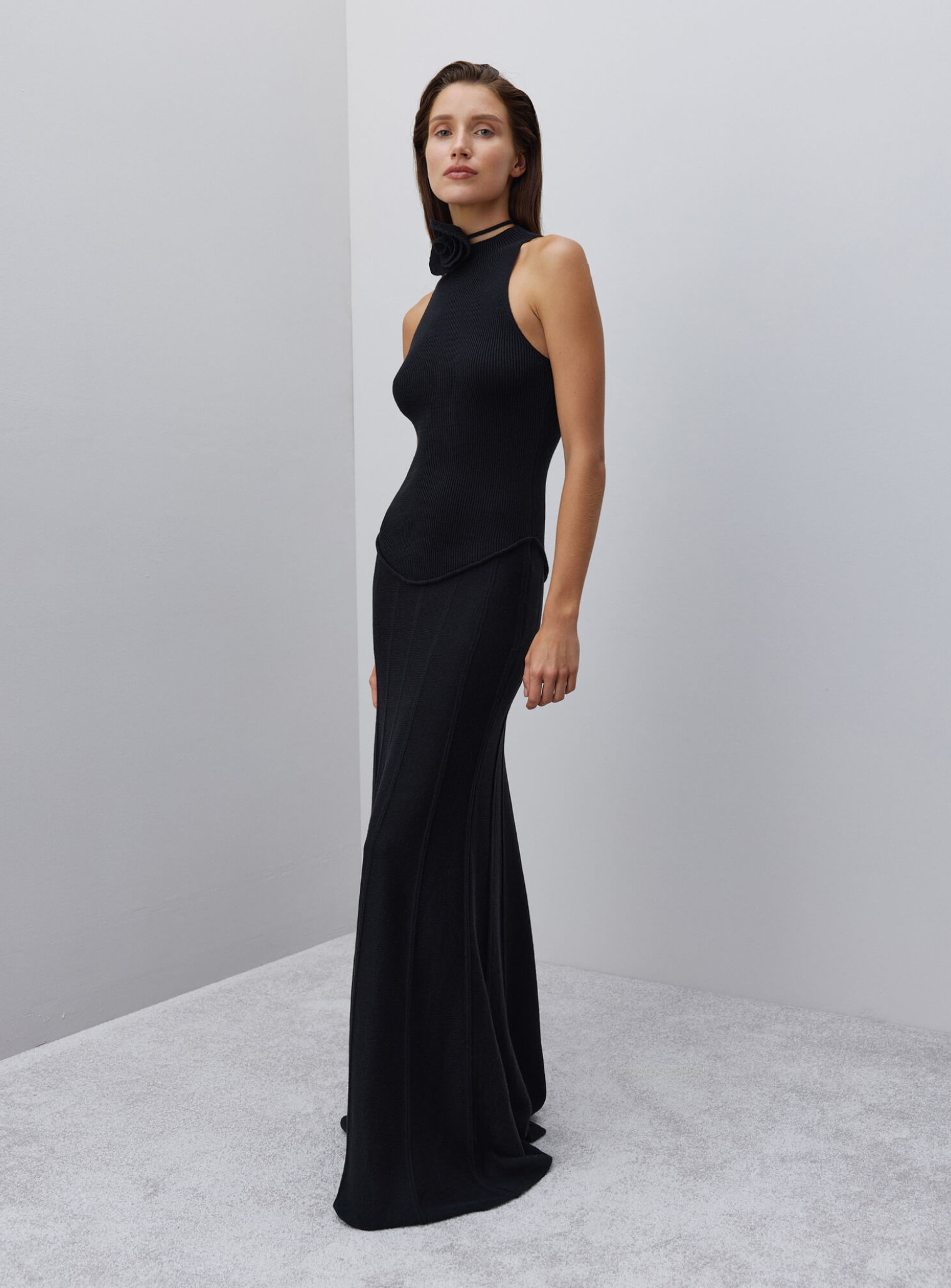 Maxi-length dress, the top and bottom of which are visually separated by a smooth framing line. The top of the dress is made of figure-hugging elastic, with a high neckline and bare shoulders. The flared skirt is made of dense weaving with vertical lines along the length. A silhouette dress with thoughtful details and accents that emphasize the advantages of the female figure and reflect beauty.