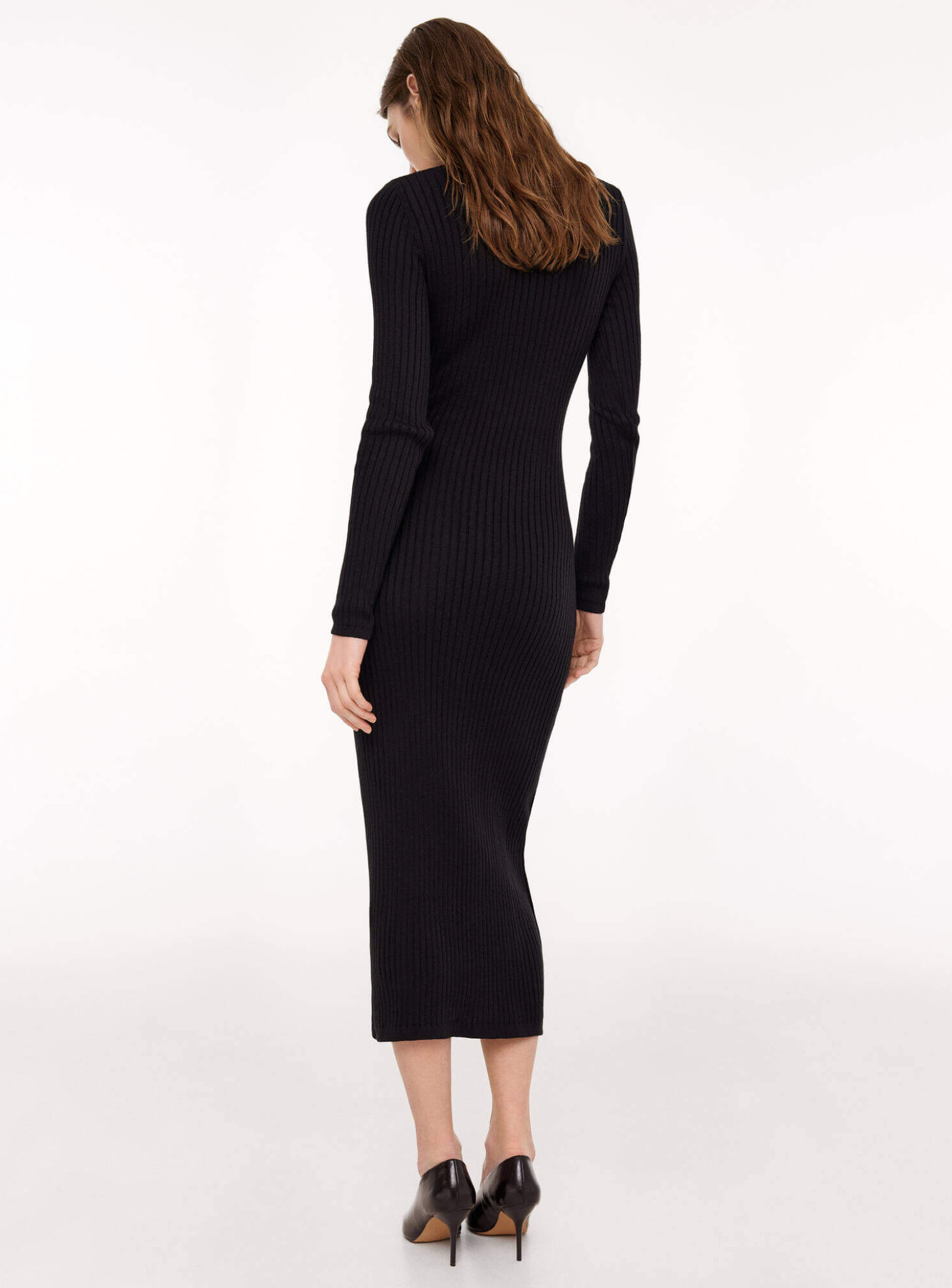 In black, the dress looks elegant and appropriate for different situations – from the office to evening outings. Combine it with a blazer and ankle boots for a business look or with a coat and boots for the city. The hair can be loose or gathered into a high ponytail. If you plan to buy knit dress for autumn, this model will become a reliable base of stylish and practical looks. You will always look perfect and impressive.