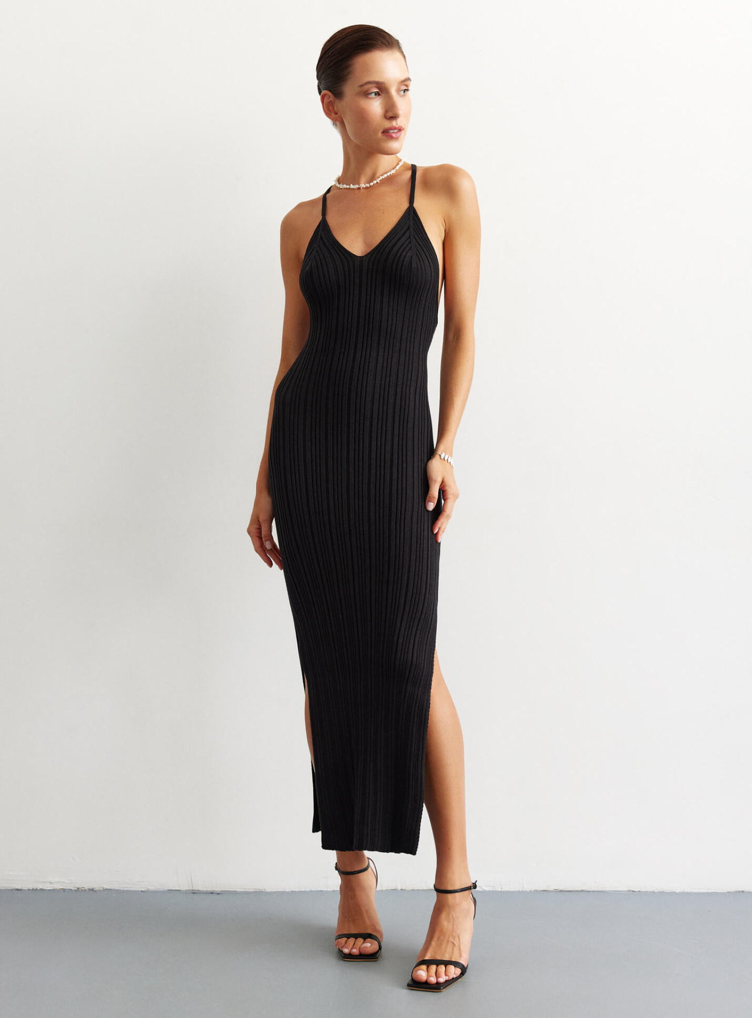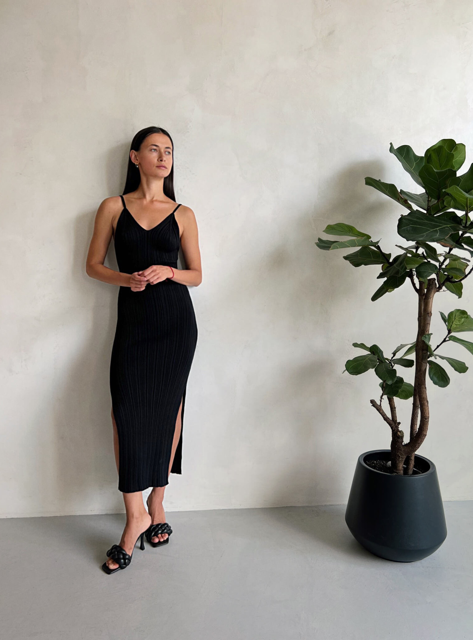 This pencil dress with V neckline easily transforms from a relaxed look into a luxurious outfit for the evening. For walks along the embankment or отдых in путешествии сочетайте его с сандалиями на плоской подошве и широкополой шляпой. А для вечернего променада можно сверху добавить рубашку. Чтобы превратить knit dresses with slits into an evening option, it is enough to add heeled sandals and a minimalist clutch.