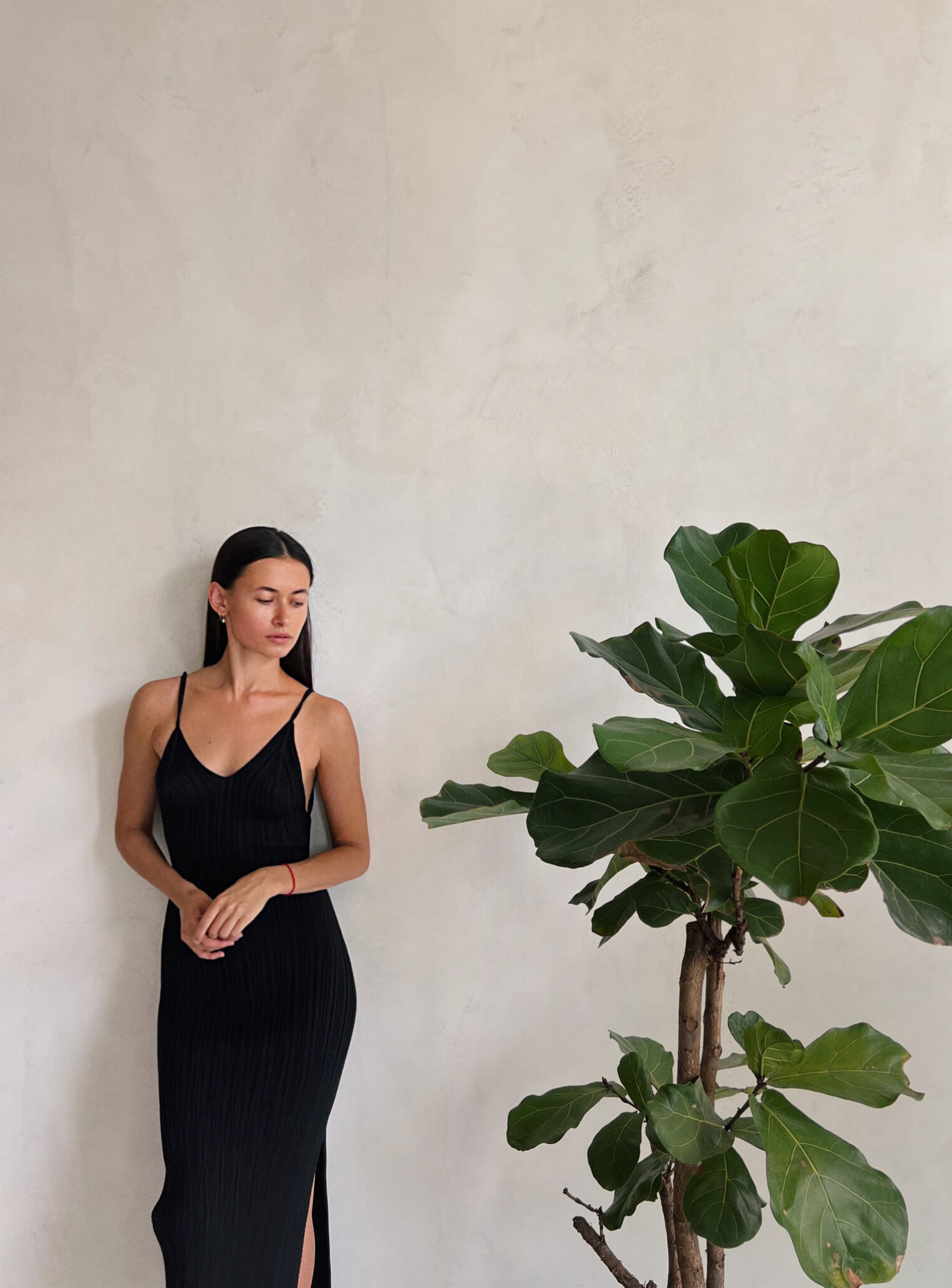 Long dress from 25 Union with thin straps places the main emphasis on the fragility of the shoulders and the line of the spine. This creates a mesmerizing evening silhouette. Summer dresses with straps tightly fit the figure and make it visually slimmer. A small slit at the top emphasizes the décolleté area, and at the bottom – elongates the legs and lengthens the silhouette.