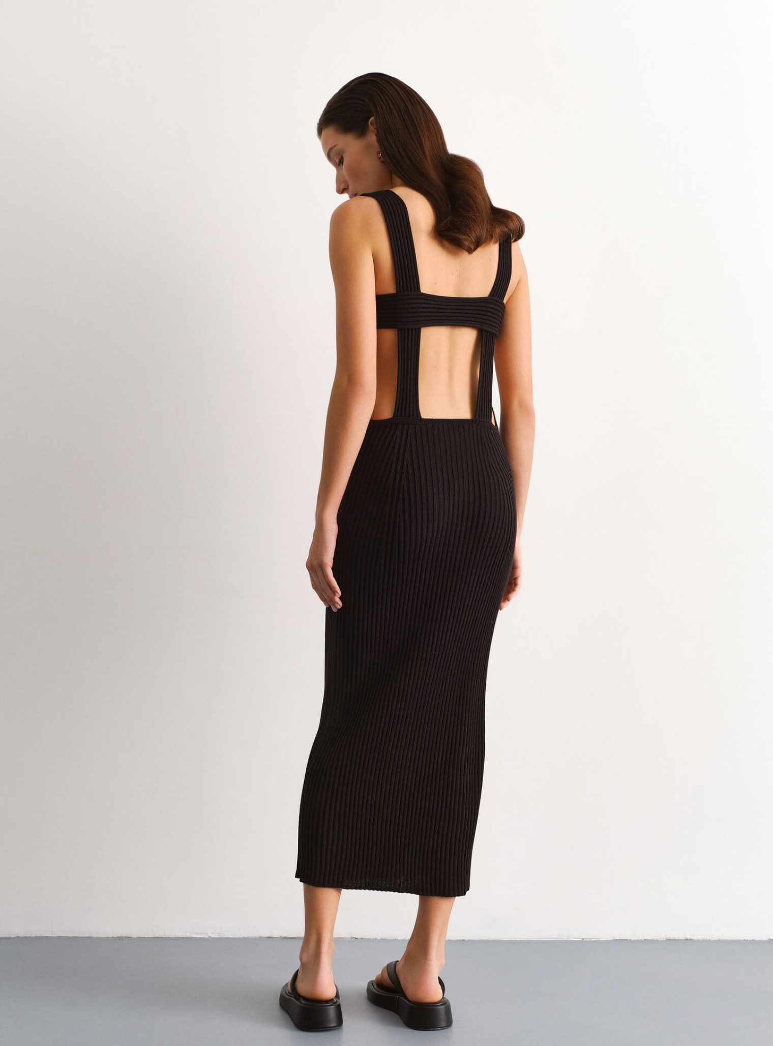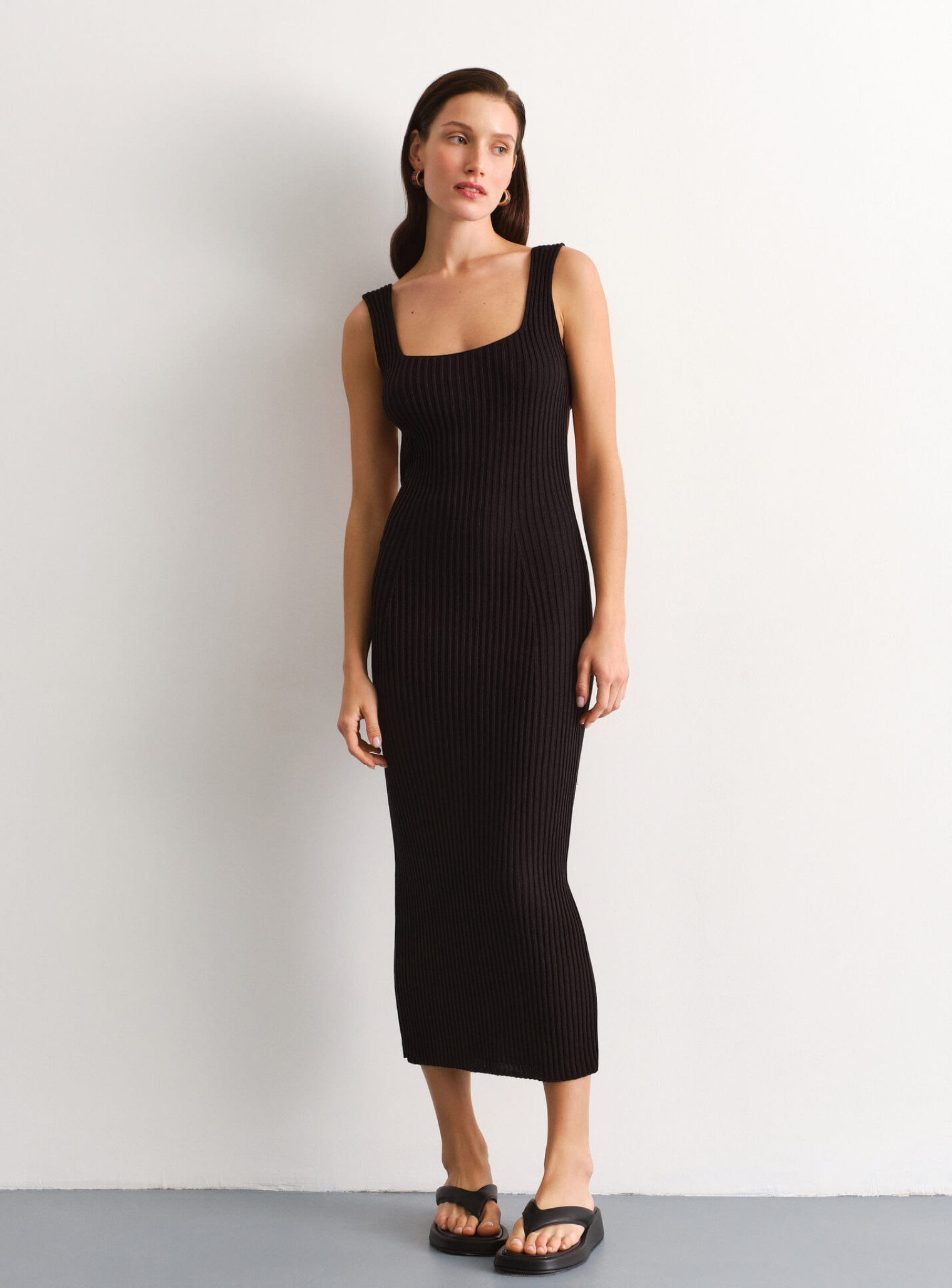 If you are looking for which buy dresses square neckline with an open back, this model will suit you perfectly. It is made of soft and pleasant knitwear, based on natural cotton. The fabric gently fits the figure, and the black color slims and emphasizes the silhouette. The décolleté is designed with a square neckline that suits almost everyone. But this model should be worn with caution by women with a rectangular body type.