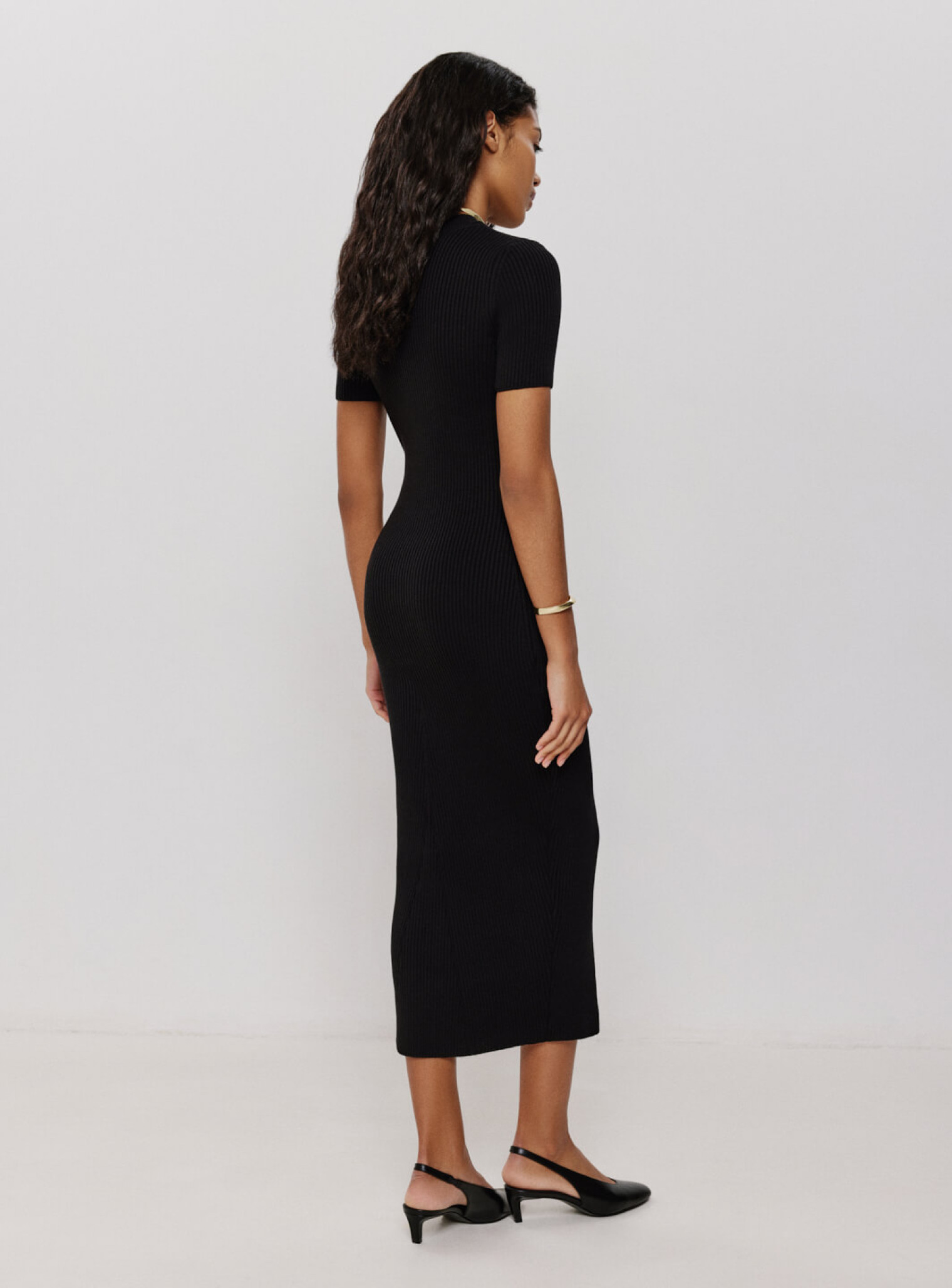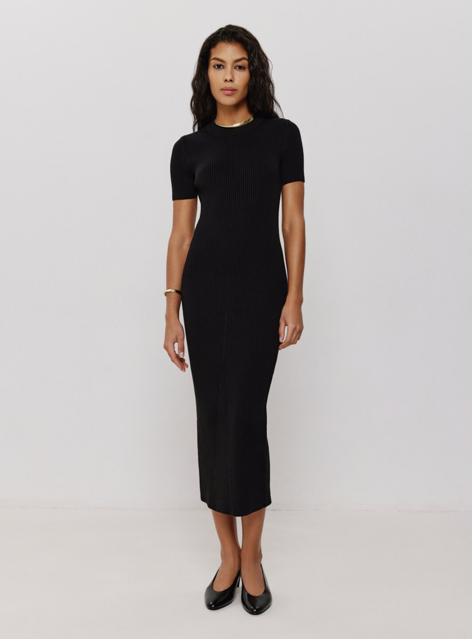 Midi dress in textured elastic knit with a decorative embroidered wedge-shaped element at the hem of the dress. A basic model of a dress that smoothly fits the figure and allows you to wear the image both for everyday life and for special events, changing the styling with the help of accessories.