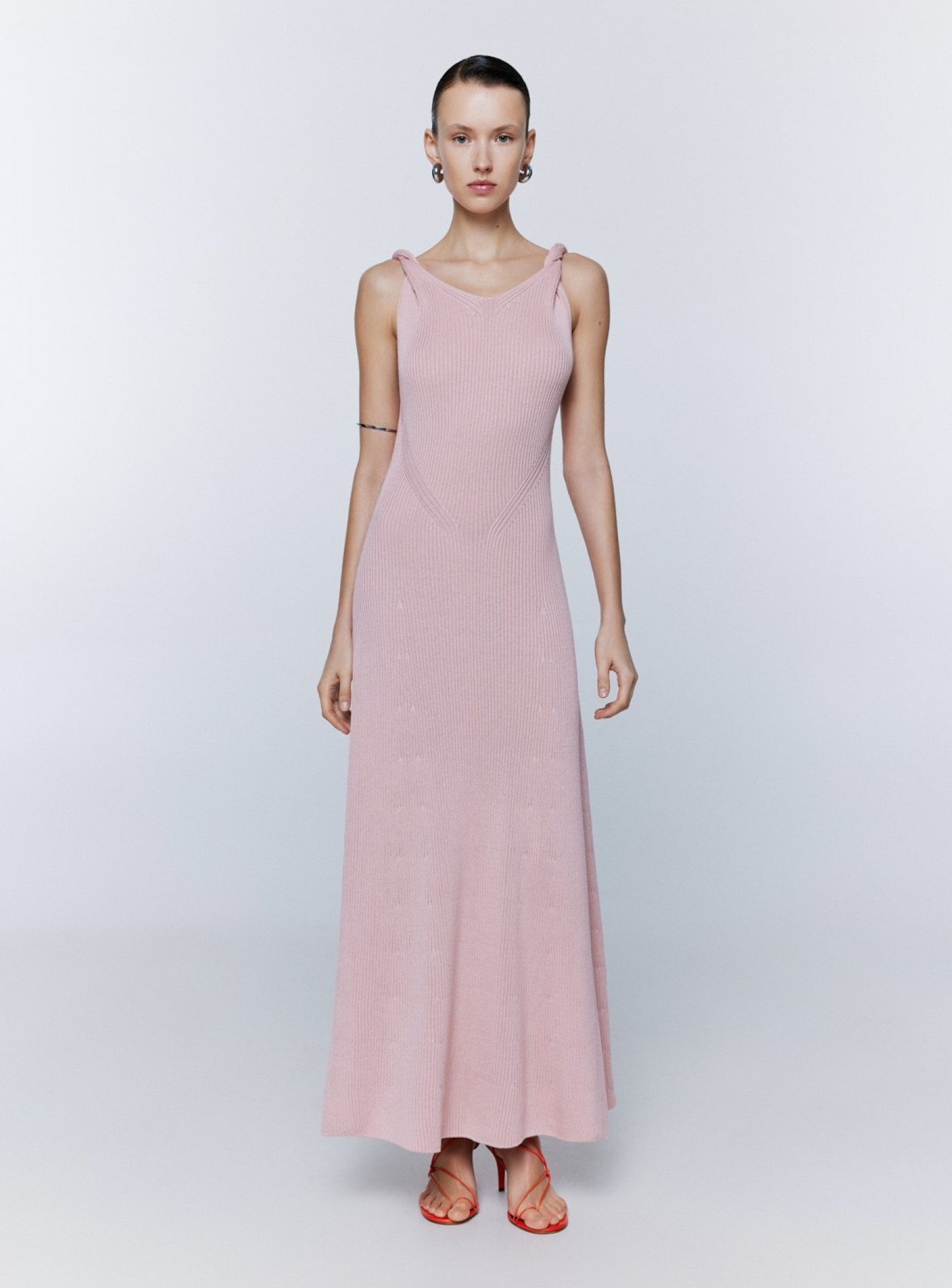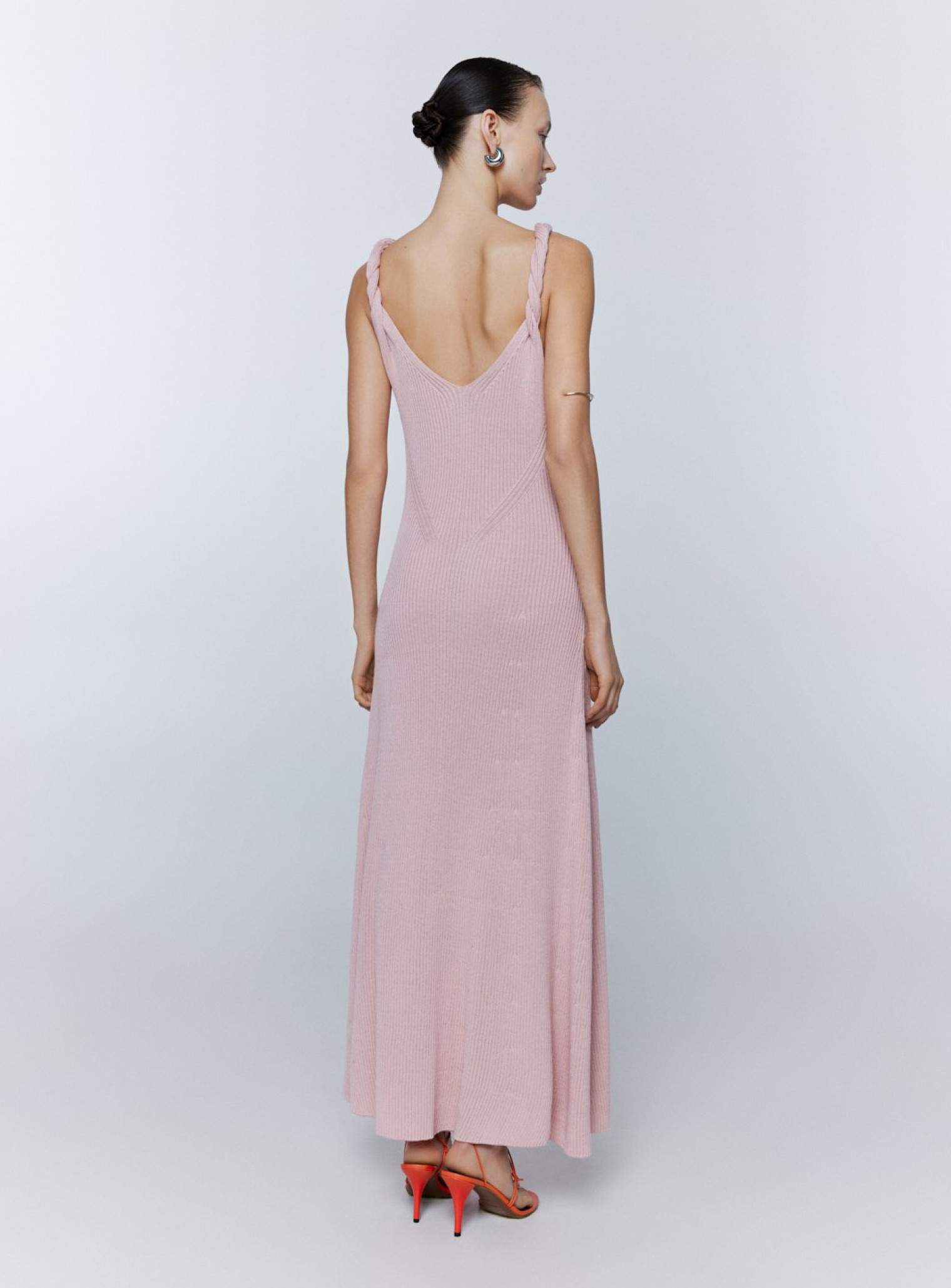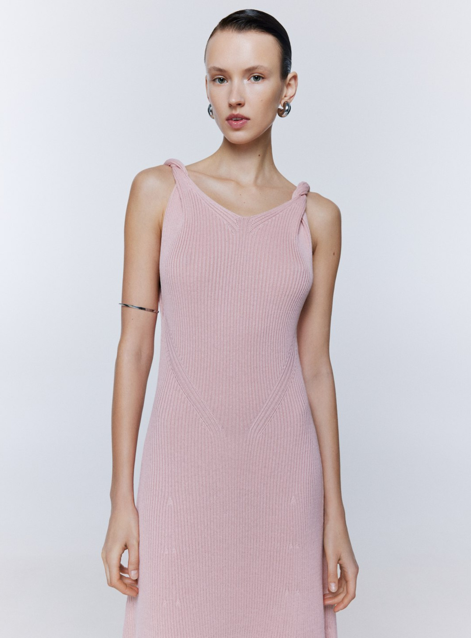 Midi-length dresses with a triangular neckline that transitions into straps, decorated with interweaving. Made of elastic knitwear, it is knitted using a special weaving technology that fits the silhouette, smoothly expanding, forming beautiful lines on the hem of the dress. Available to order in two lengths. A dress from the premium line of evening wear, created for special moments and events.