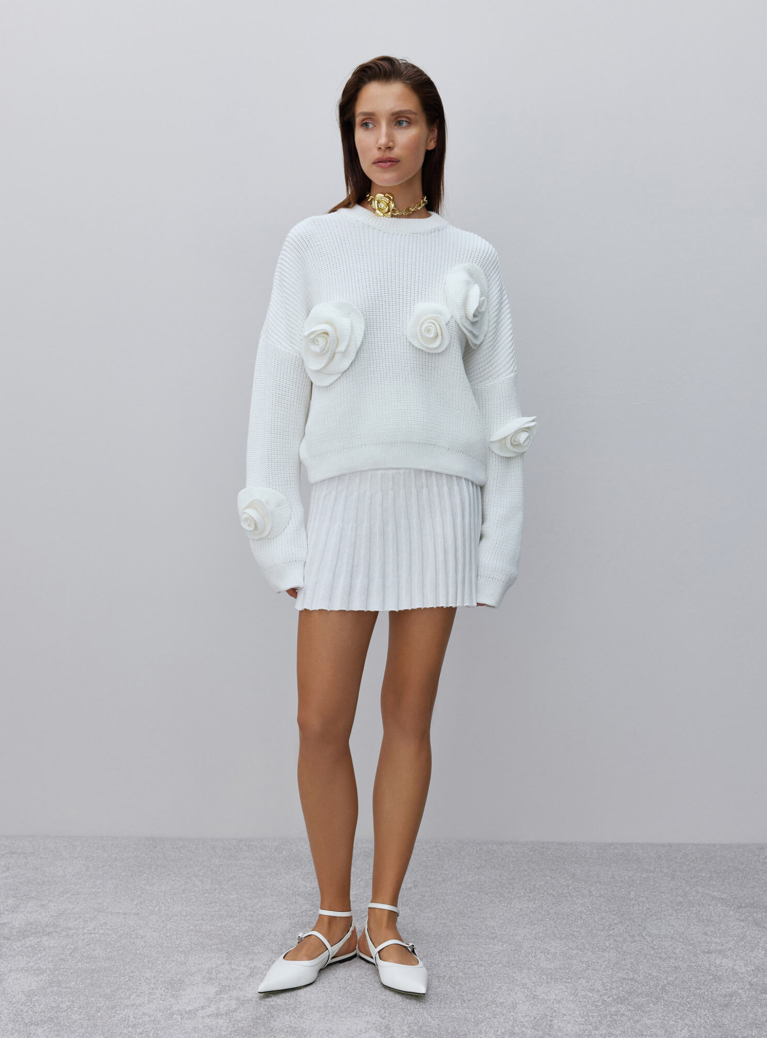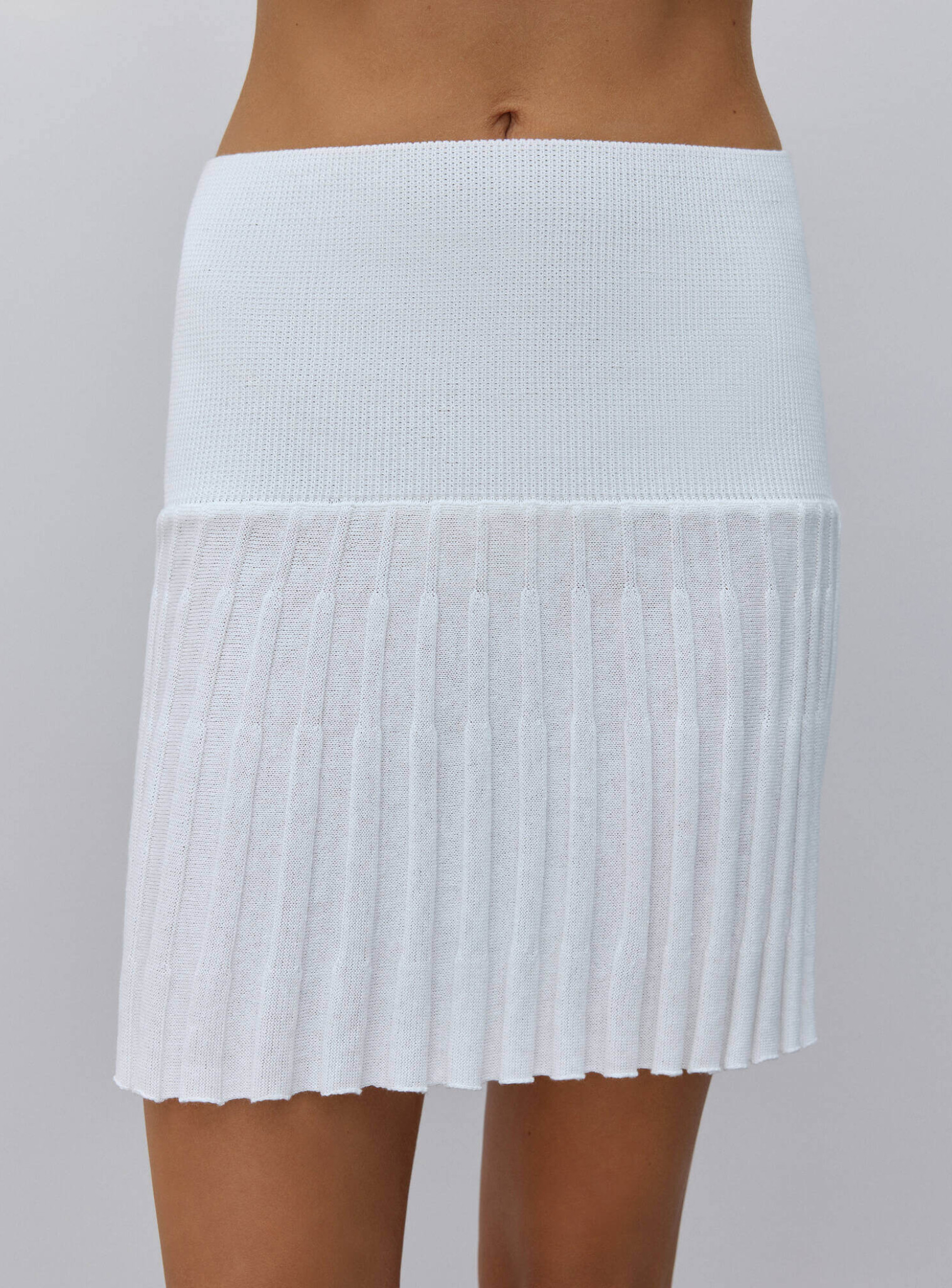 A mini-length skirt that has a fine and delicate pleated weave that moves beautifully as you walk. The top of the skirt is a wide, dense elastic band stitched with spandex, which has the supporting effect of a corset. The cut of the skirt allows you to wear it on the waist, or lower it to the hips, changing the stylization of the image. It is combined with a top in an elastic band.