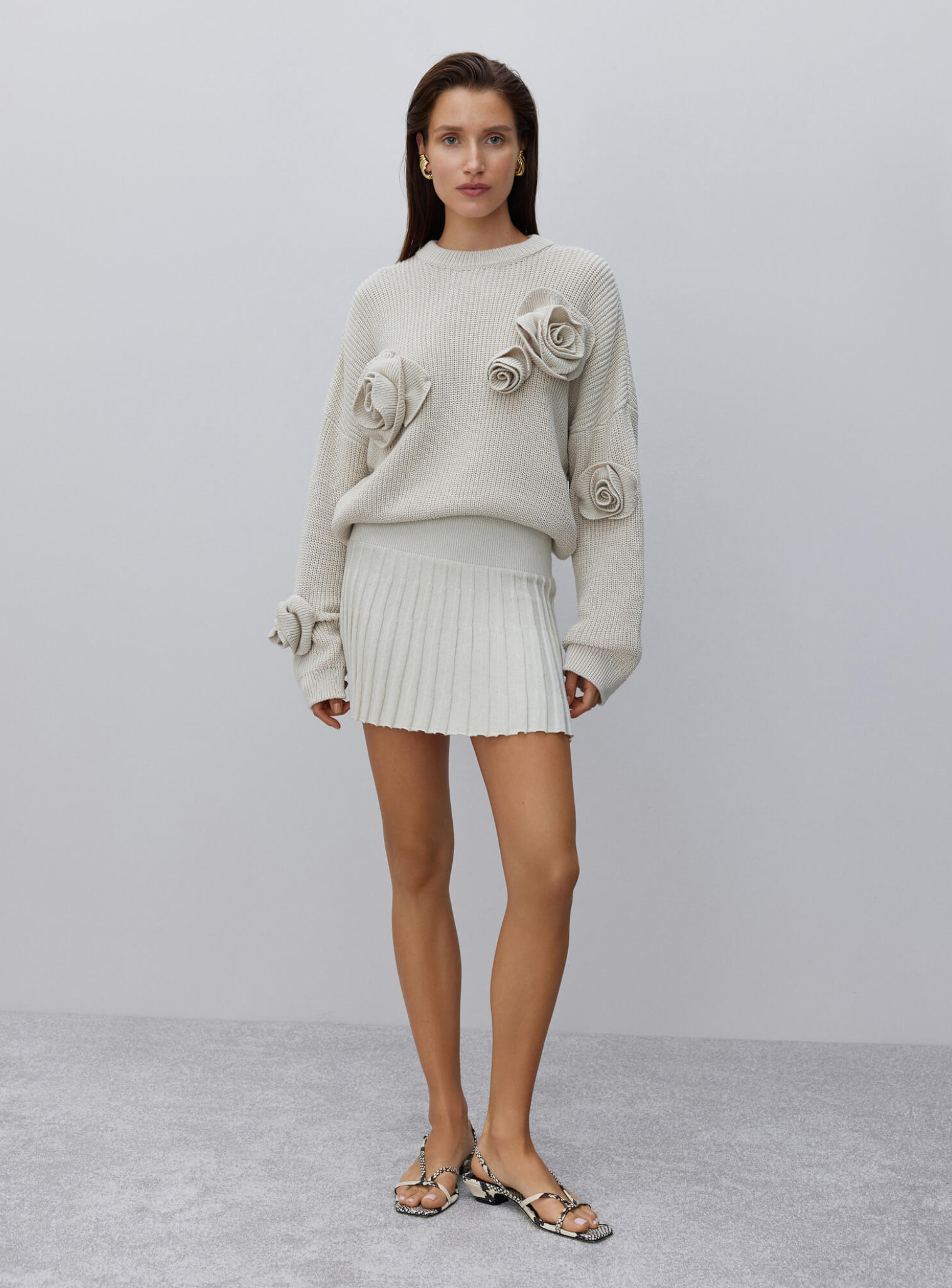 The loose-fitting sweater is decorated with painstakingly hand-picked roses of various sizes. Crafted from a delicate yarn with a voluminous neckline and a dropped shoulder line. Top-stitched flowers decorate the sweater on the chest and sleeves, creating a romantic and feminine look with a pleated skirt. Accent product of the autumn collection that will add charm to a woman's wardrobe.