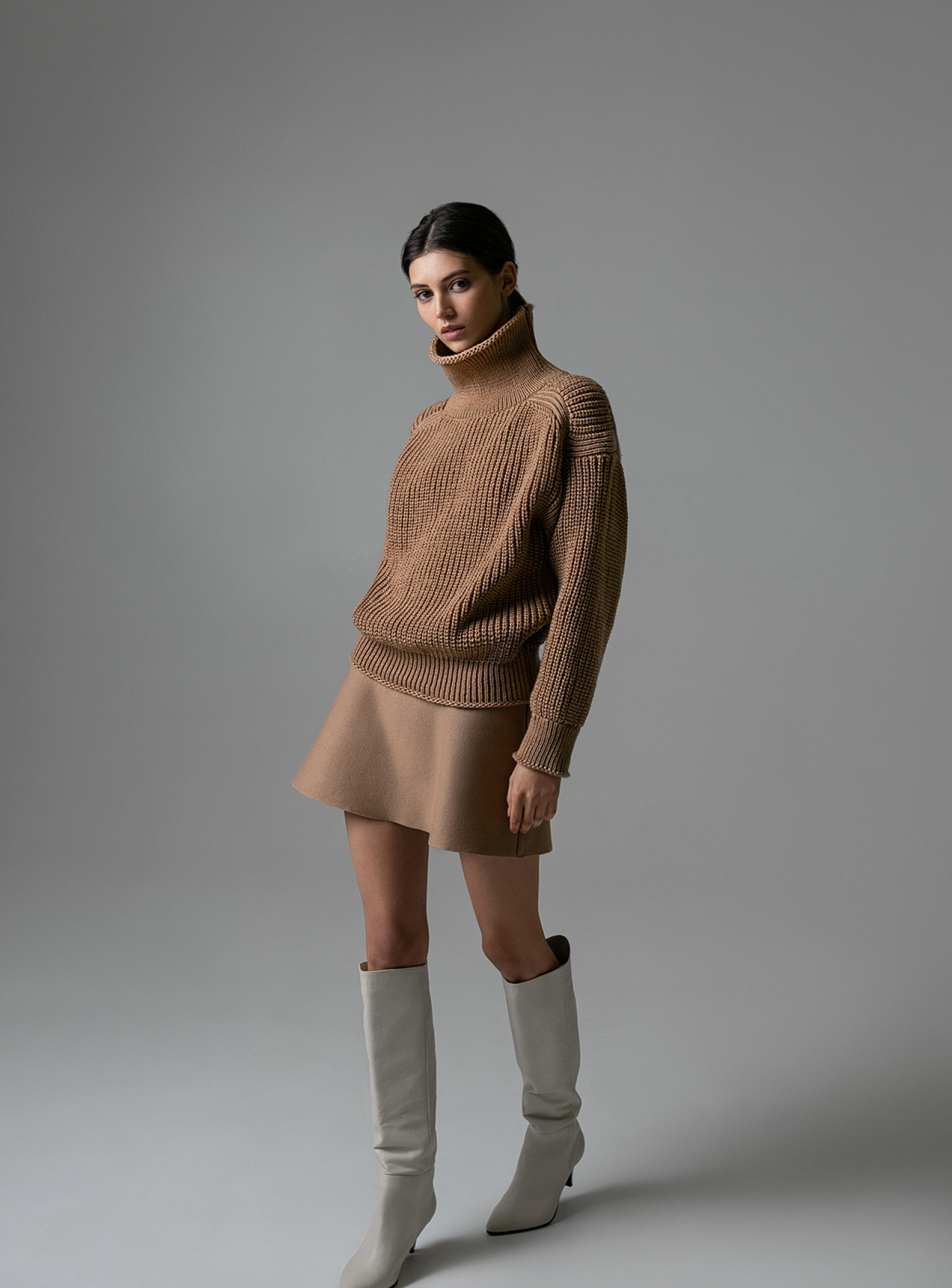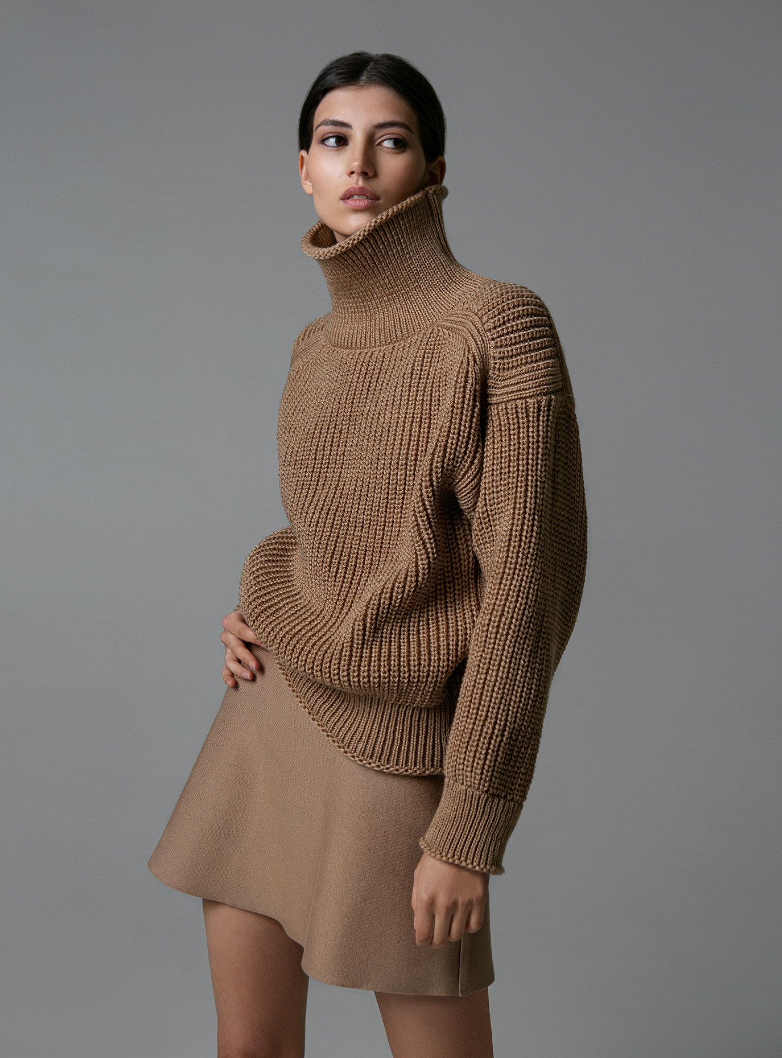 Sweater with a high neck, complex cut on the shoulders, oversize. Made of soft, warm yarn.
