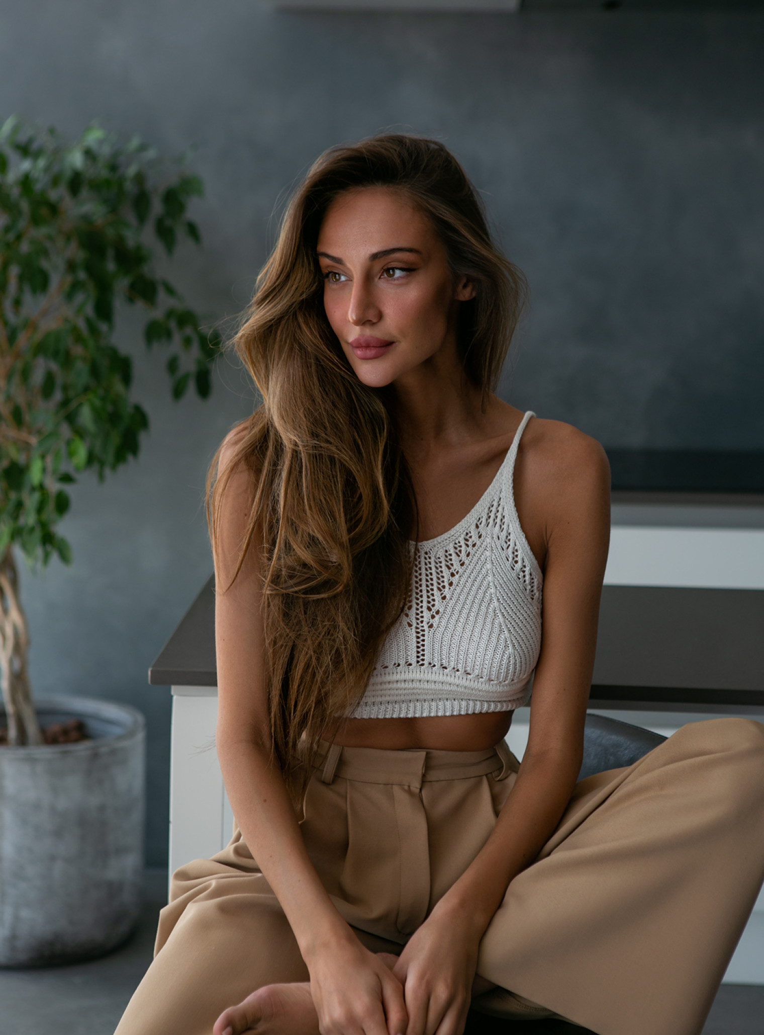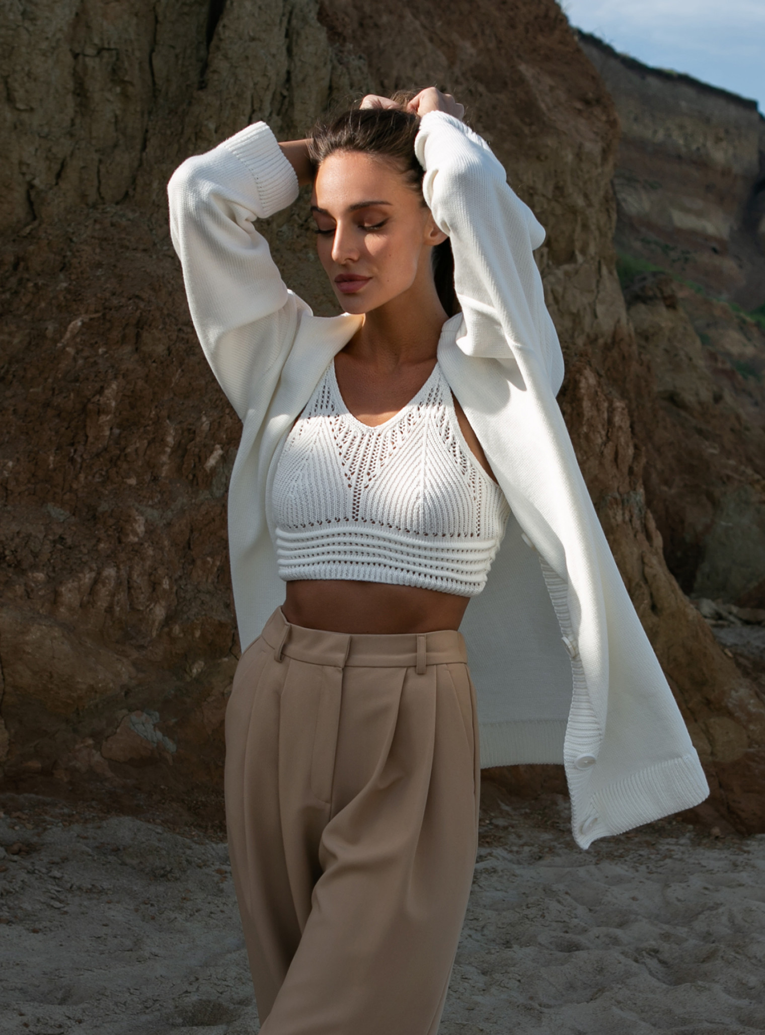 Airy openwork top in natural shades of nature. Soft natural cotton will make you feel comfortable and exquisitely beautiful on the hottest days.