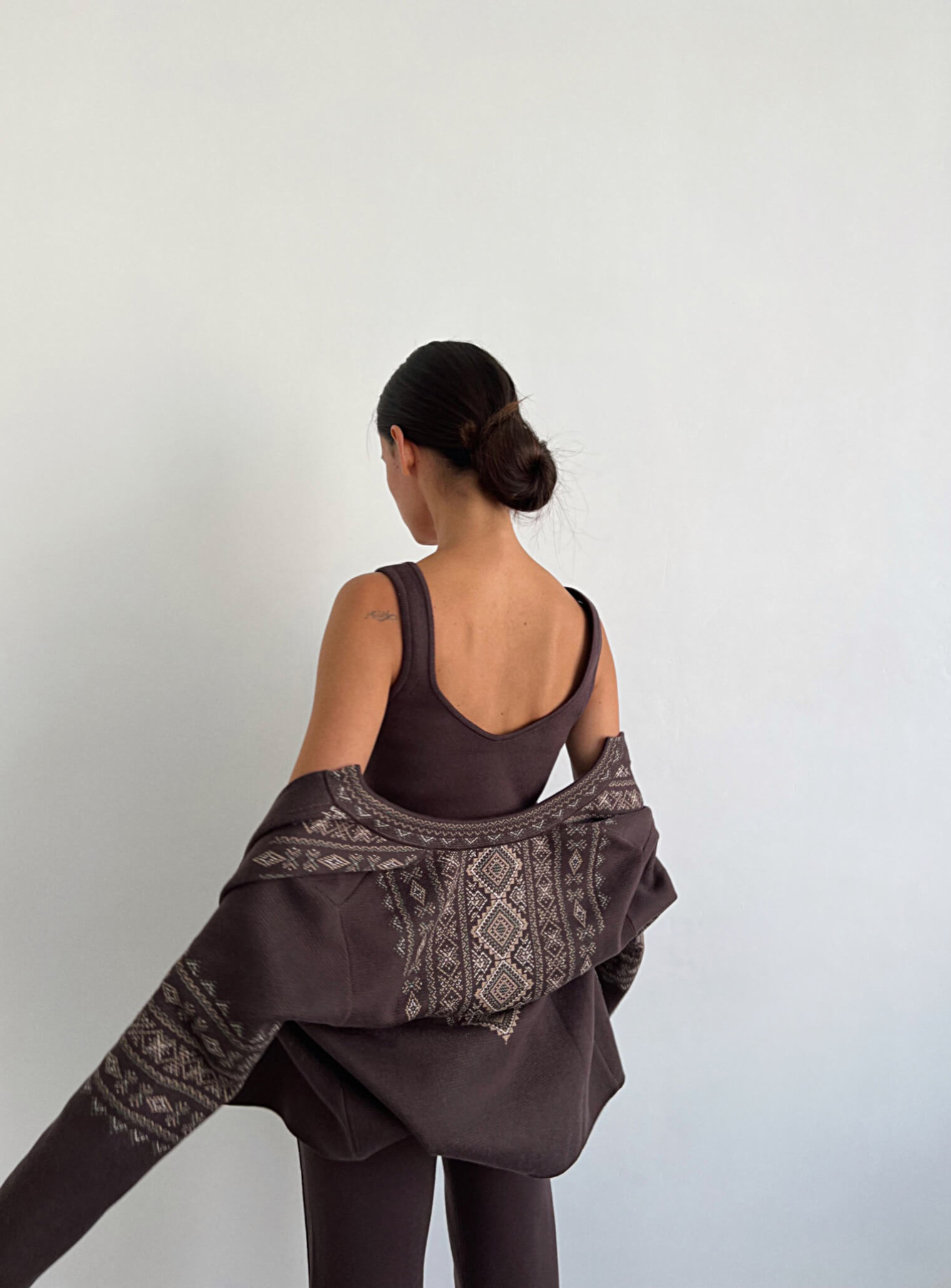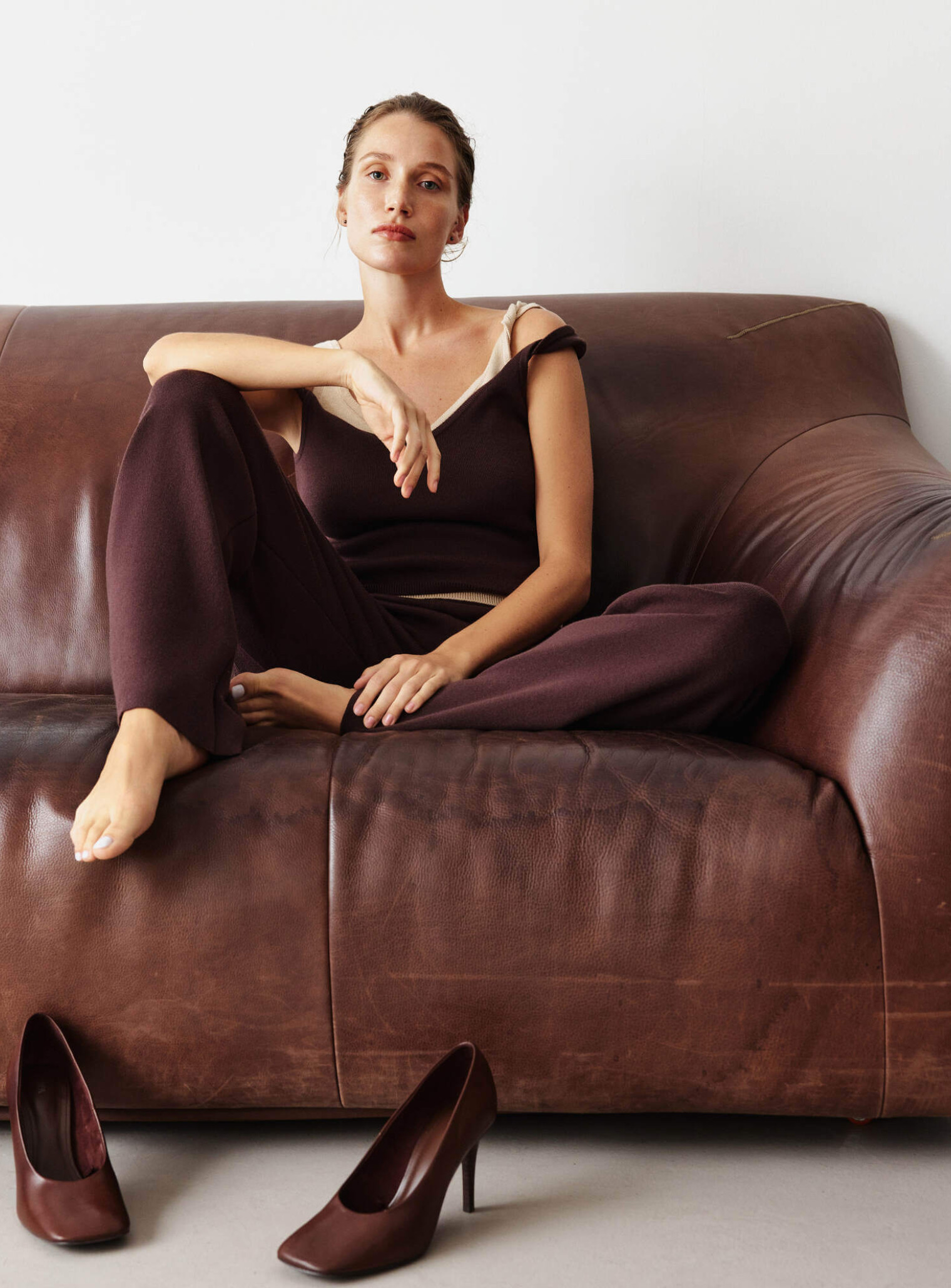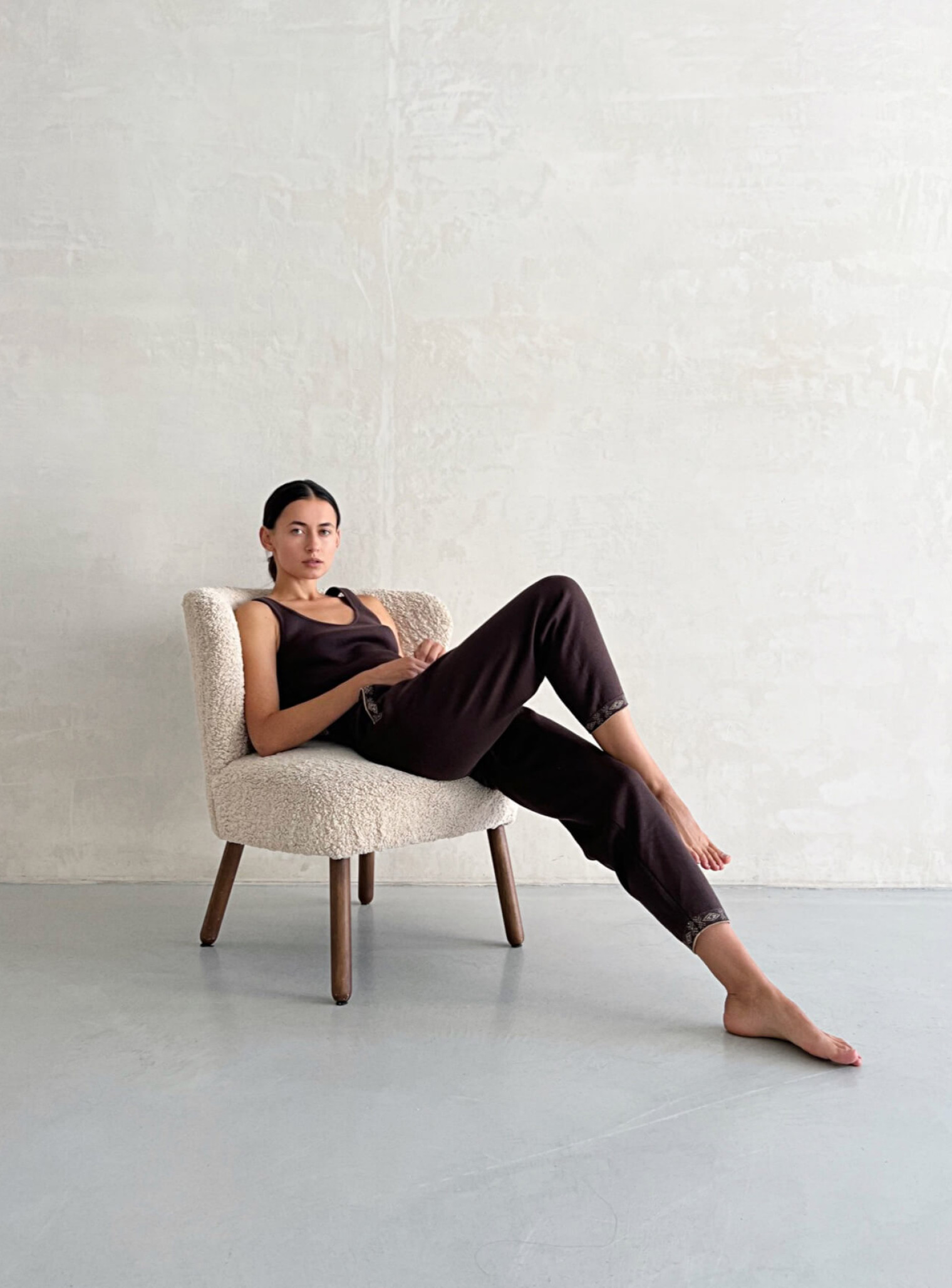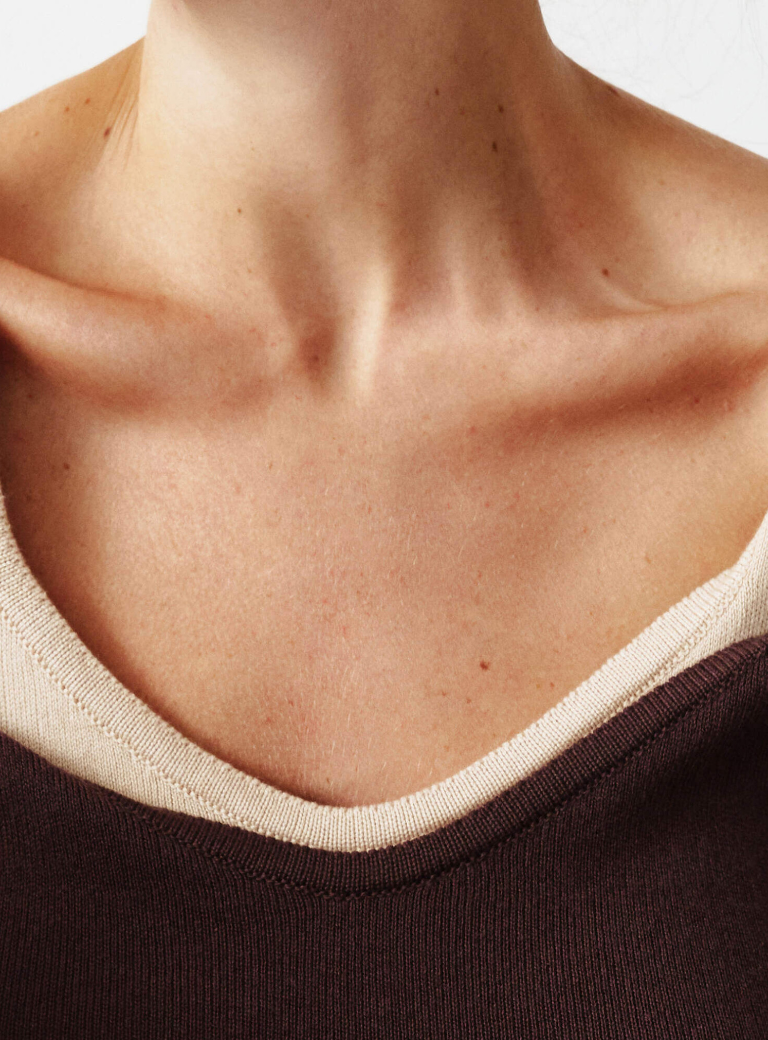 A basic top with a wide neckline on the chest and back, made of pleasant and gentle fabric. Perfectly complements the branded cardigan Power of generations, and combines with other images of the brand.