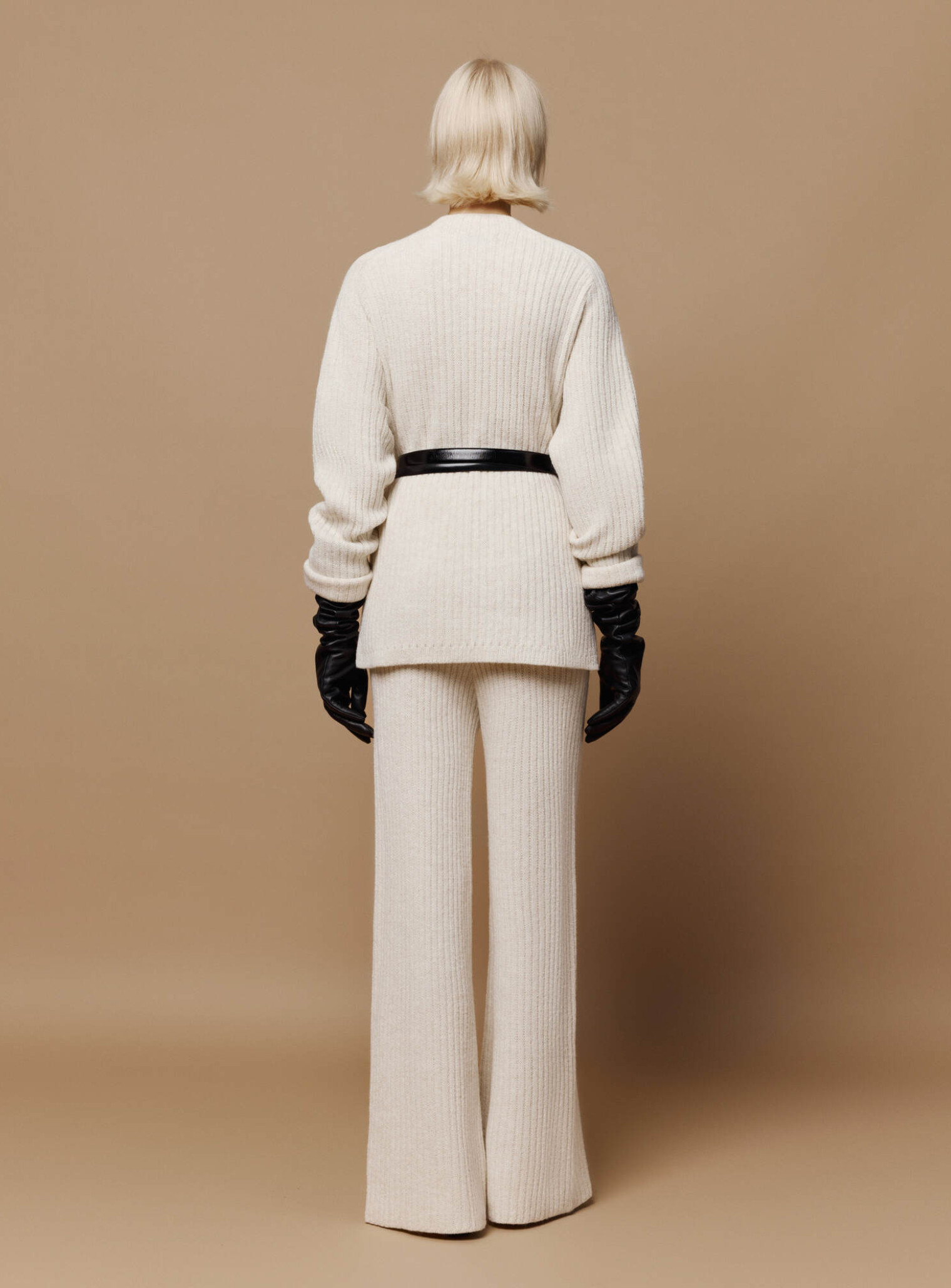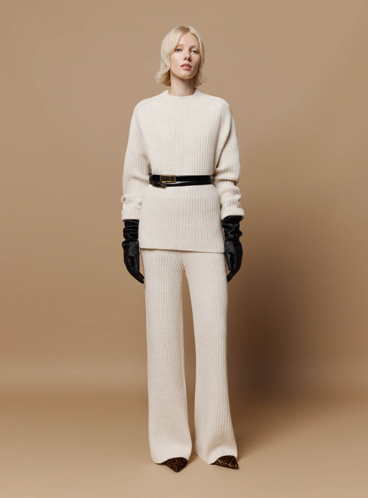 Брюки прямого кроя в рубчик, выполненные из теплой пряжи с добавлением шерсти. Брюки с высокой посадкой и мягкой резинкой на талии, что дарит комфорт. Сочетаются в комплект со свитером из фактурной вязки.