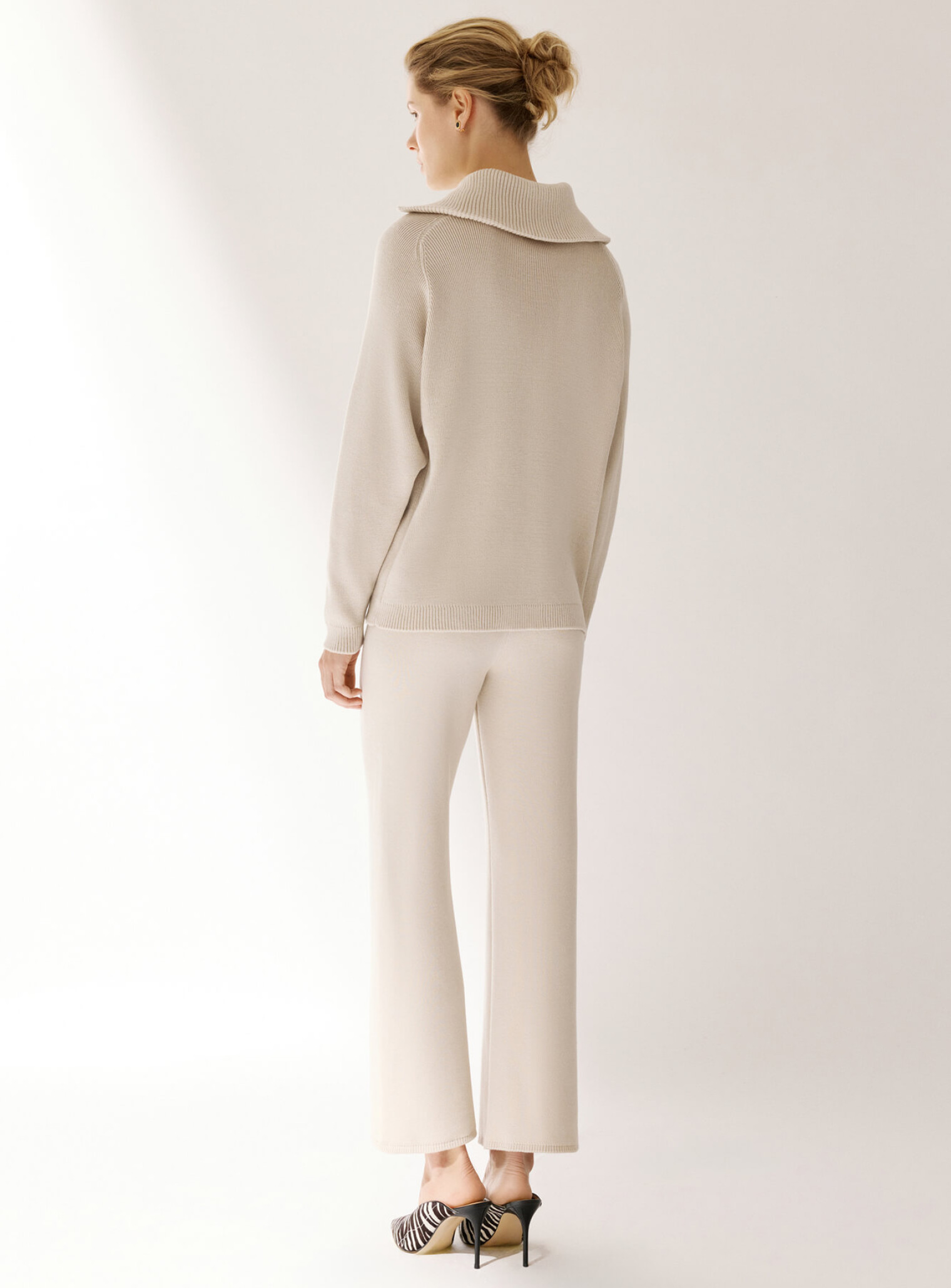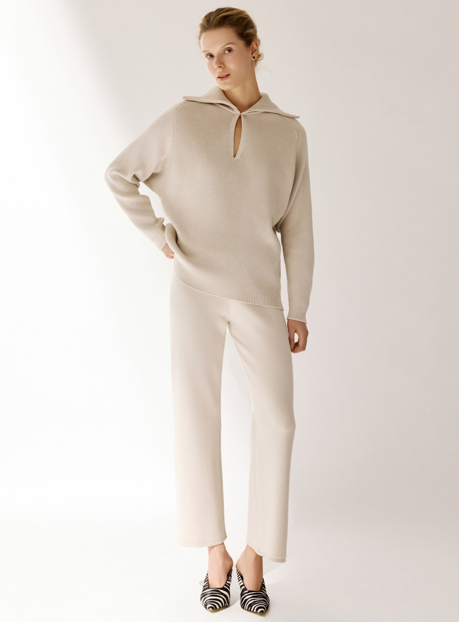 Джемпер поло с объемным двойным воротником и рукавом регланом, создающим плавную линию плеча. Воротник декорирован функциональной пуговицей в тон изделия, который позволяет носить его в собранном или более расслабленном виде. Выполнена из плотной пряжи, которая будет дарить комфорт и тепло. Сочетается в комплект с брюками бренда.