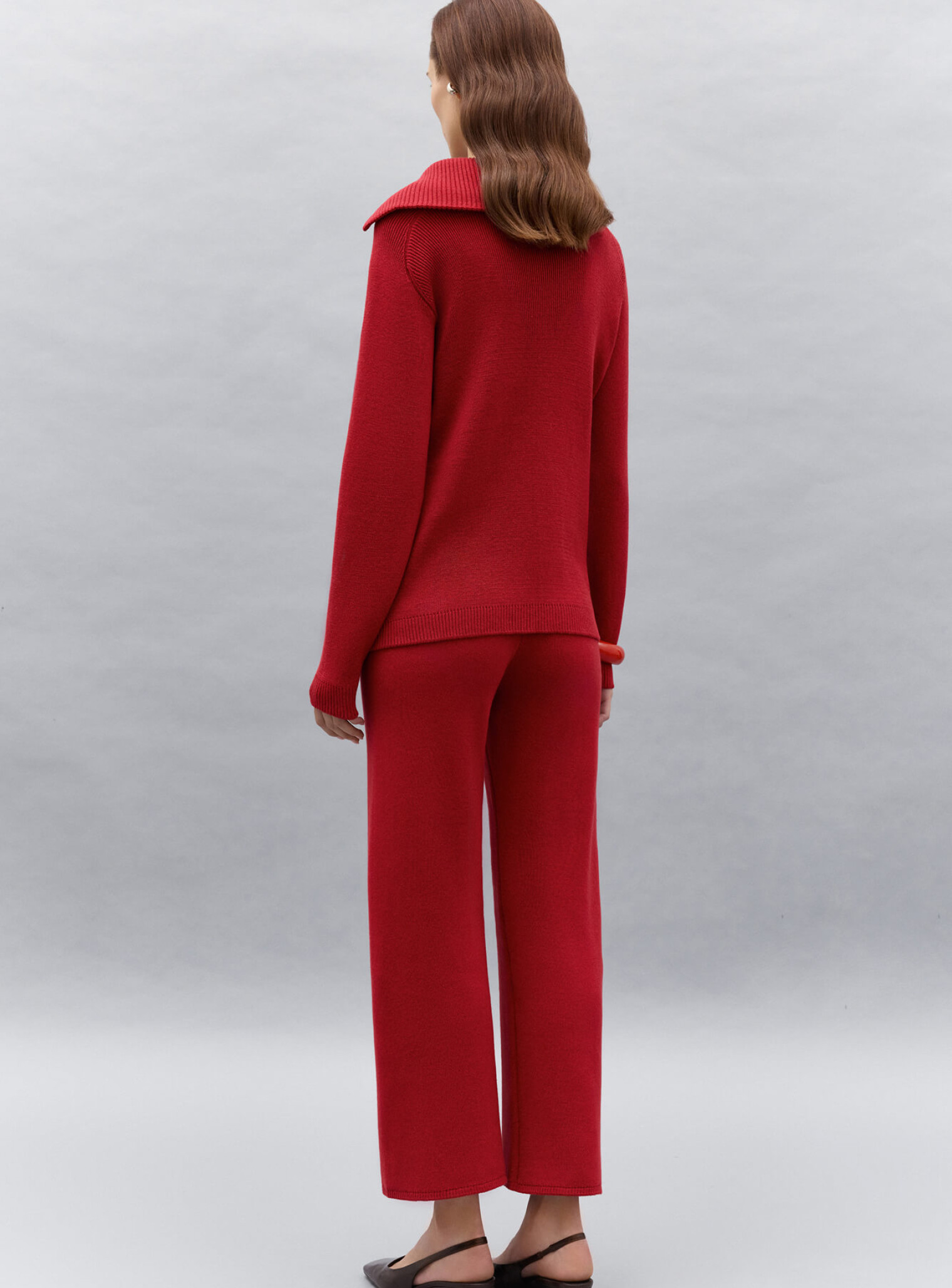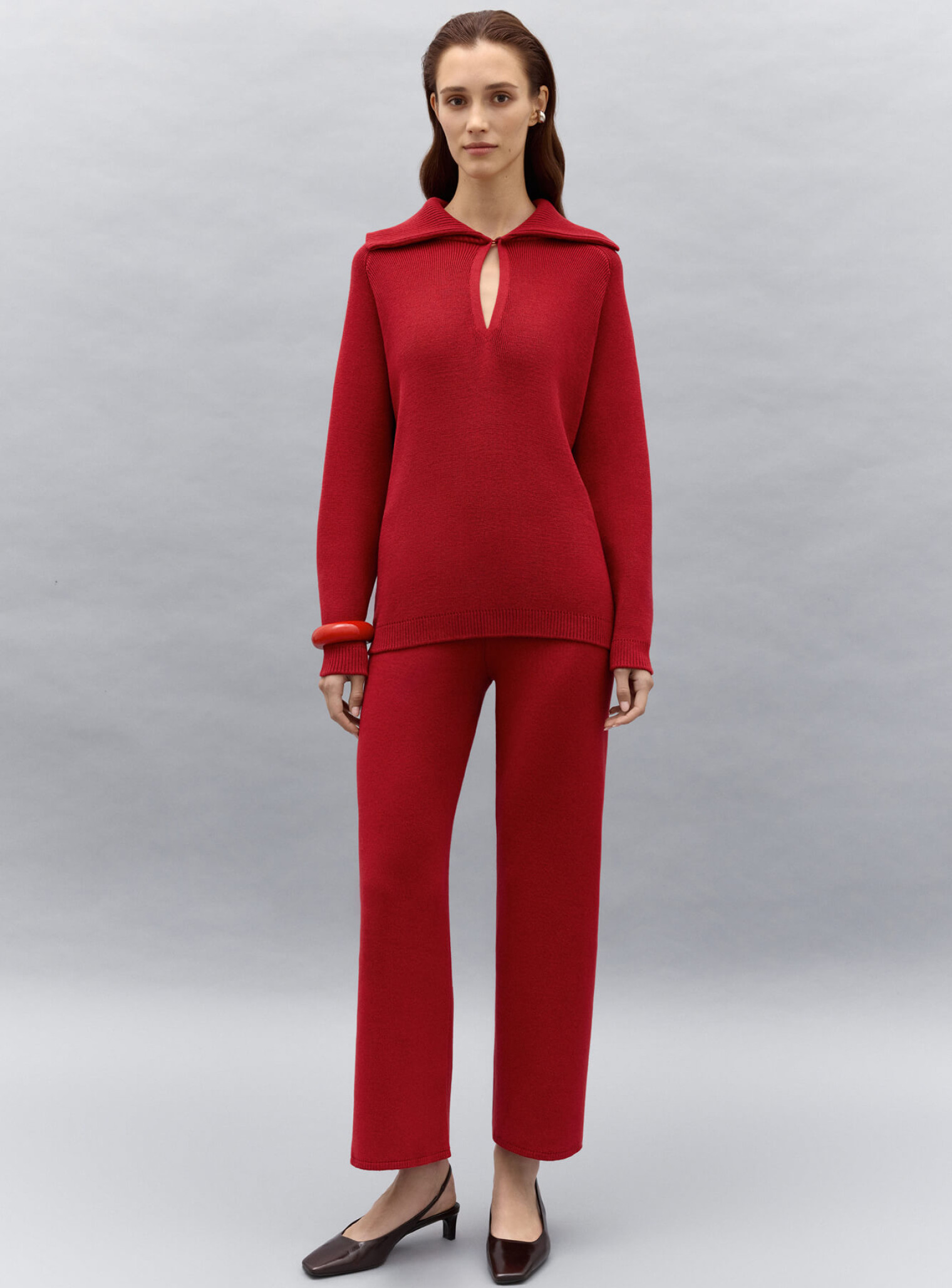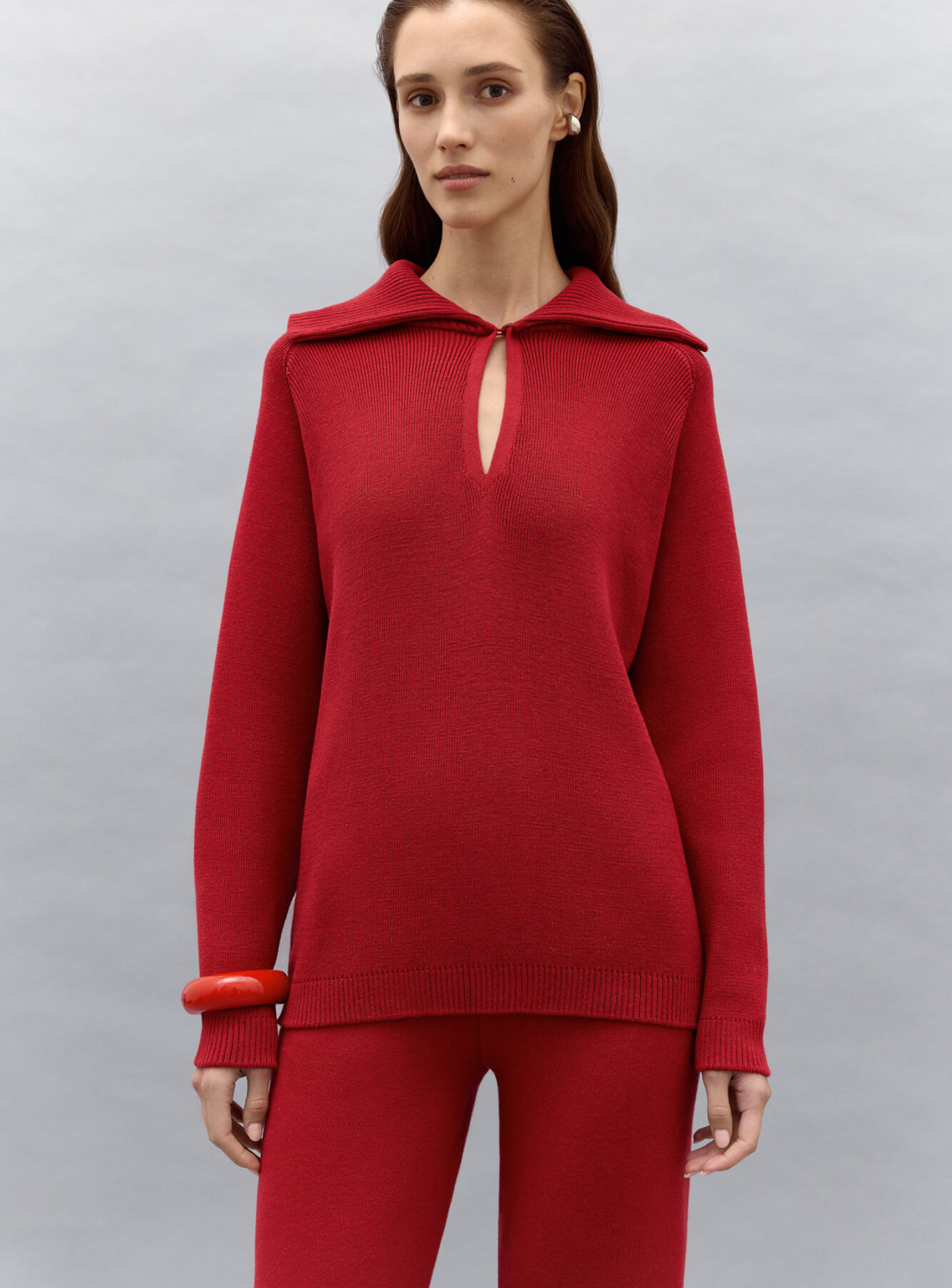 Джемпер поло с объемным двойным воротником и рукавом регланом, создающим плавную линию плеча. Воротник декорирован функциональной пуговицей в тон изделия, который позволяет носить его в собранном или более расслабленном виде. Выполнена из плотной пряжи, которая будет дарить комфорт и тепло. Сочетается в комплект с брюками бренда.