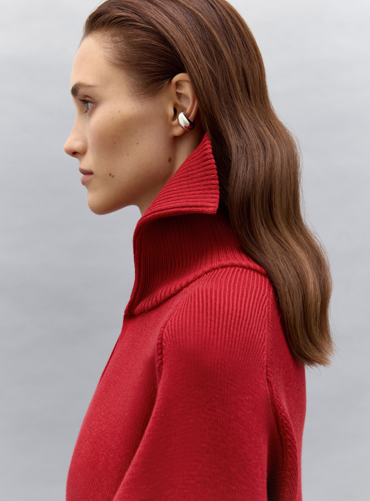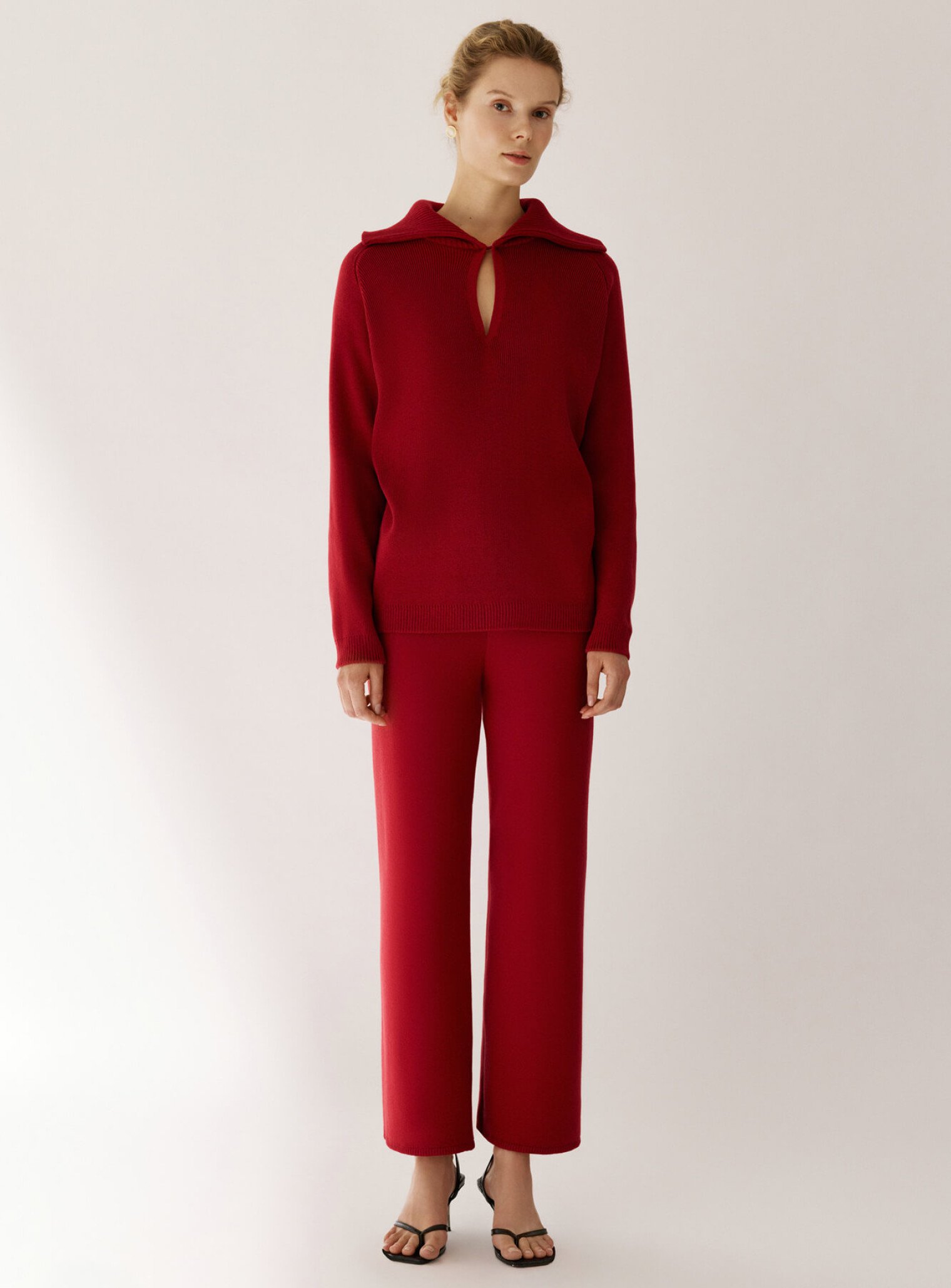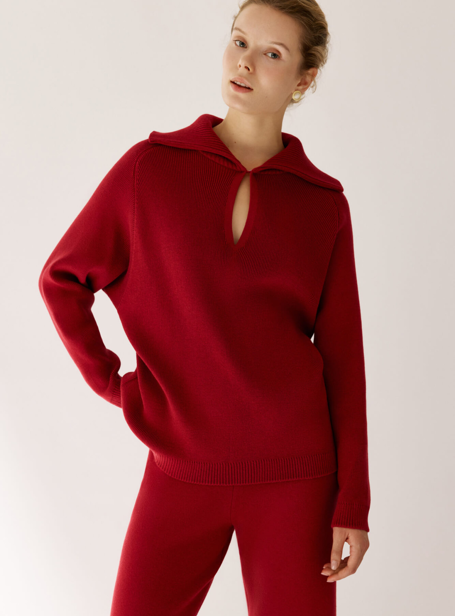 Джемпер поло с объемным двойным воротником и рукавом регланом, создающим плавную линию плеча. Воротник декорирован функциональной пуговицей в тон изделия, который позволяет носить его в собранном или более расслабленном виде. Выполнена из плотной пряжи, которая будет дарить комфорт и тепло. Сочетается в комплект с брюками бренда.
