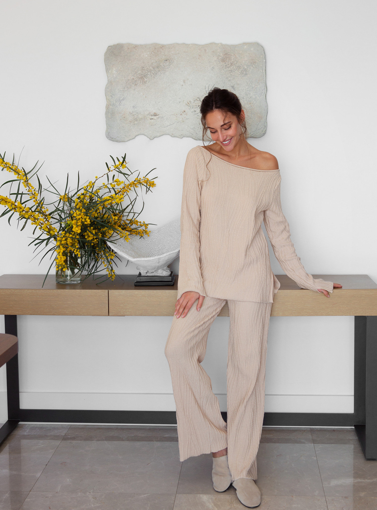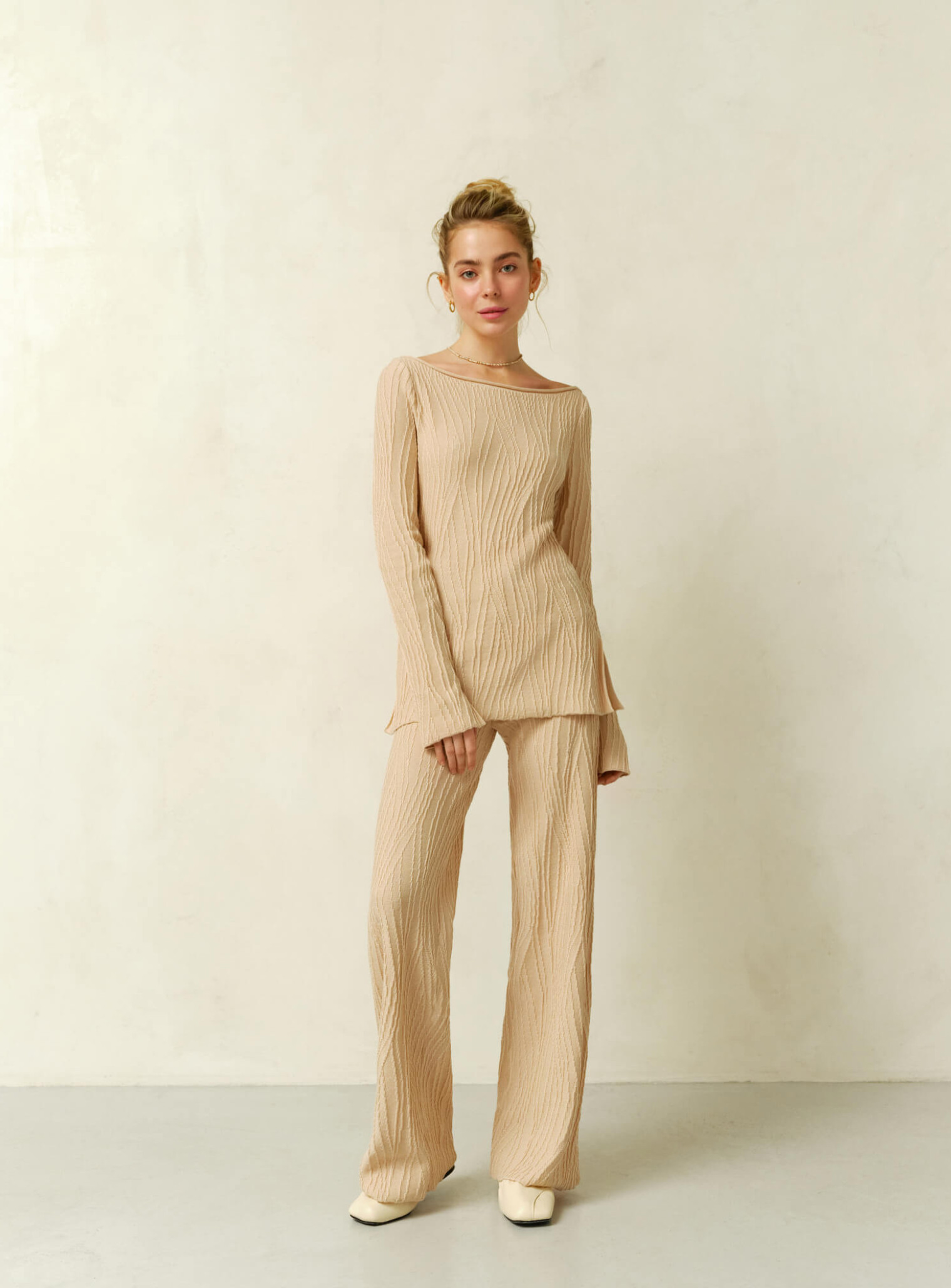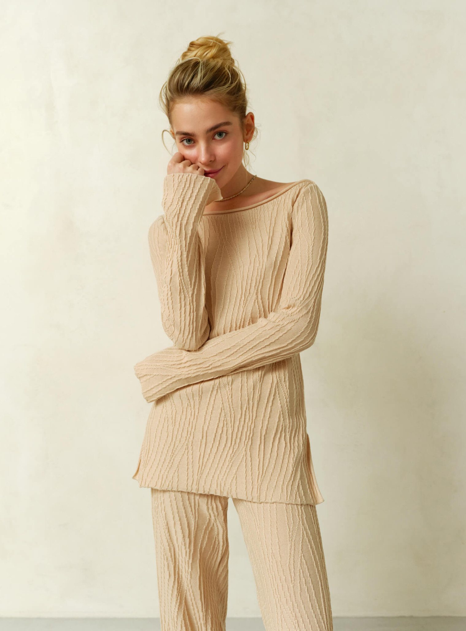 Нежный джемпер с деликатным узором горизонтальных линий, придающих образу романтического шарма. Создает красивый силуэт и извлекает образ за счет удлиненного рукава, формы выреза и длины заканчивающегося на середине бедра джемпера. Сочетается в костюме с брюками с фактурным узором.