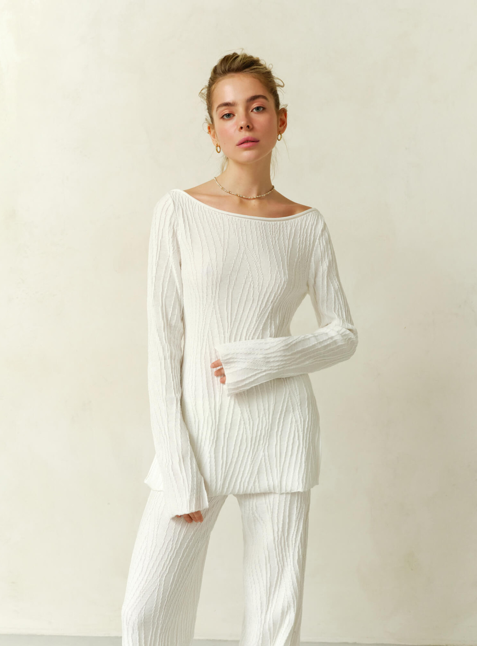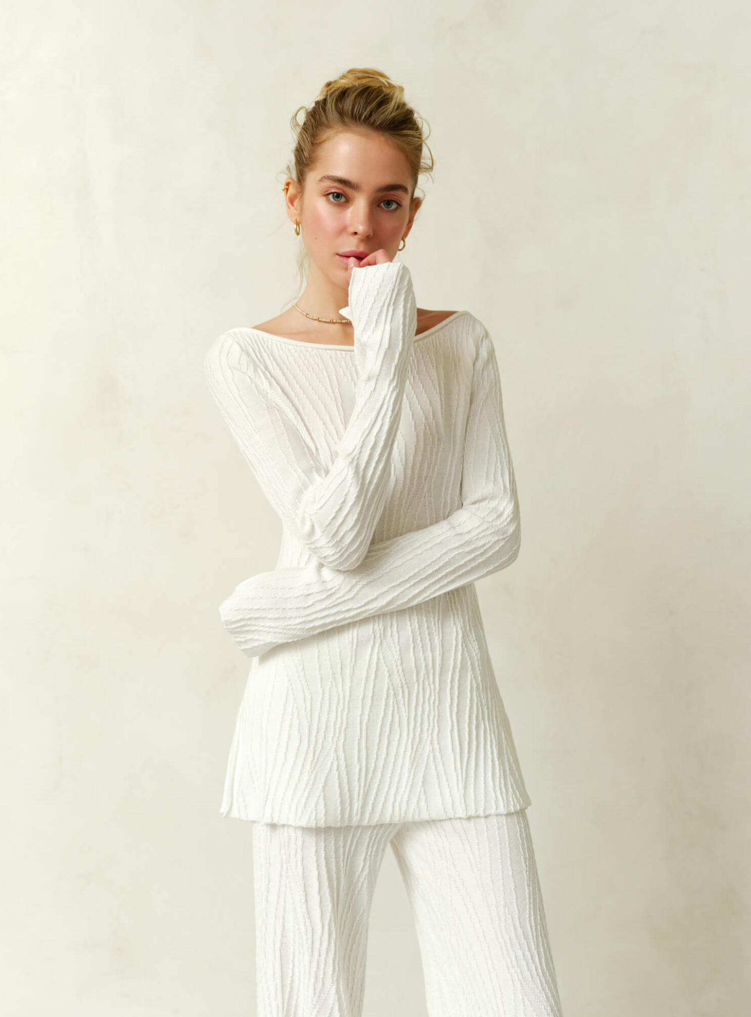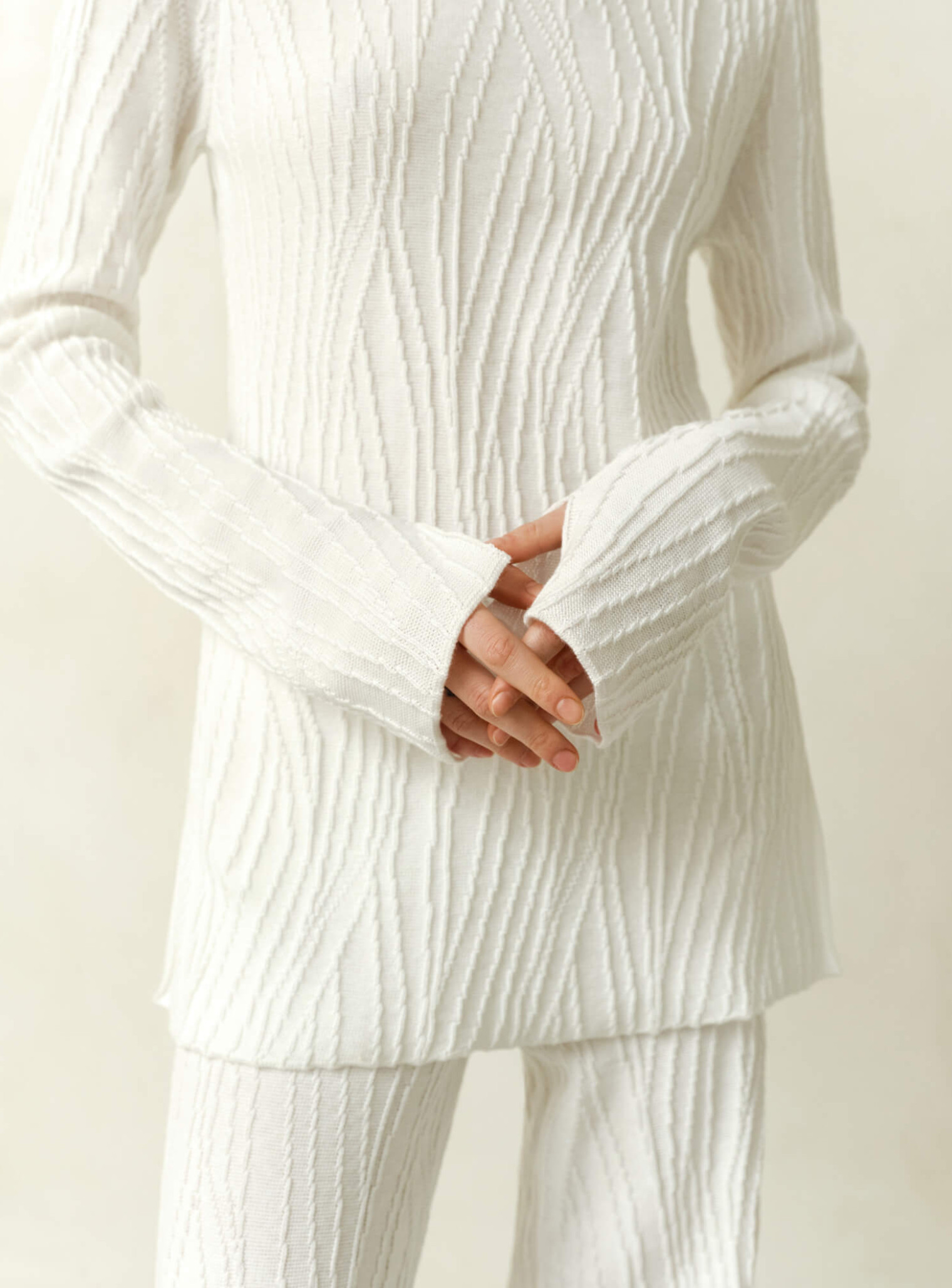 Нежный джемпер с деликатным узором горизонтальных линий, придающих образу романтического шарма. Создает красивый силуэт и извлекает образ за счет удлиненного рукава, формы выреза и длины заканчивающегося на середине бедра джемпера. Сочетается в костюме с брюками с фактурным узором.
