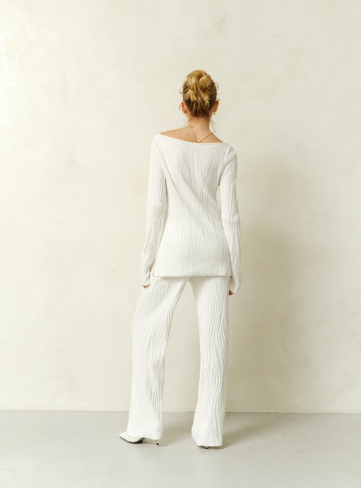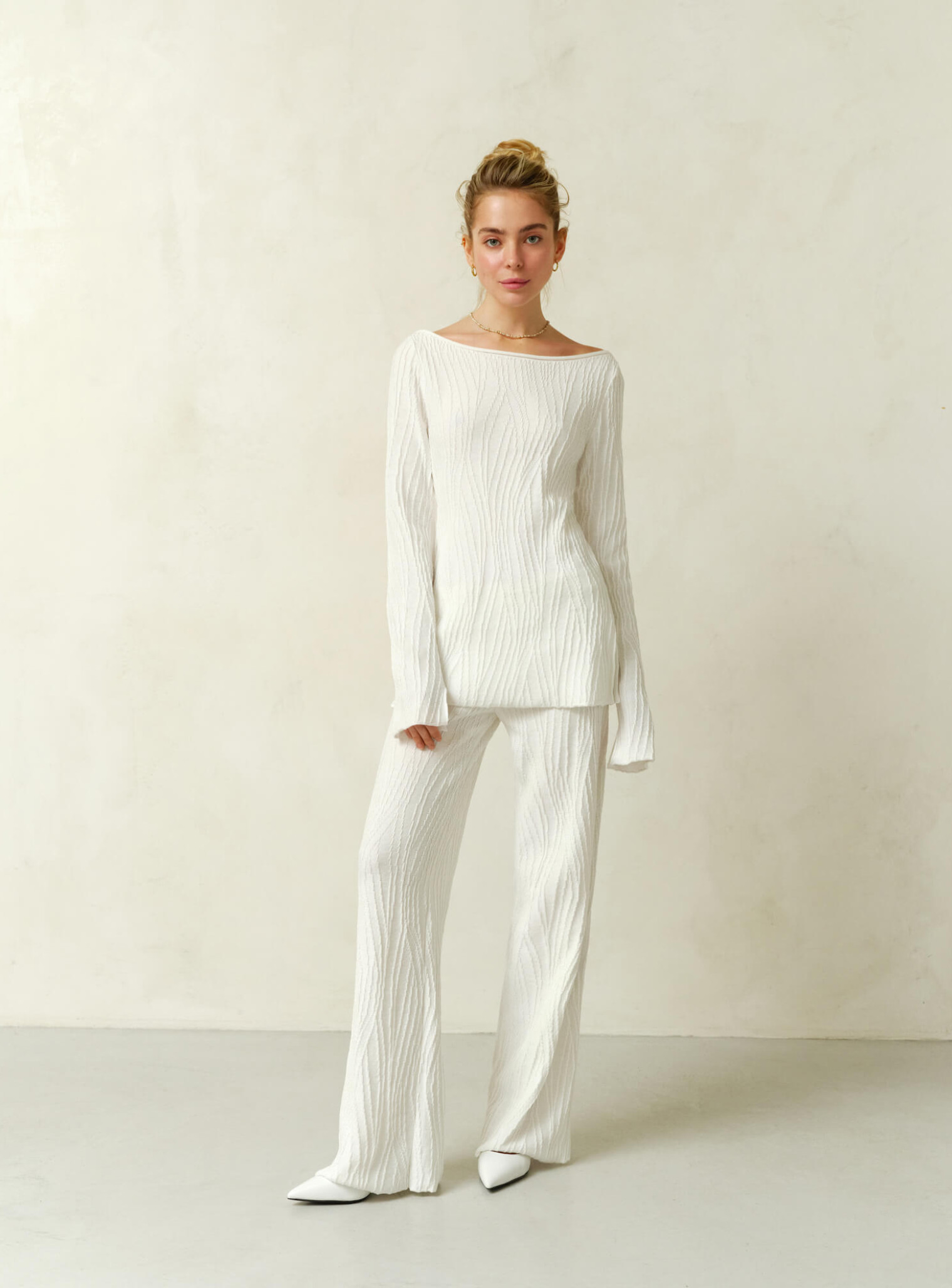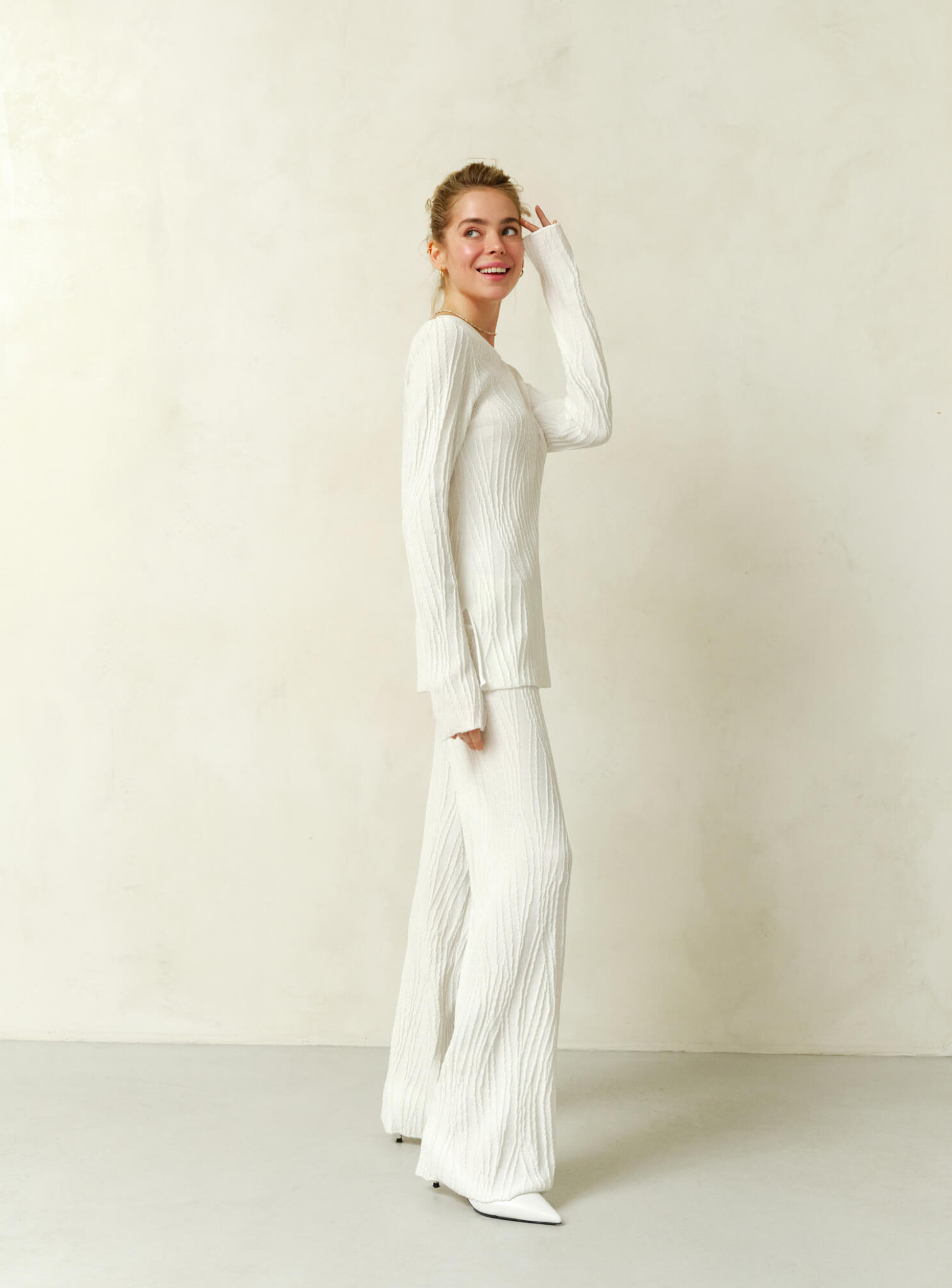 Нежный джемпер с деликатным узором горизонтальных линий, придающих образу романтического шарма. Создает красивый силуэт и извлекает образ за счет удлиненного рукава, формы выреза и длины заканчивающегося на середине бедра джемпера. Сочетается в костюме с брюками с фактурным узором.