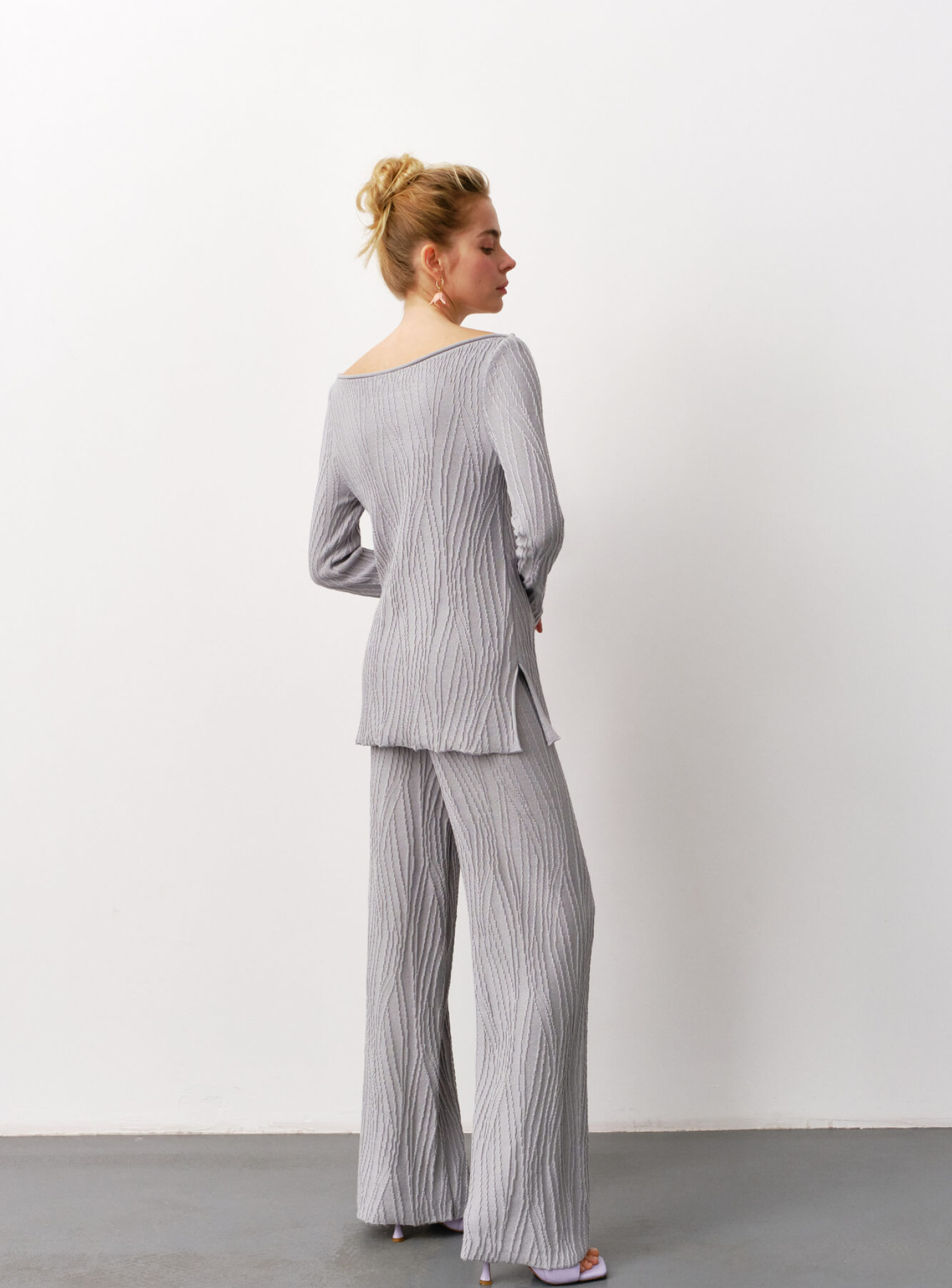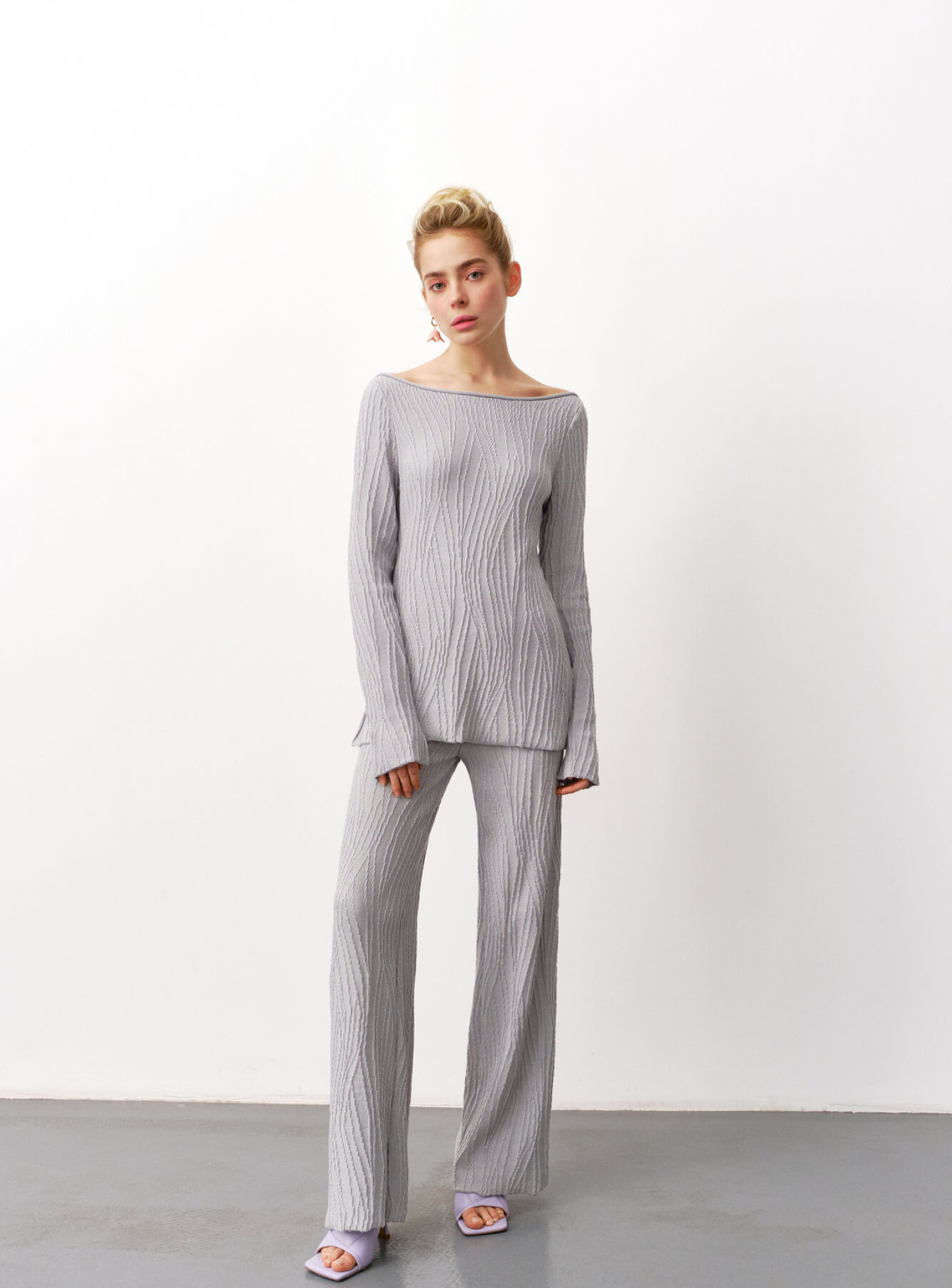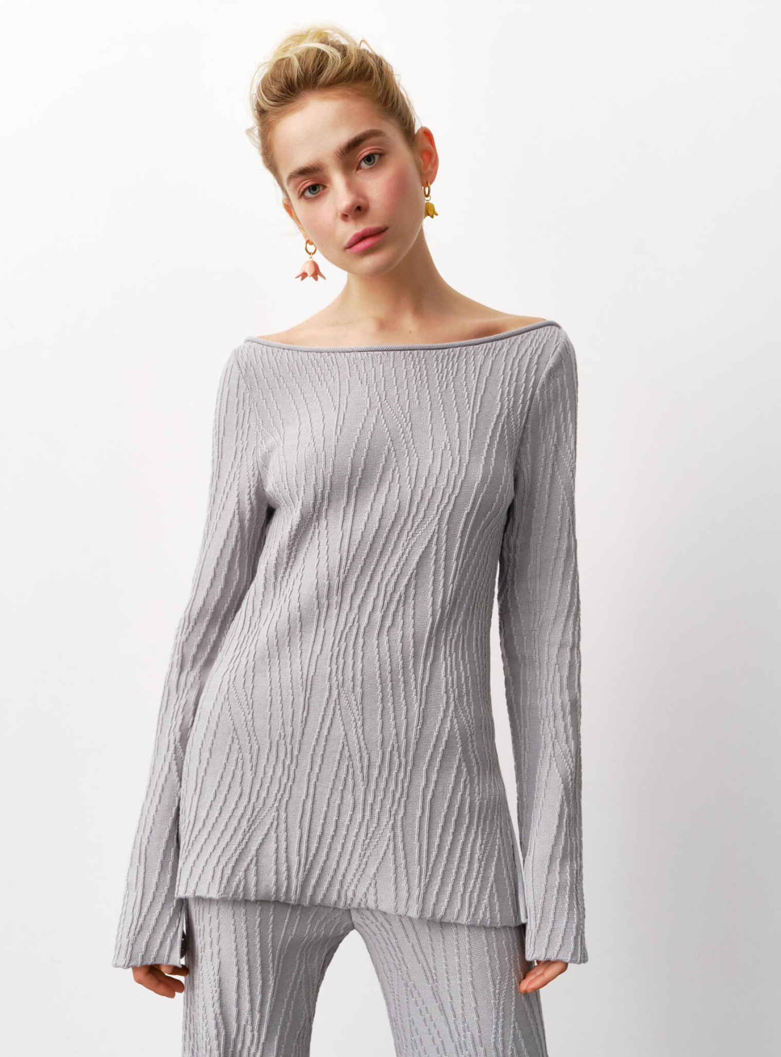Нежный джемпер с деликатным узором горизонтальных линий, придающих образу романтического шарма. Создает красивый силуэт и извлекает образ за счет удлиненного рукава, формы выреза и длины заканчивающегося на середине бедра джемпера. Сочетается в костюме с брюками с фактурным узором.