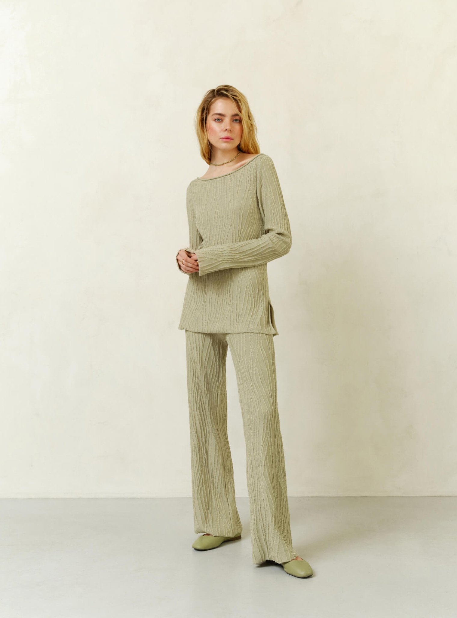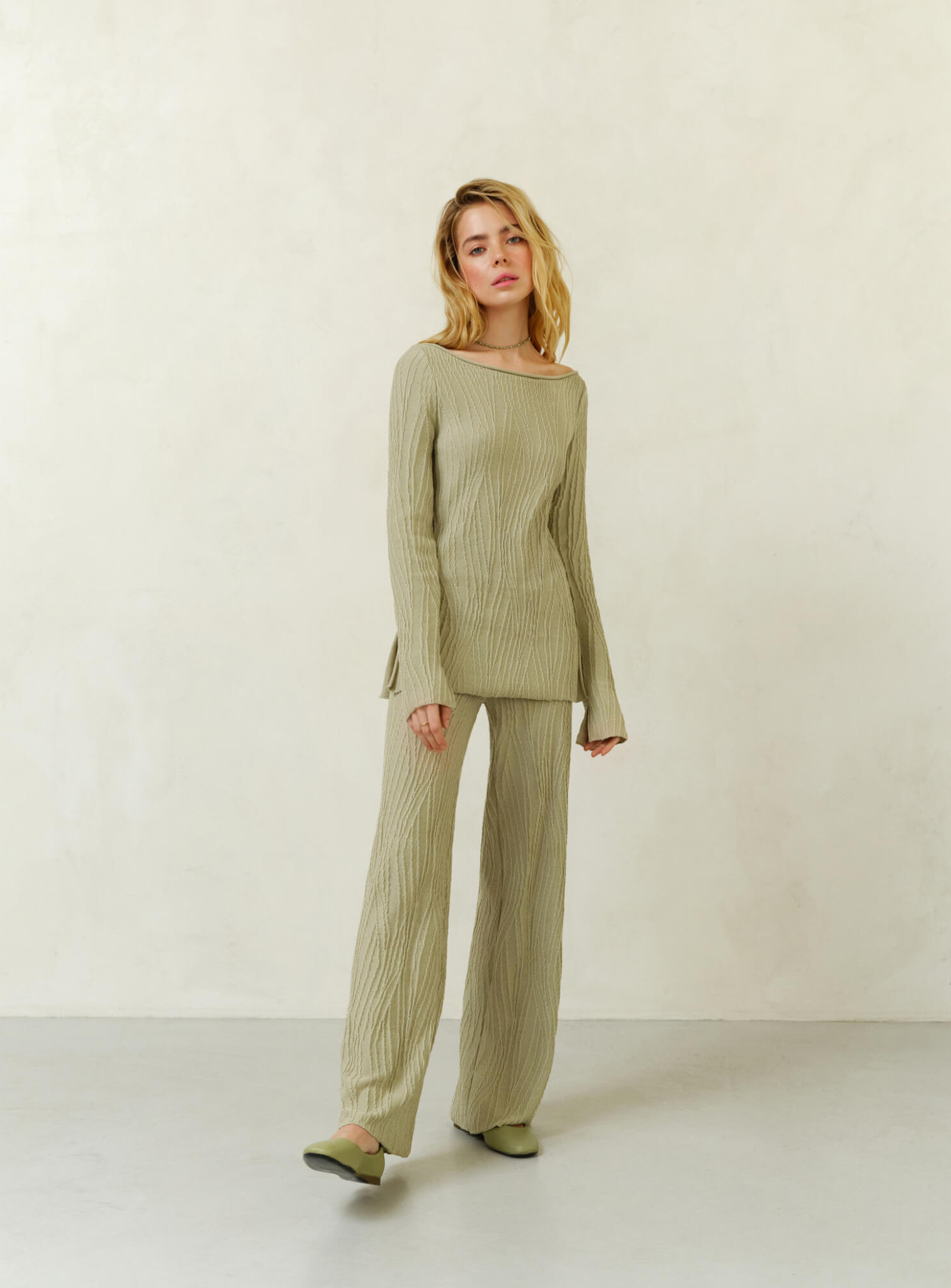 Нежный джемпер с деликатным узором горизонтальных линий, придающих образу романтического шарма. Создает красивый силуэт и извлекает образ за счет удлиненного рукава, формы выреза и длины заканчивающегося на середине бедра джемпера. Сочетается в костюме с брюками с фактурным узором.