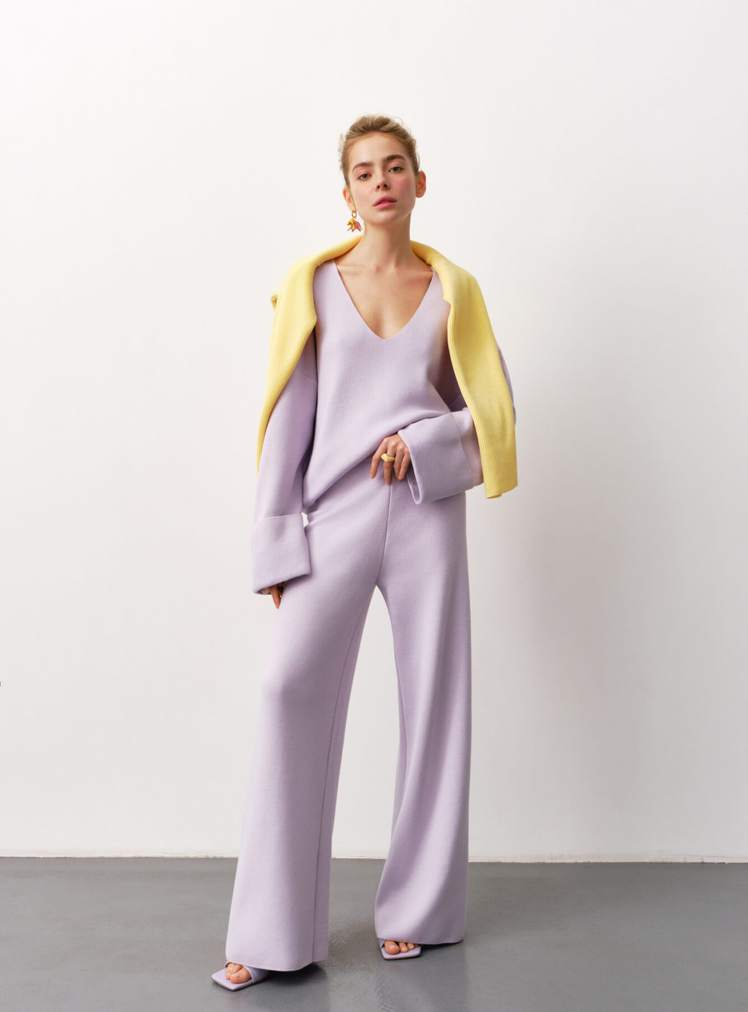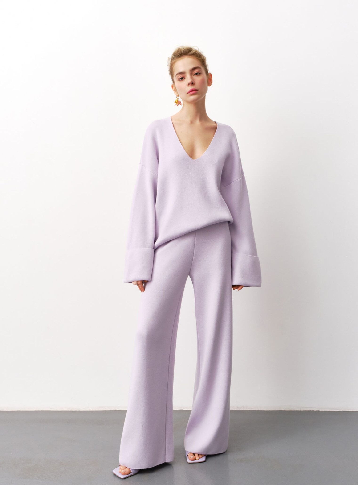 Джемпер с опущенной линией плеча создан для воздушных и легких образов. Выполнен из плотного трикотажа, который не растягивается и свободно спадает по силуэту. Украшен акцентными манжетами и V-образным вырезом, что деликатно подчеркнет зону декольте. Сочетается в костюм с брюками свободного кроя.
