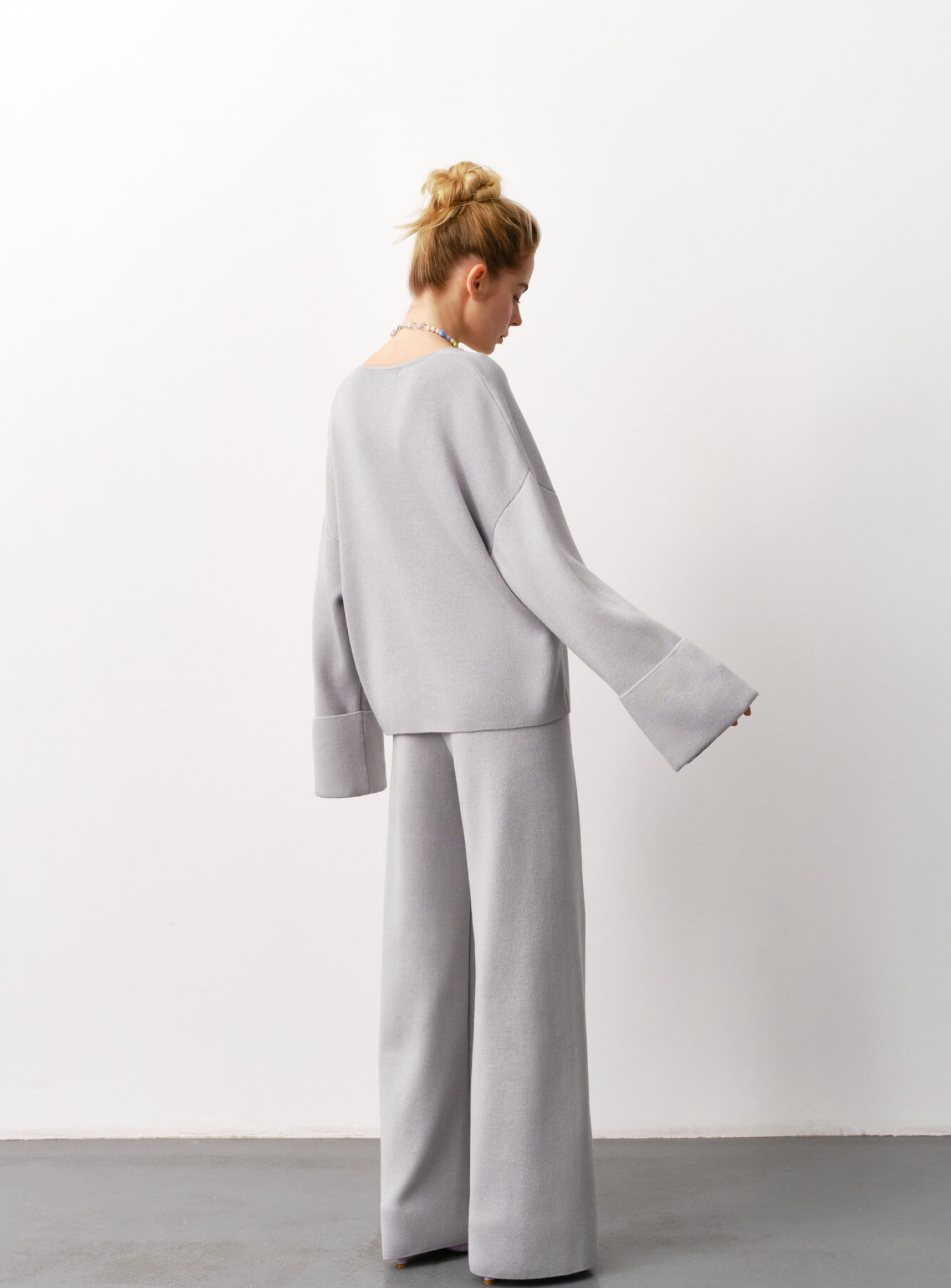 Джемпер с опущенной линией плеча создан для воздушных и легких образов. Выполнен из плотного трикотажа, который не растягивается и свободно спадает по силуэту. Украшен акцентными манжетами и V-образным вырезом, что деликатно подчеркнет зону декольте. Сочетается в костюм с брюками свободного кроя.
