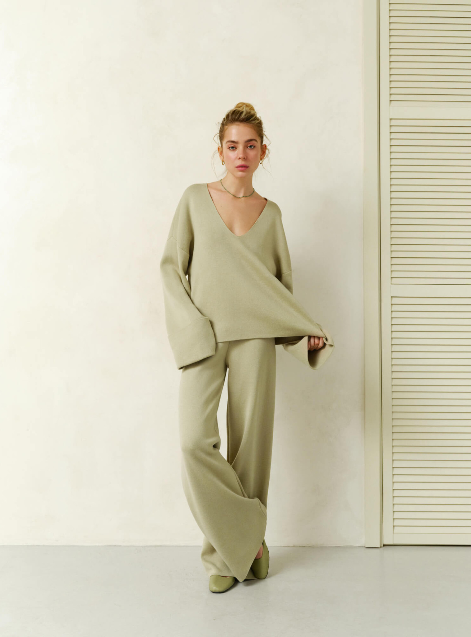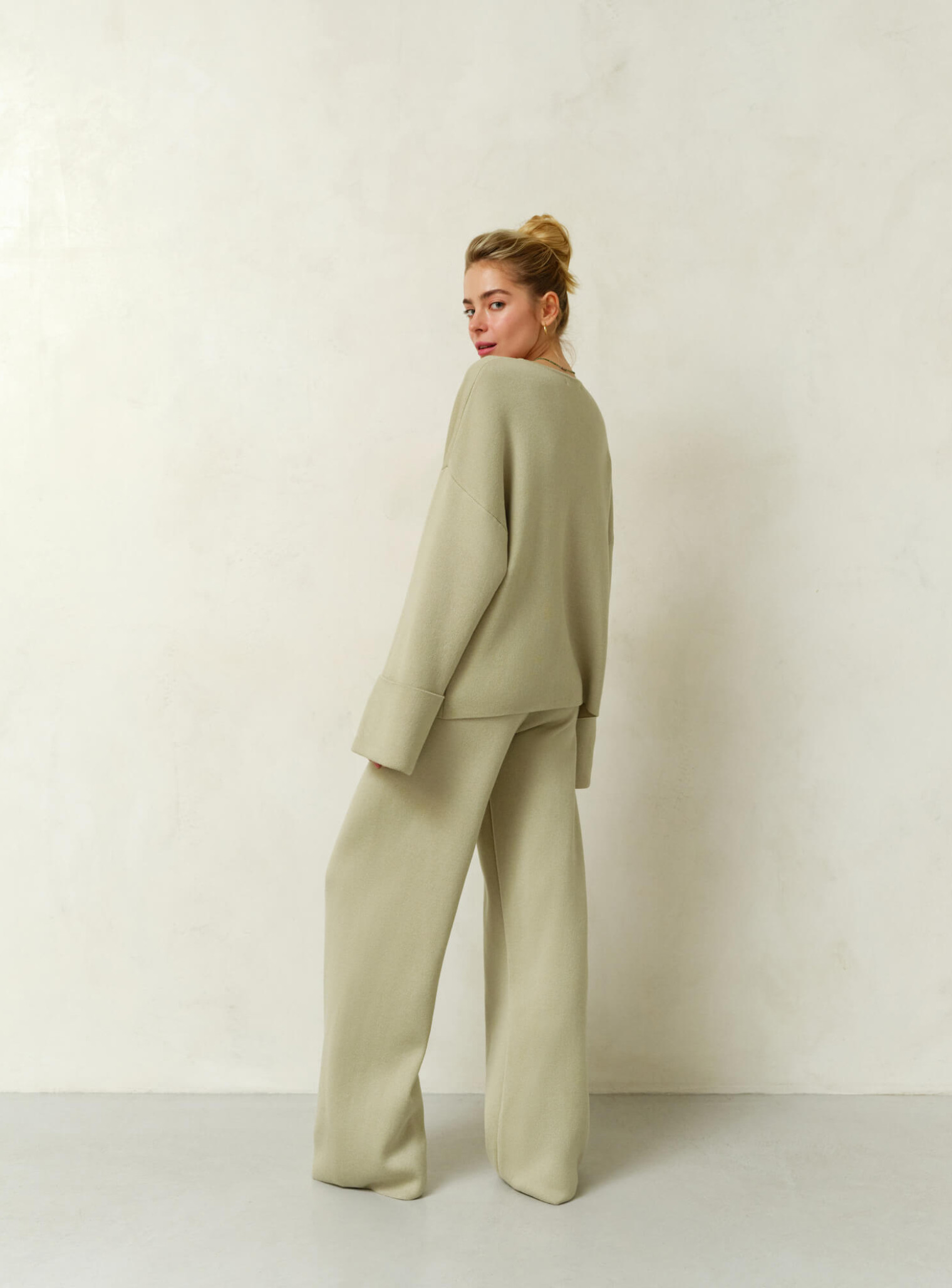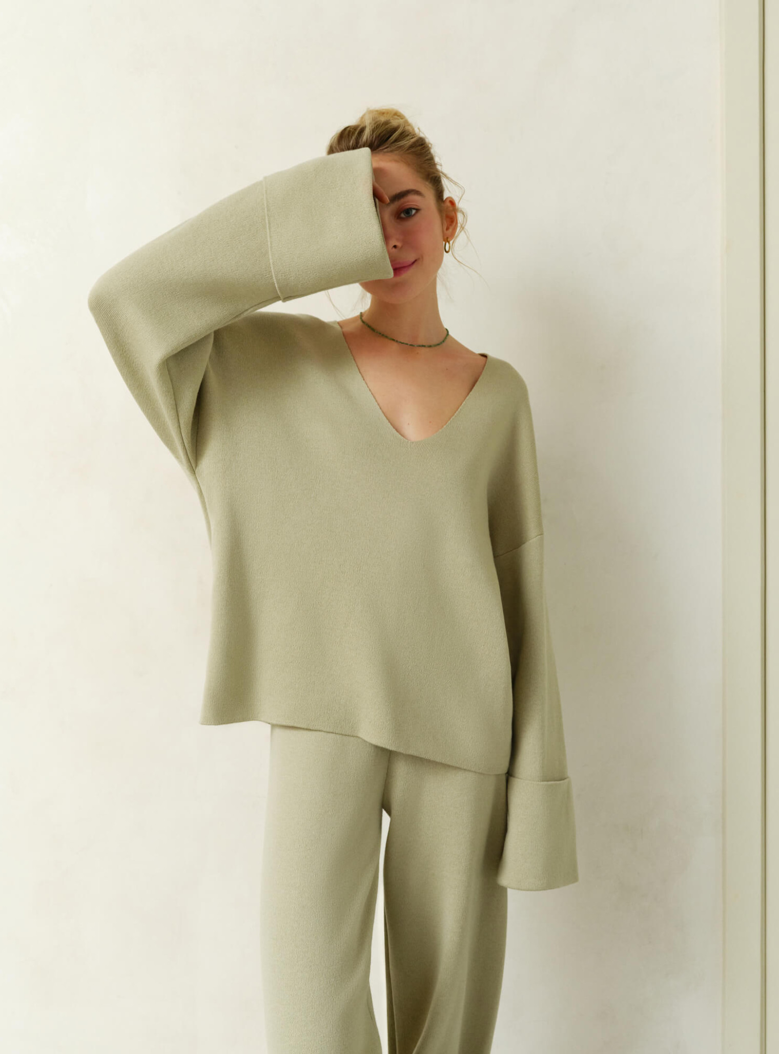 Джемпер с опущенной линией плеча создан для воздушных и легких образов. Выполнен из плотного трикотажа, который не растягивается и свободно спадает по силуэту. Украшен акцентными манжетами и V-образным вырезом, что деликатно подчеркнет зону декольте. Сочетается в костюм с брюками свободного кроя.