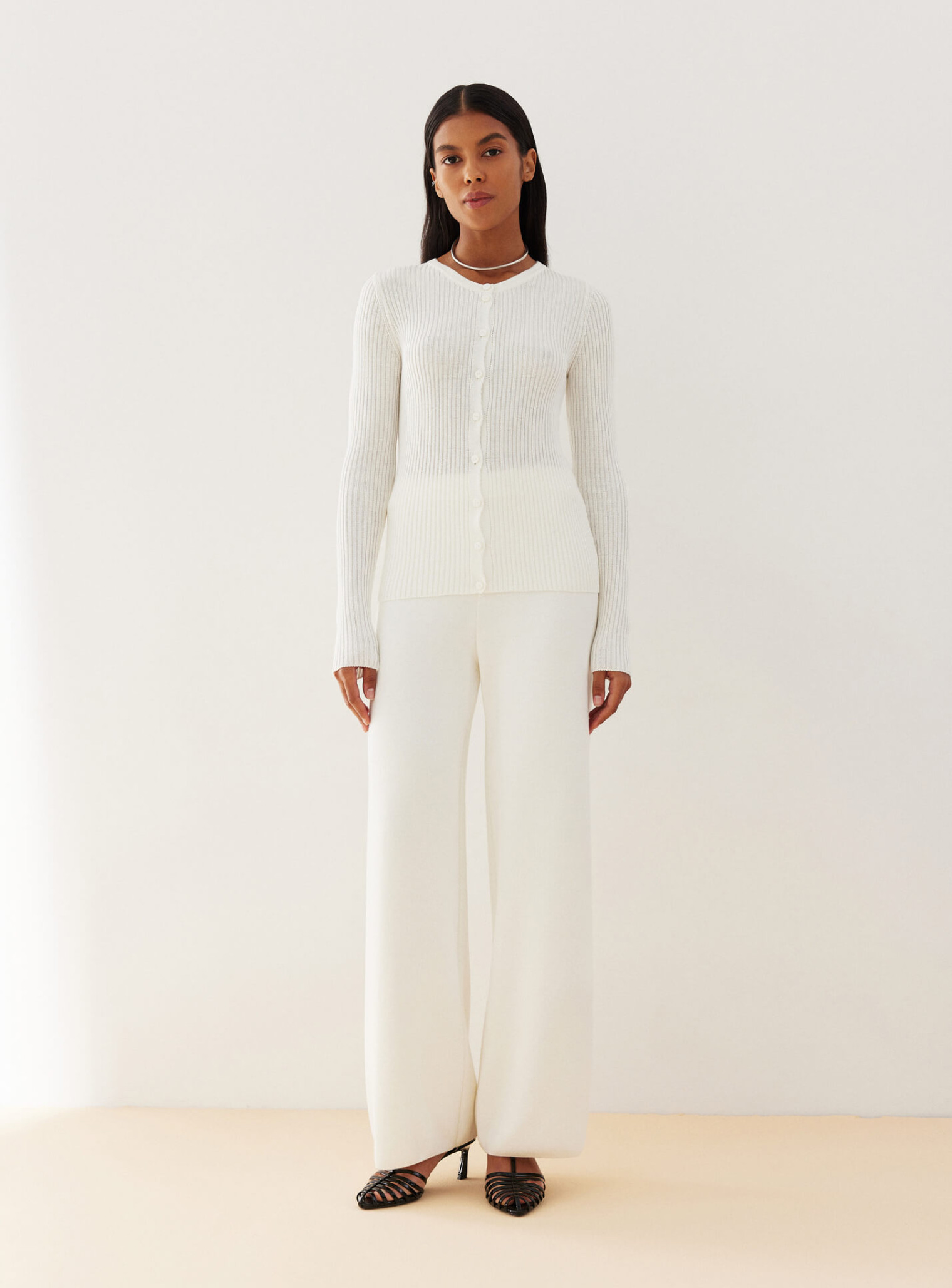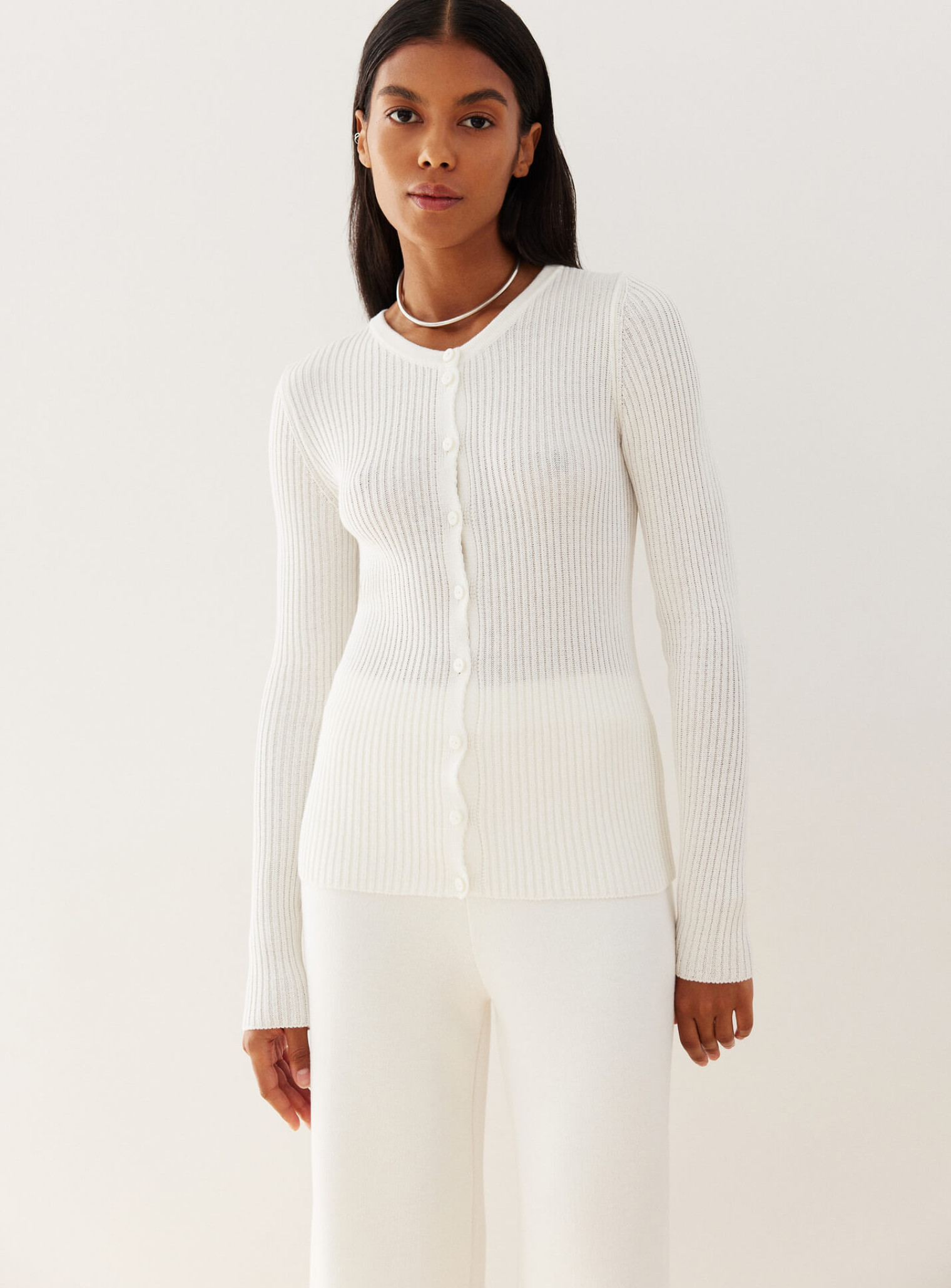 Трендовый джемпер в рубчик с маленькими пуговицами, позволяющими экспериментировать со стилизацией образов. Удлиненный крой создает элегантный женственный силуэт, а минималистичный дизайн джемпера удачно сочетается с брендовыми брюками и юбками.