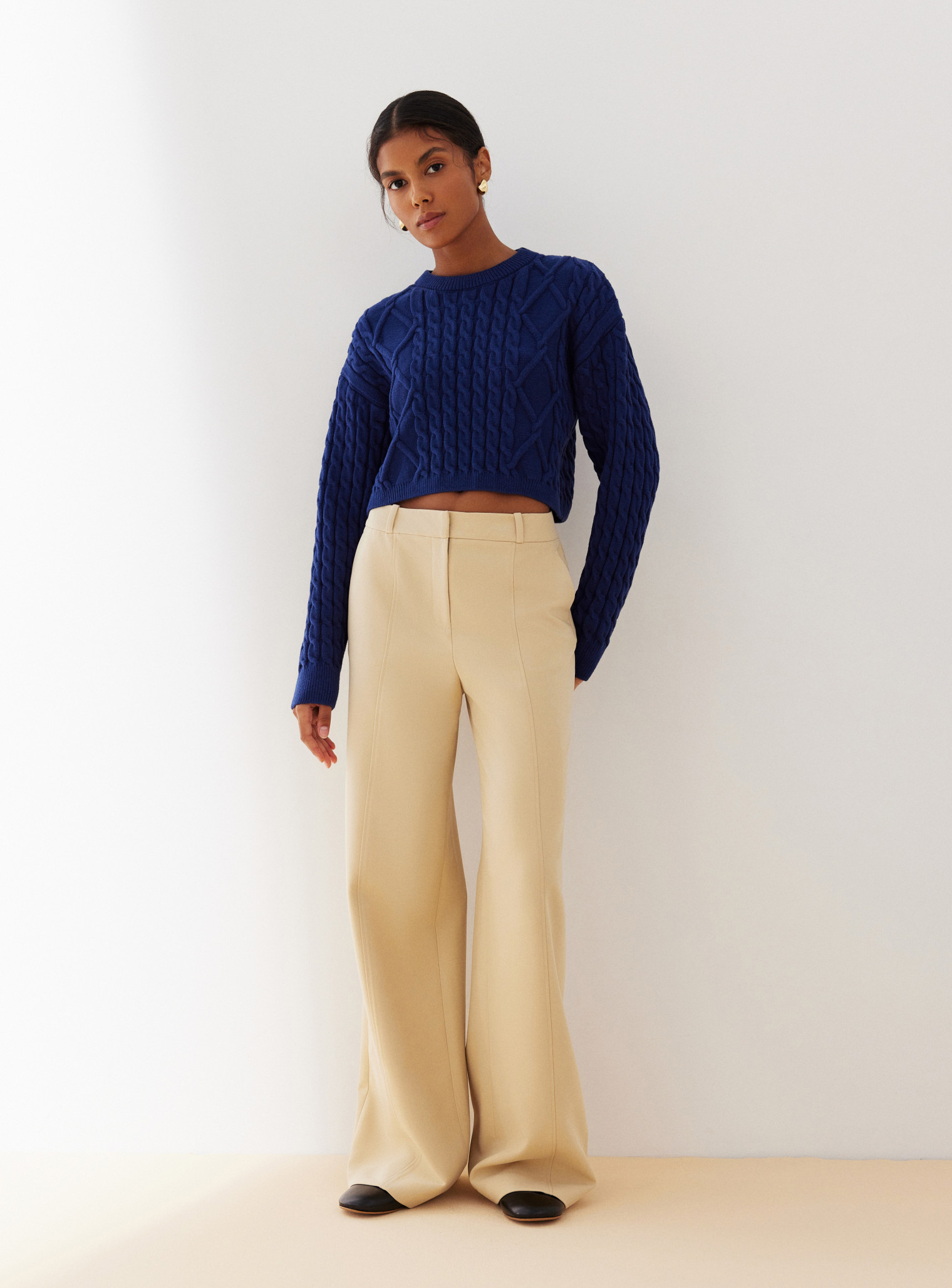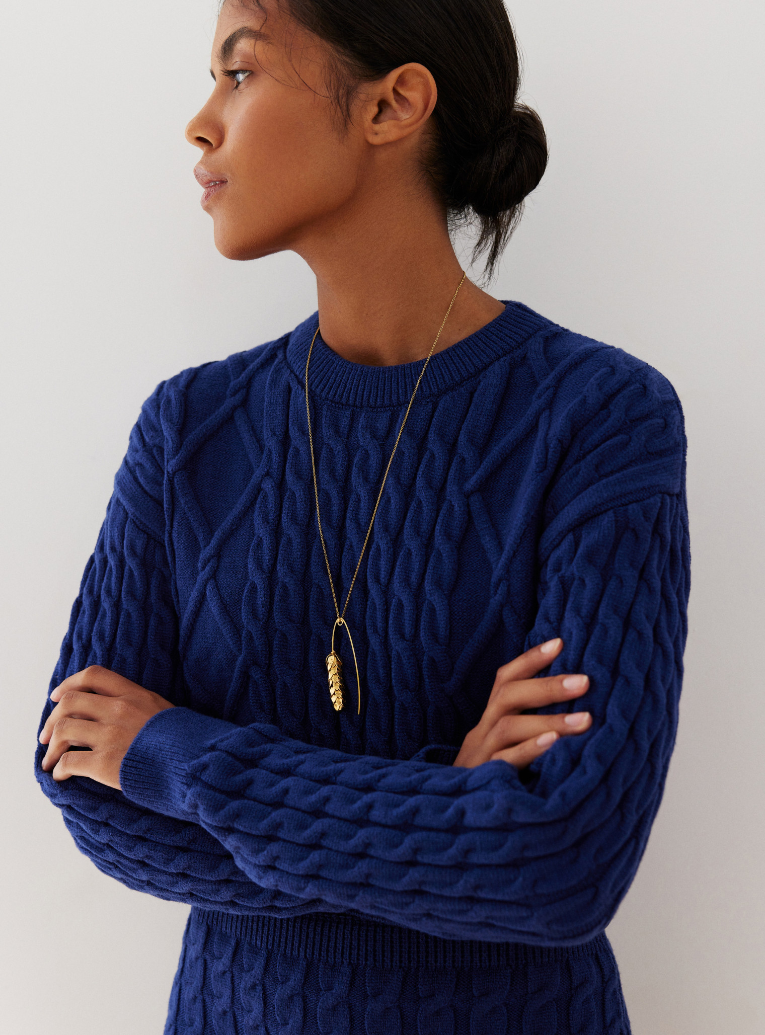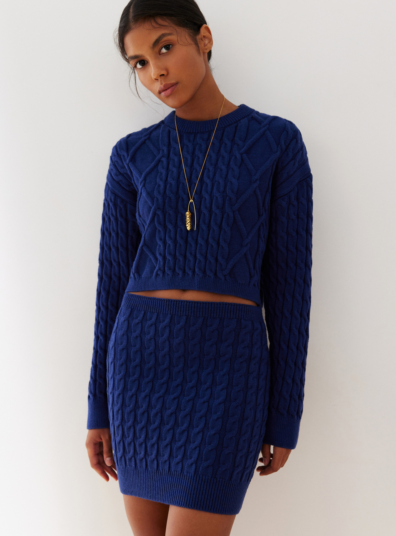 Трендовый джемпер укороченного кроя с фактурным узором выполнен из мягкой нежной пряжи, что подарит уют и комфорт в прохладный сезон. Сочетается в костюме с мини юбкой с фактурным узором.