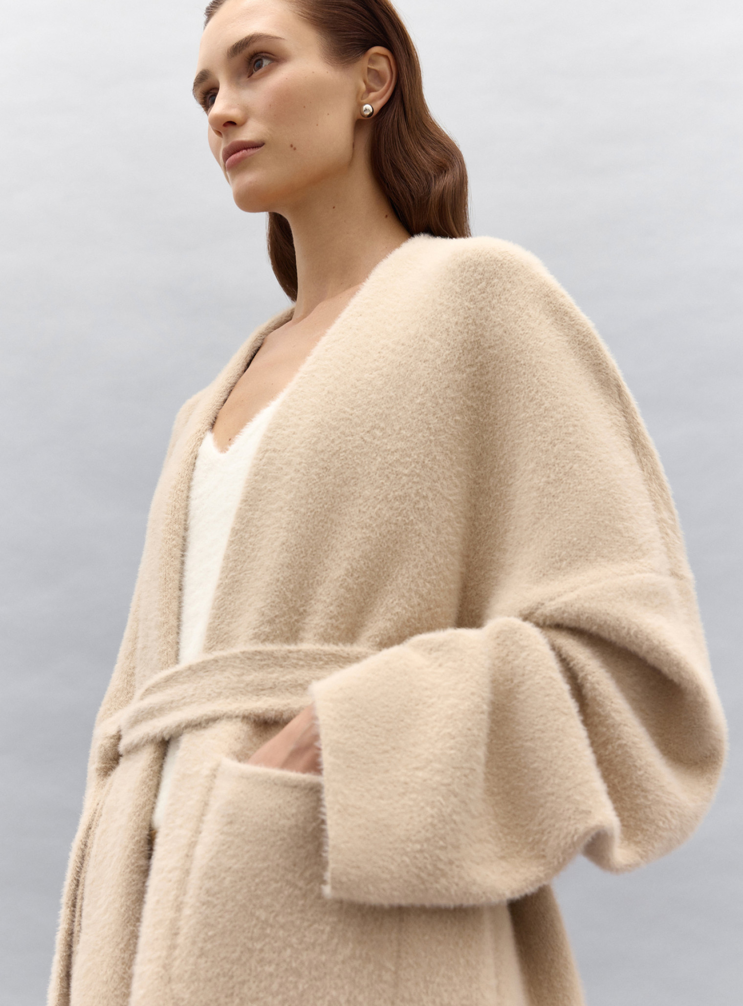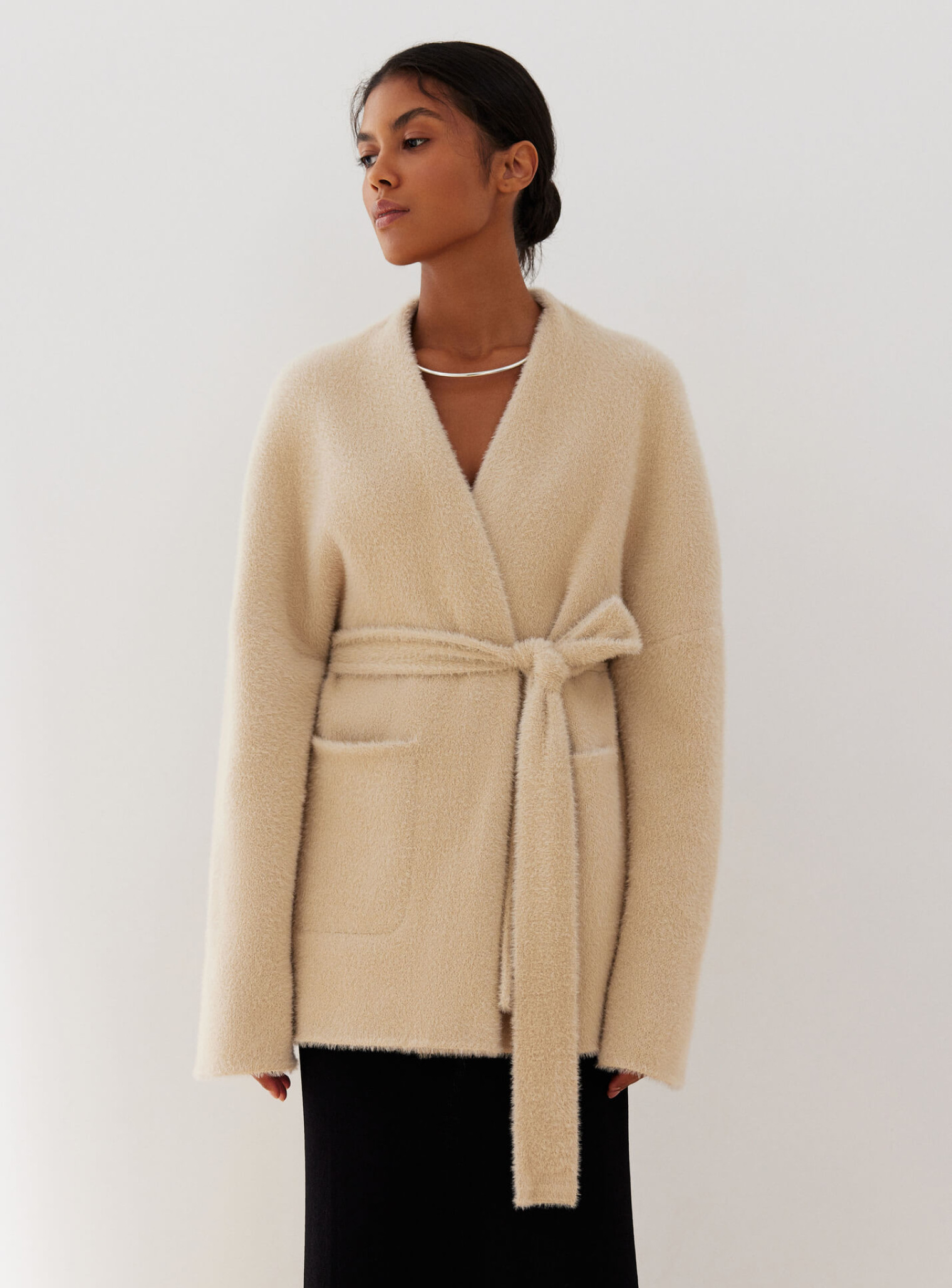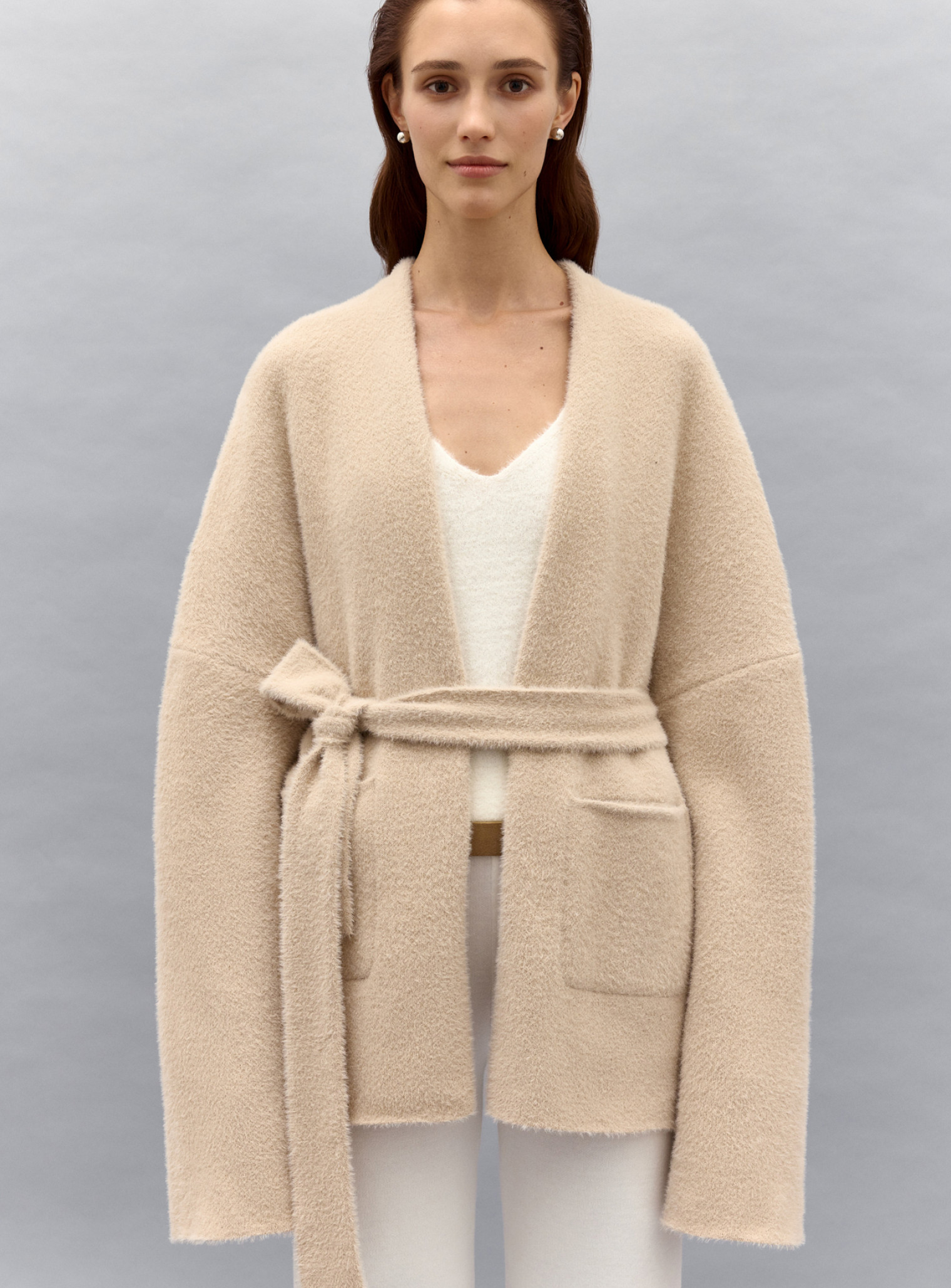 Элегантный кардиган кимоно из нежной пушистой пряжи с карманами и поясом, подчеркивающим линию талии. Стильно выглядит как самостоятельное изделие и дополнит ваши образы с платьями и джемперами.