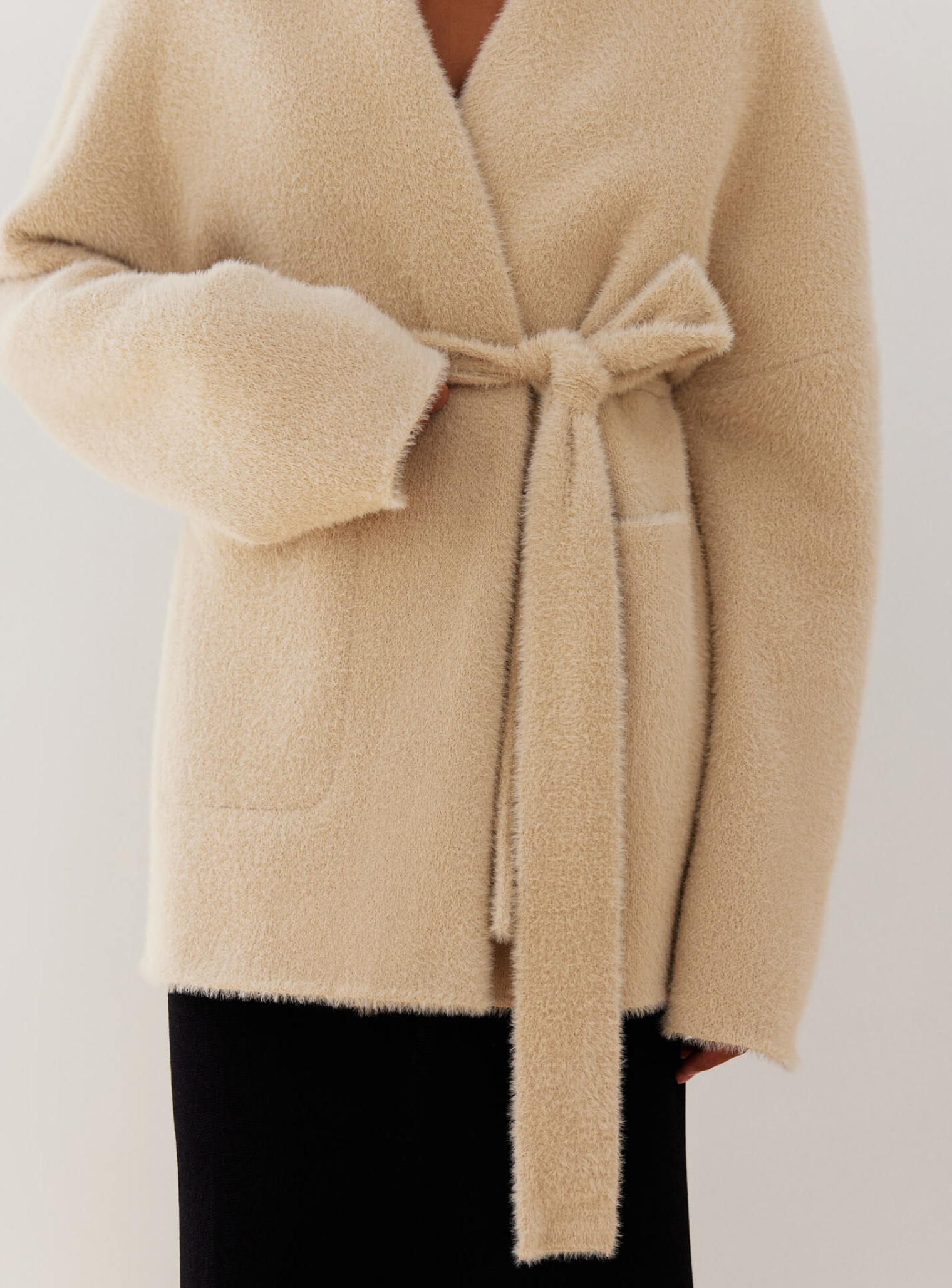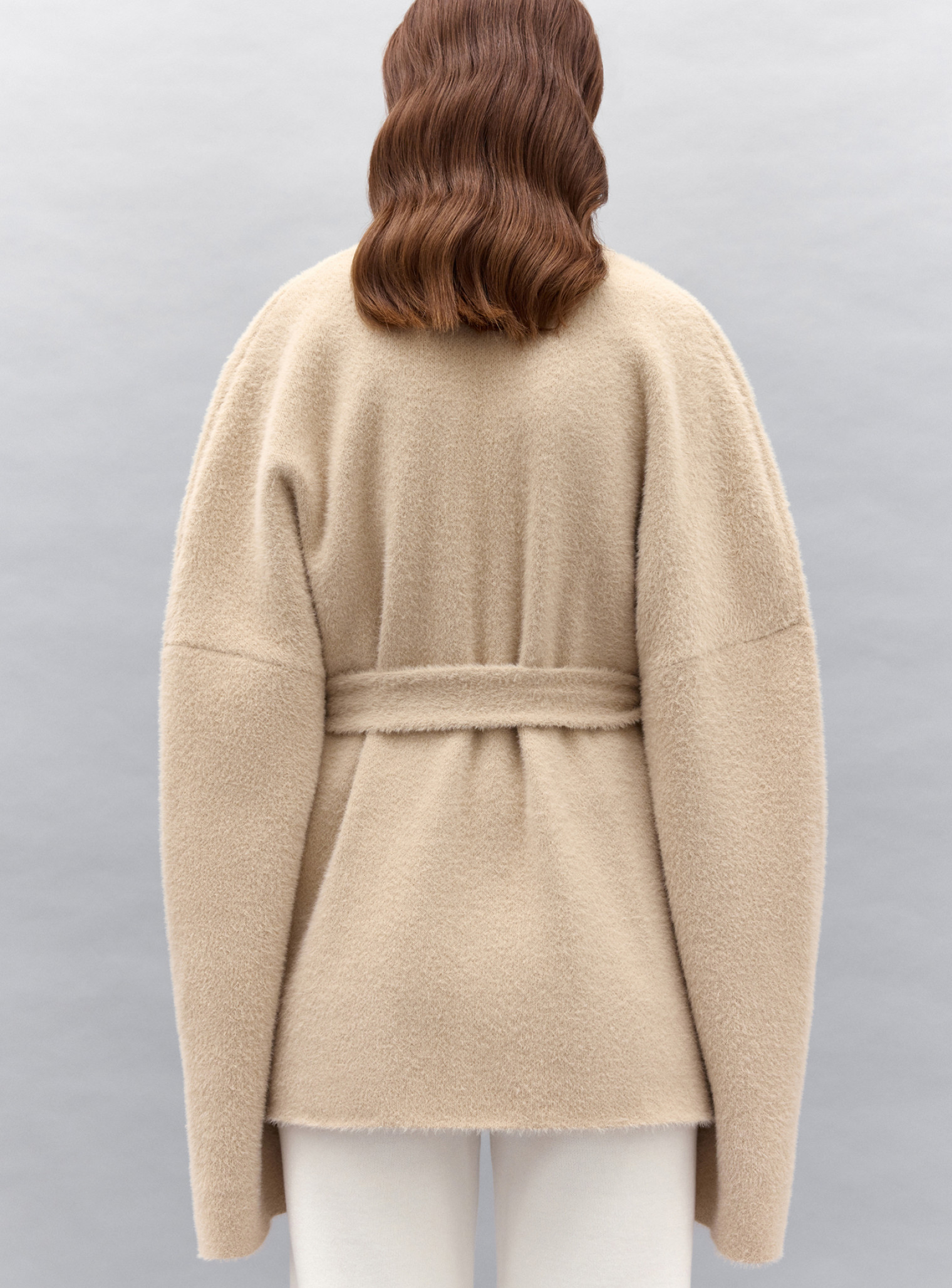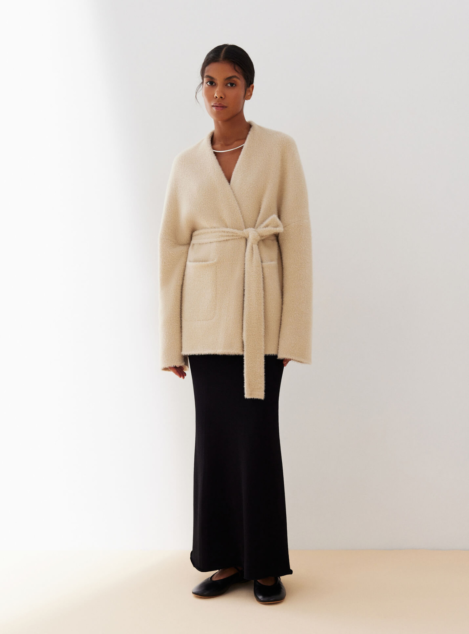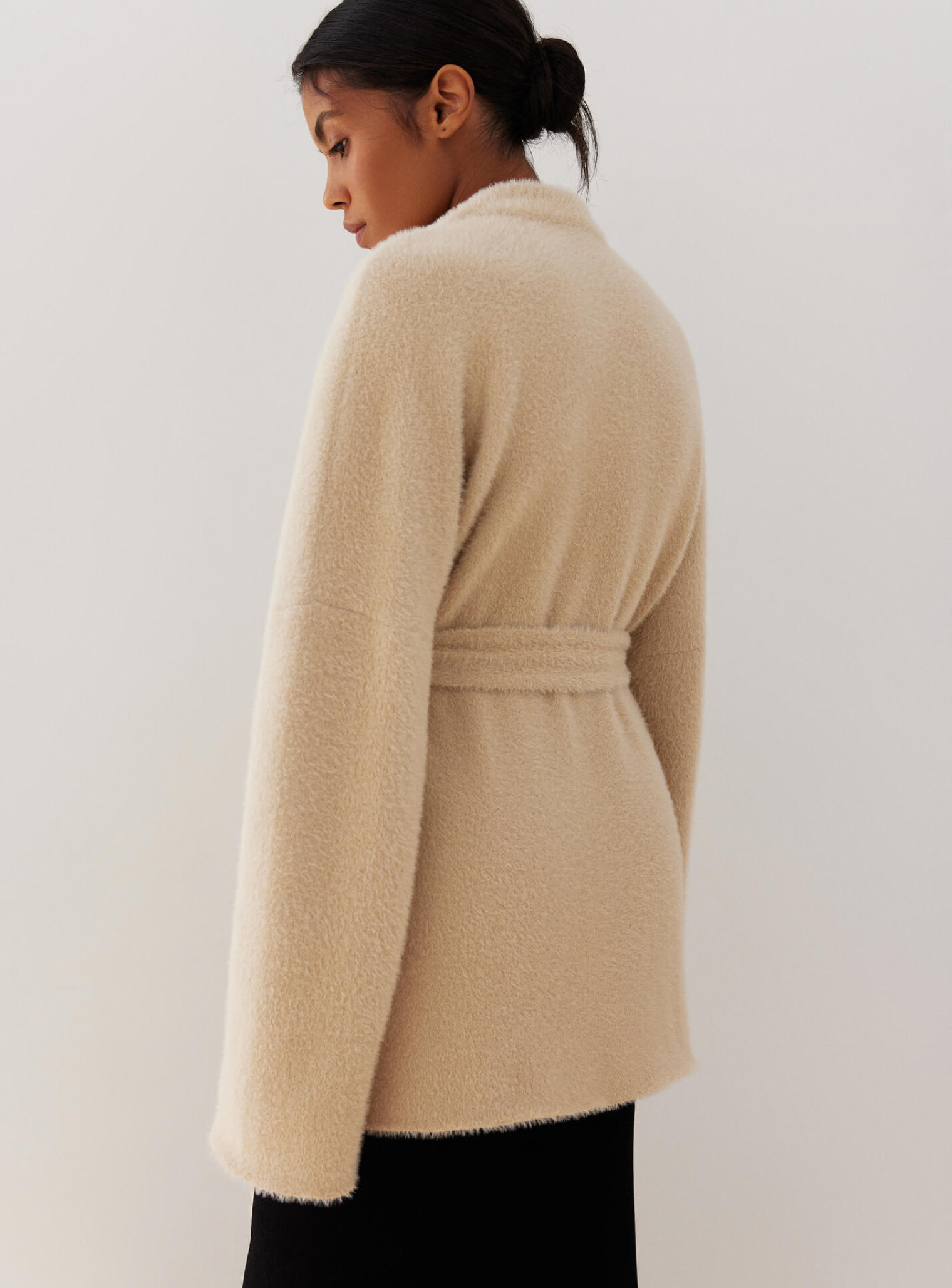 Элегантный кардиган кимоно из нежной пушистой пряжи с карманами и поясом, подчеркивающим линию талии. Стильно выглядит как самостоятельное изделие и дополнит ваши образы с платьями и джемперами.