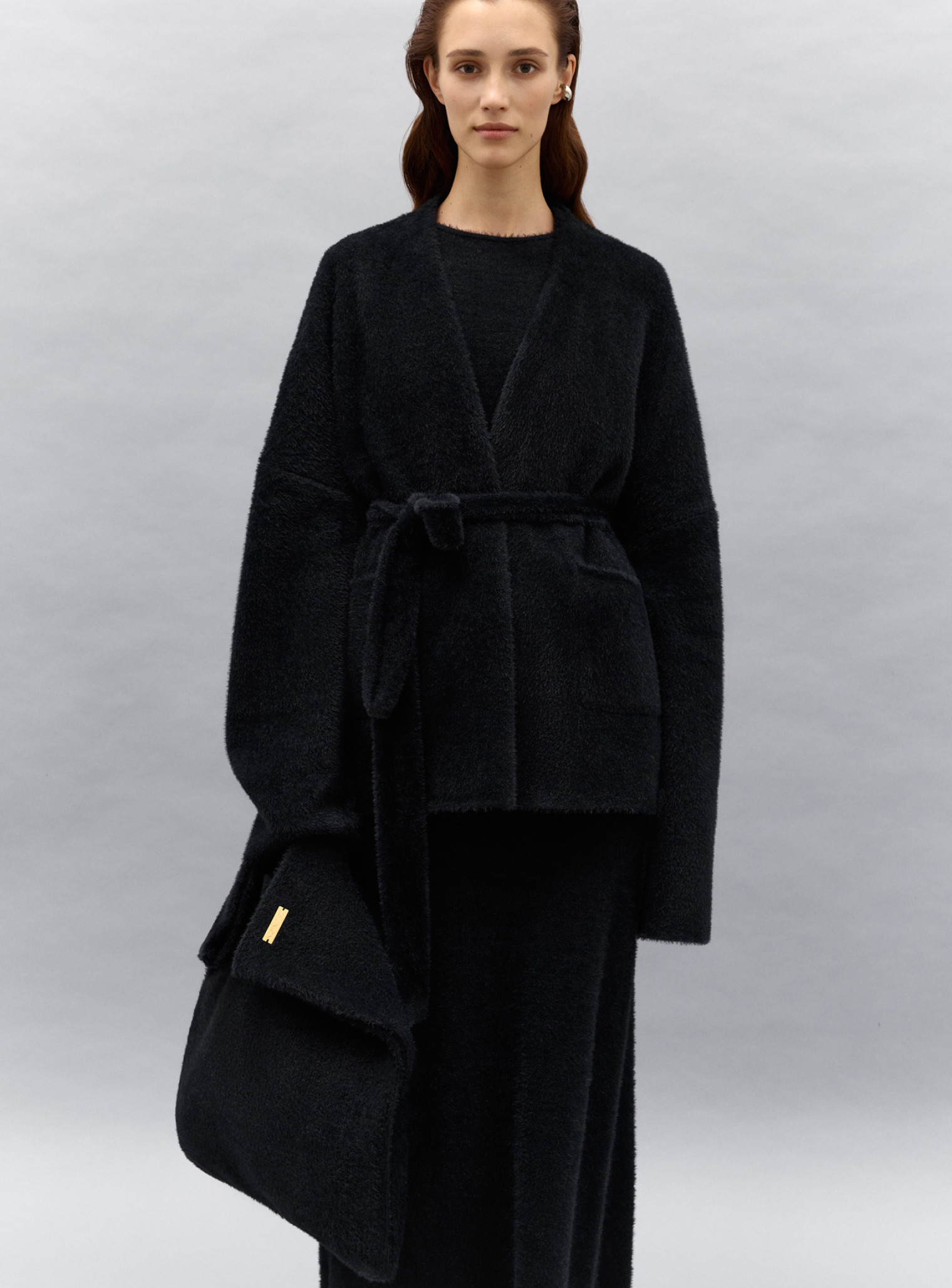 Женский пушистый теплый черный кардиган с поясом "Эмбер"