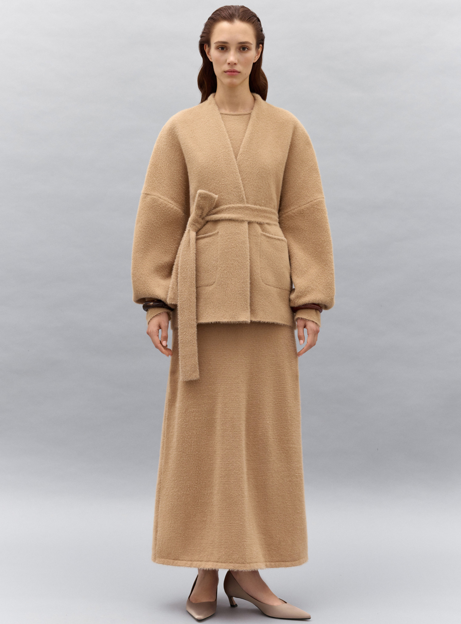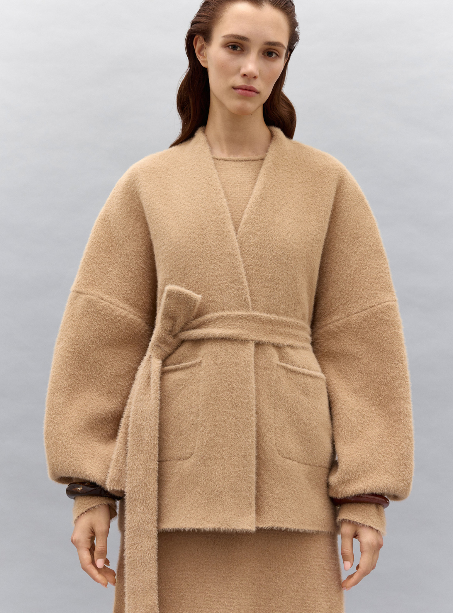 Элегантный кардиган кимоно из нежной пушистой пряжи с карманами и поясом, подчеркивающим линию талии. Стильно выглядит как самостоятельное изделие и дополнит ваши образы с платьями и джемперами.