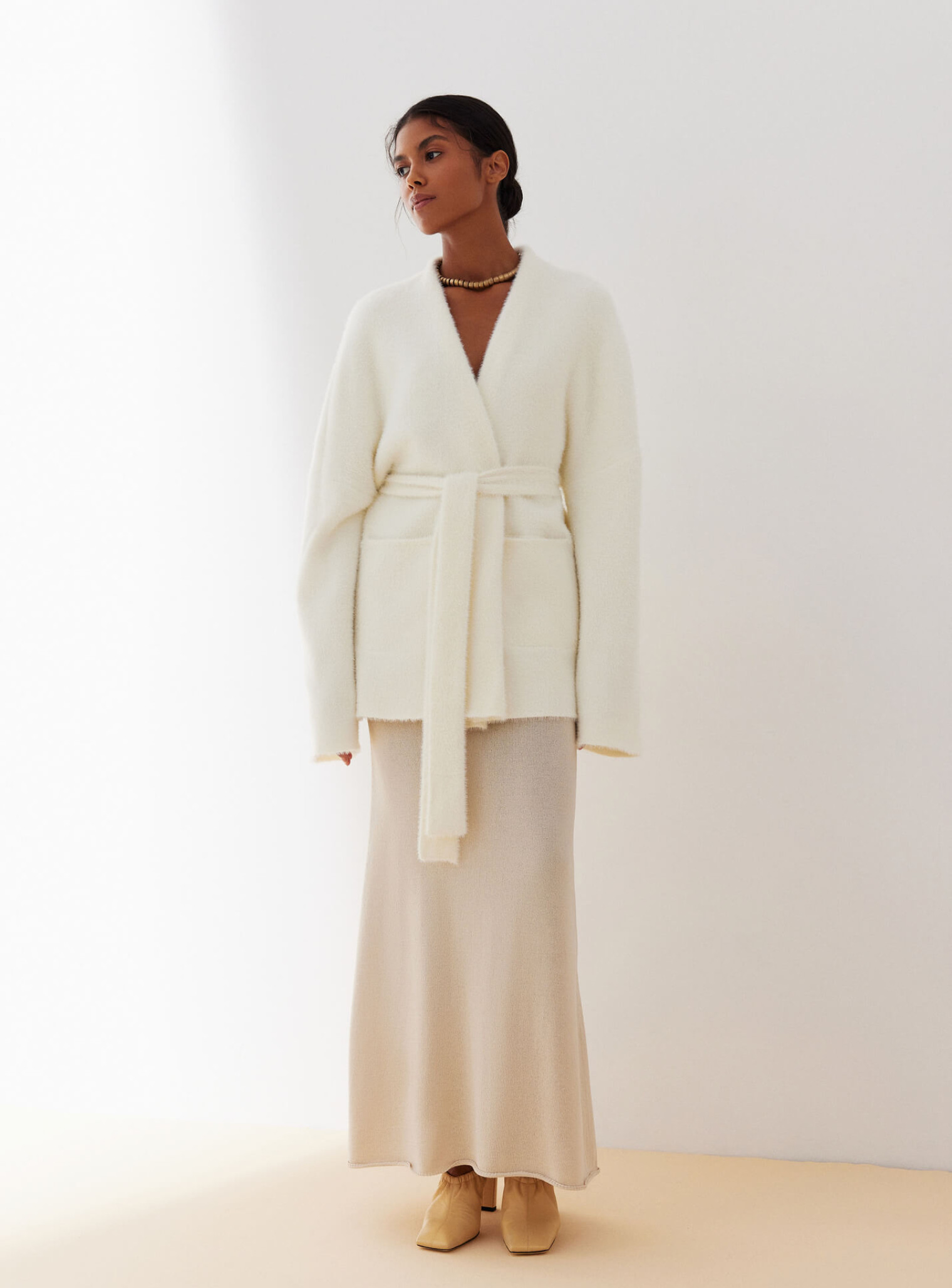 Элегантный кардиган кимоно из нежной пушистой пряжи с карманами и поясом, подчеркивающим линию талии. Стильно выглядит как самостоятельное изделие и дополнит ваши образы с платьями и джемперами.