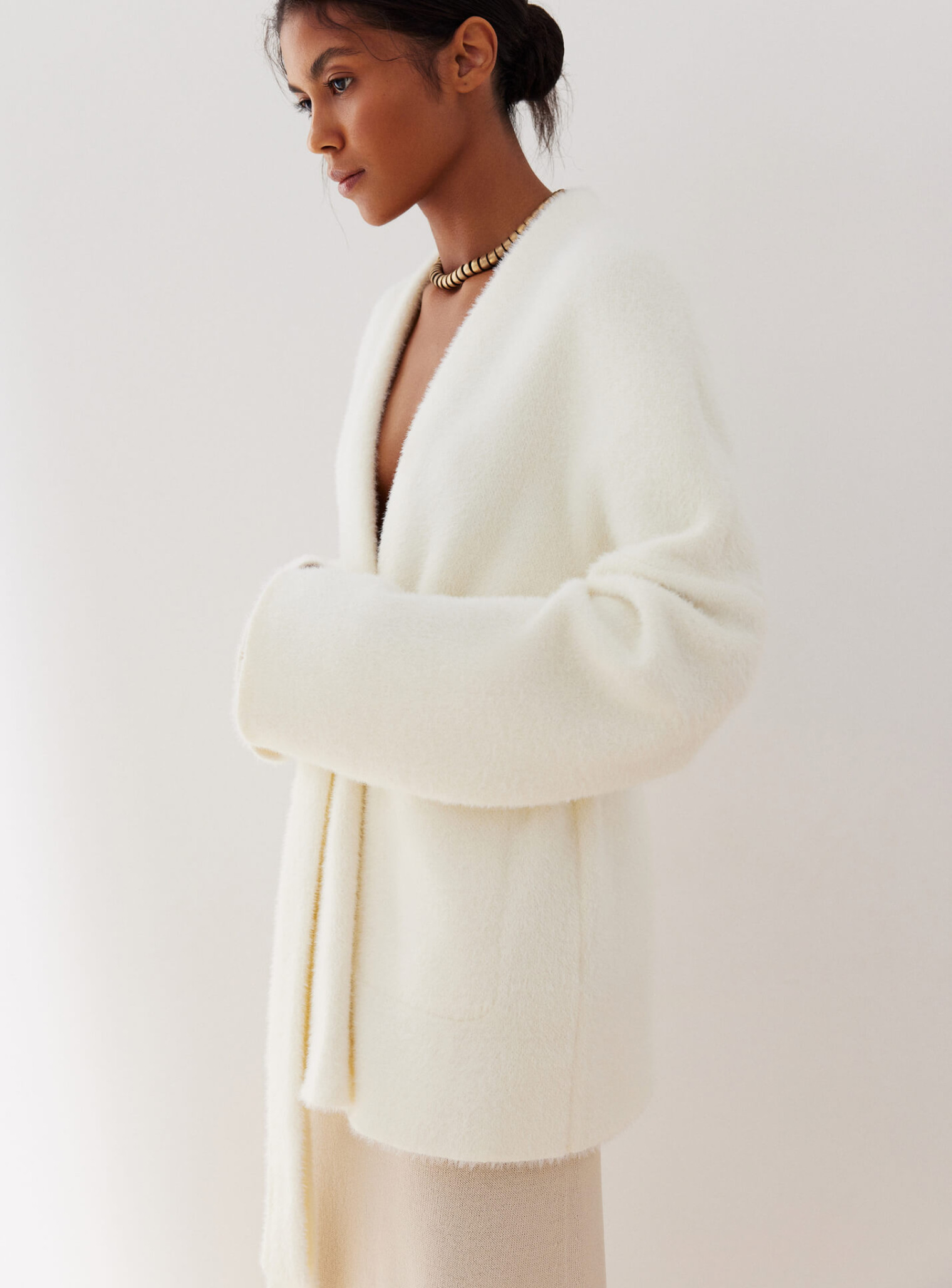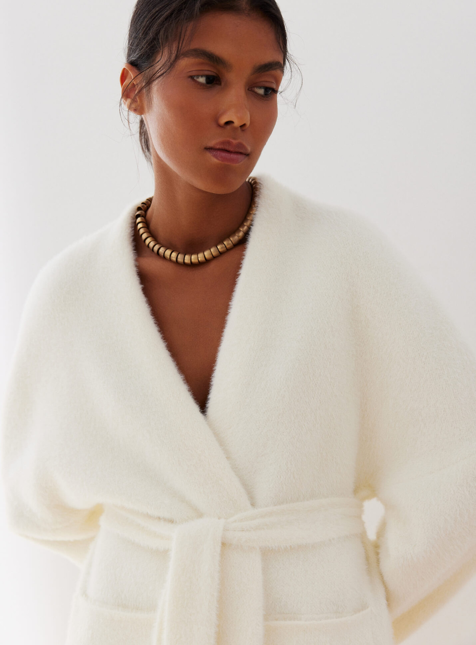 "Эмбер" Женский пушистый молочный кардиган с карманами и поясом