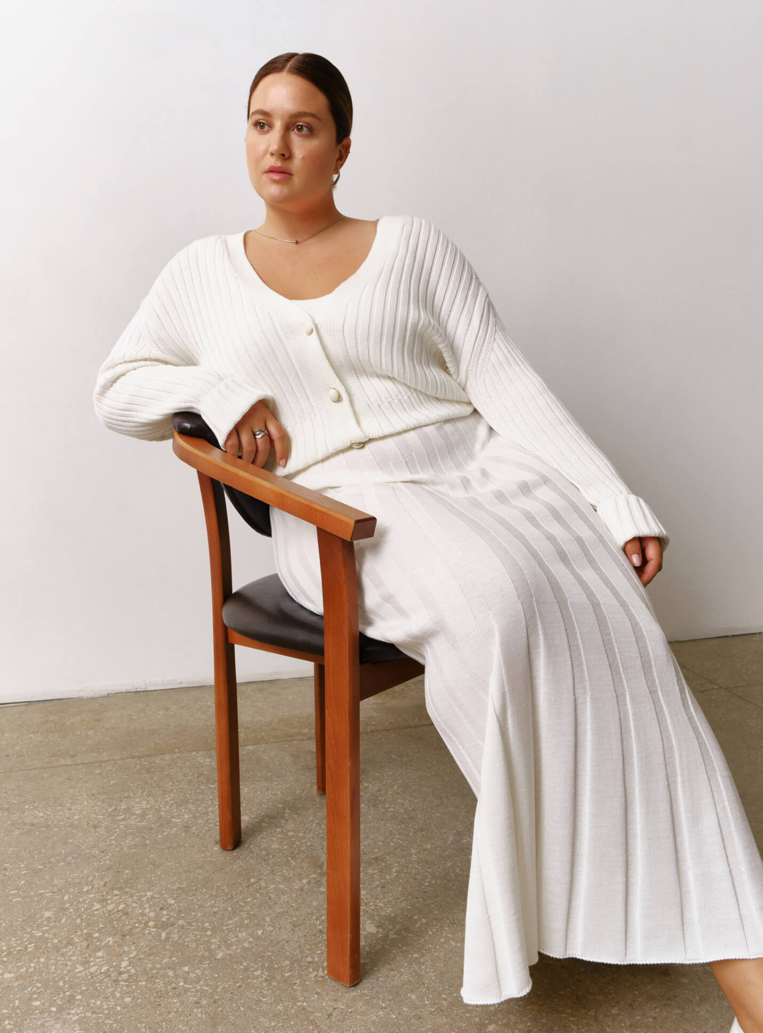 Кардиган мини в резинку с V-образным вырезом и акцентными пуговицами для элегантных образов. Сочетается в костюм с юбкой мини.