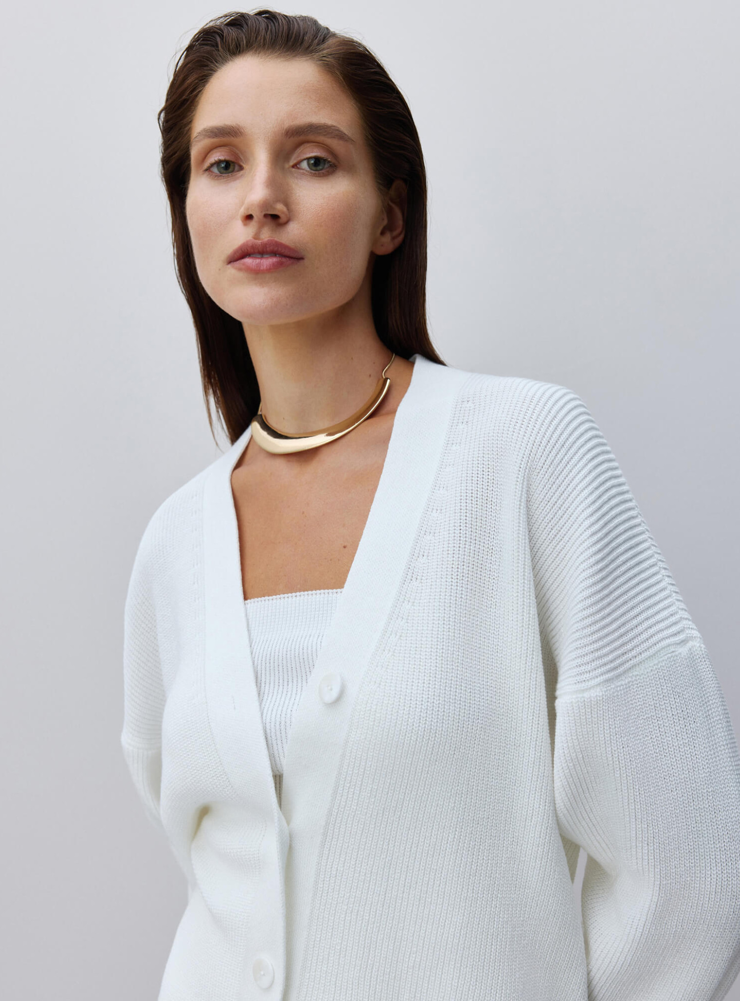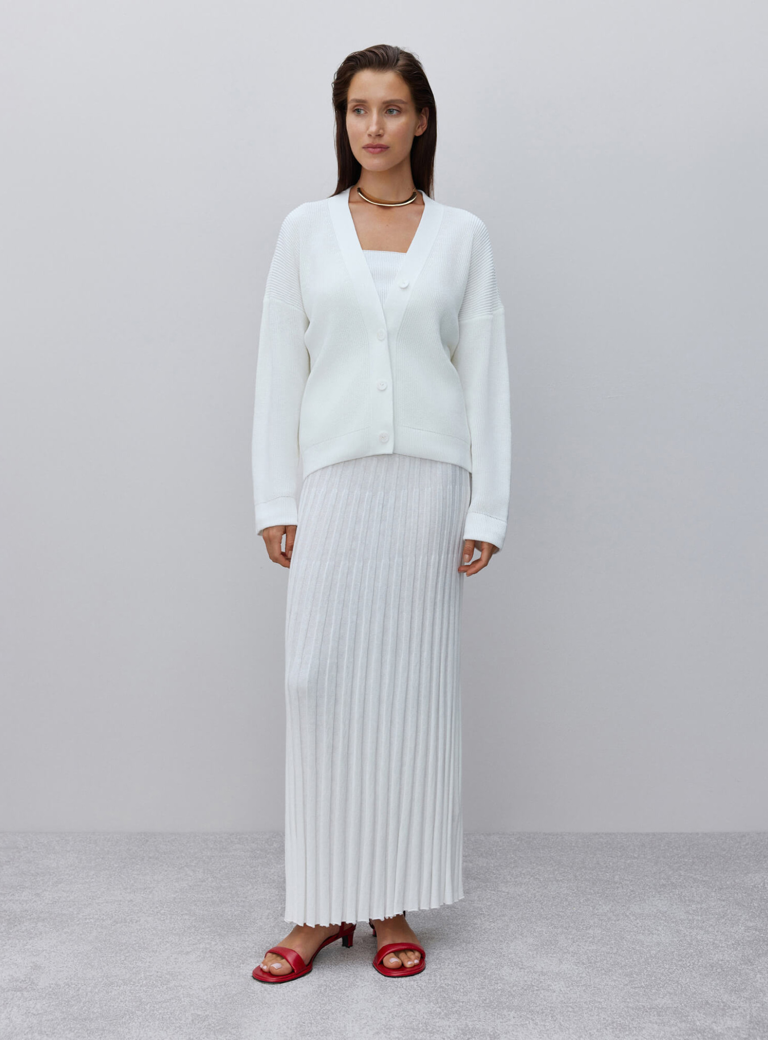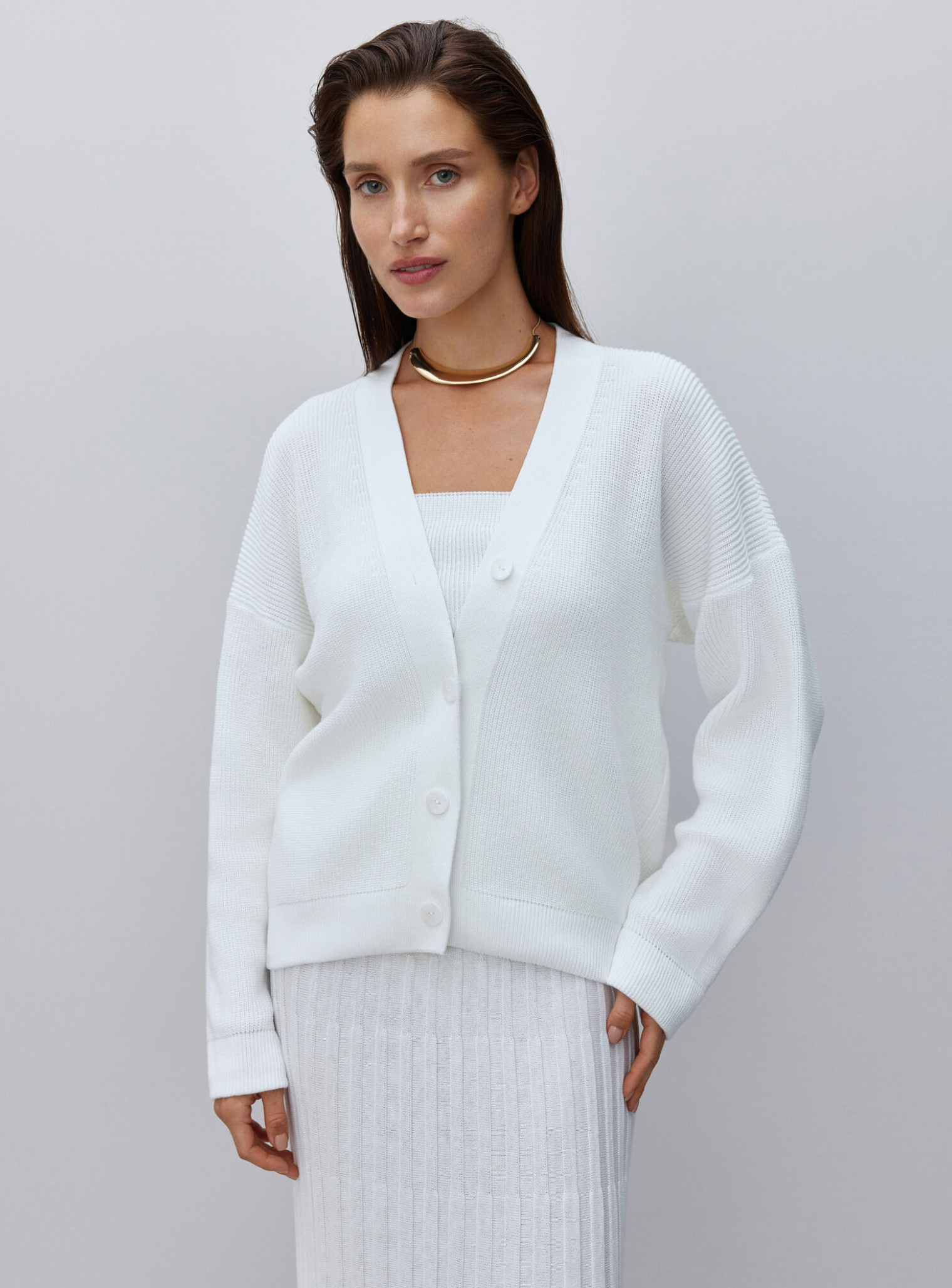 Базовый кардиган женский свободного кроя на пуговицах, которые повторяют цвет изделия. Универсальная модель с треугольным декольте и опущенной линией плеча, легко интегрируемая в гардероб в холодный сезон. Сочетается в комплекте с юбкой гофре и топом.