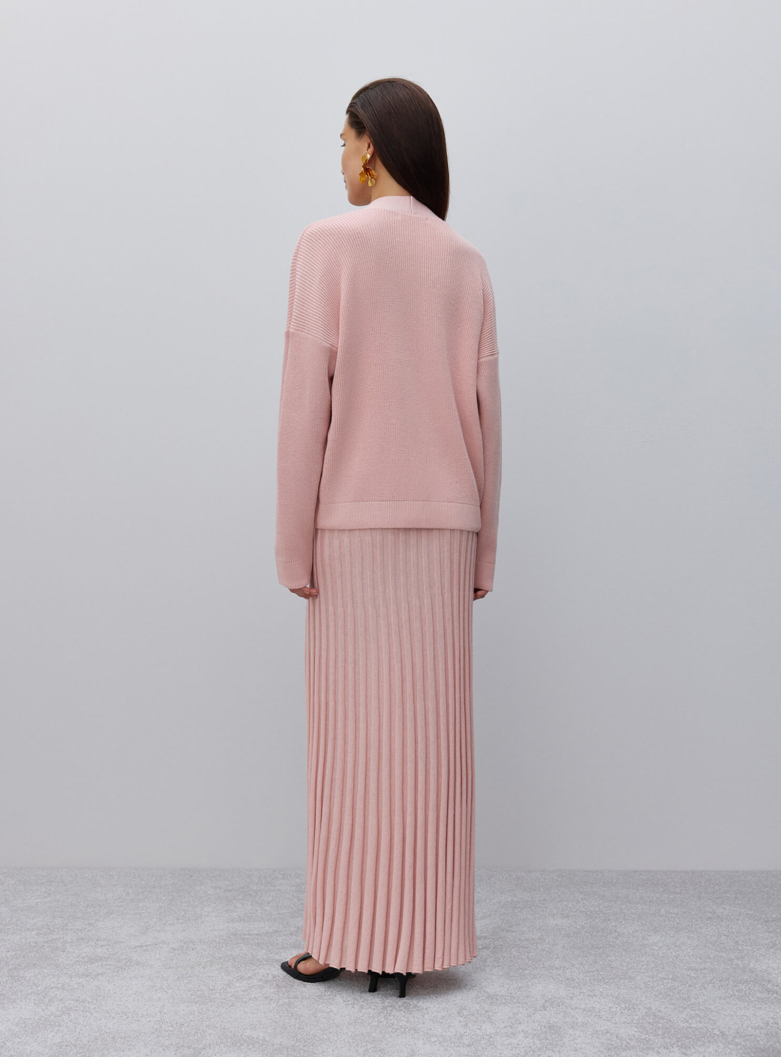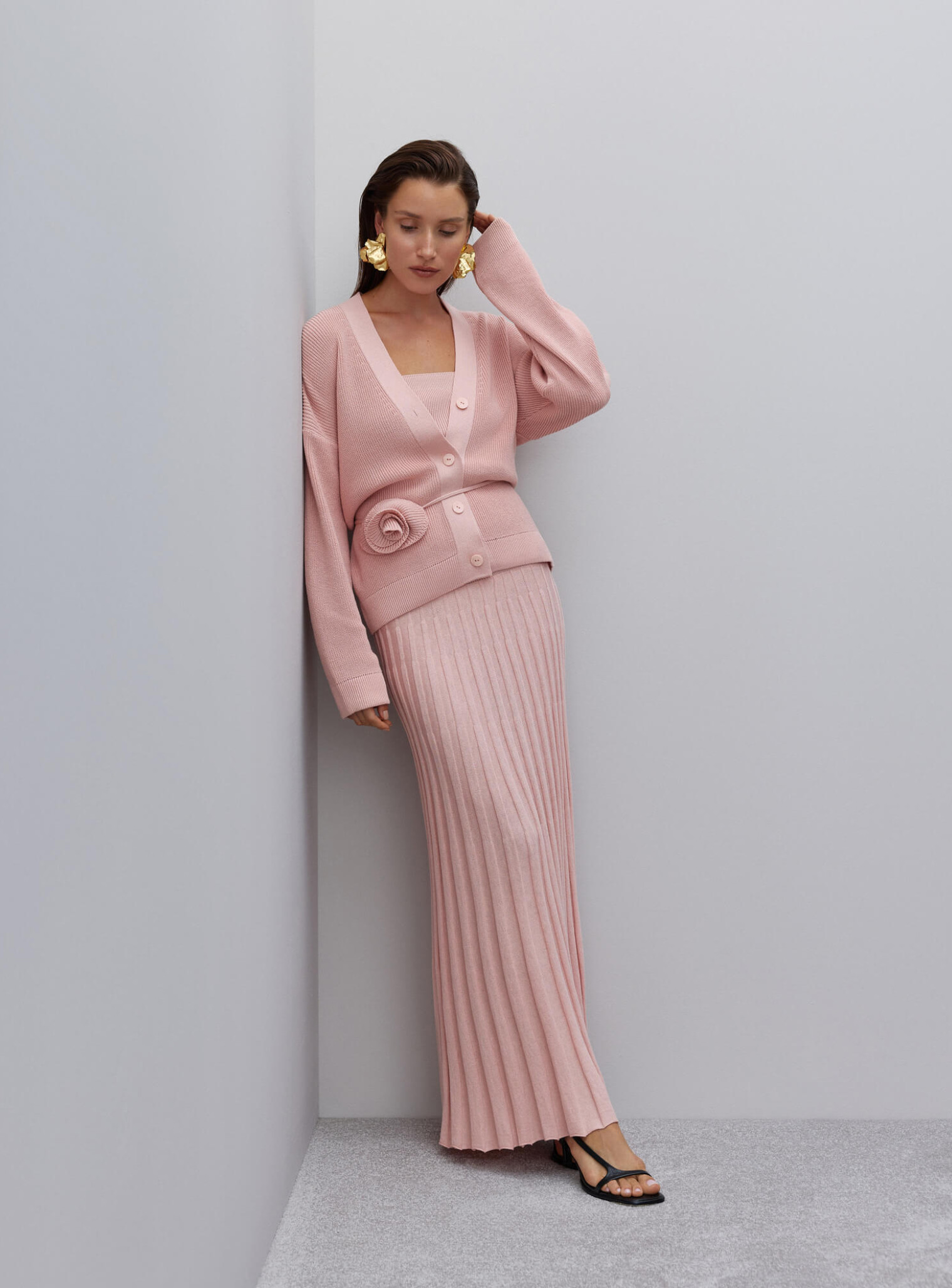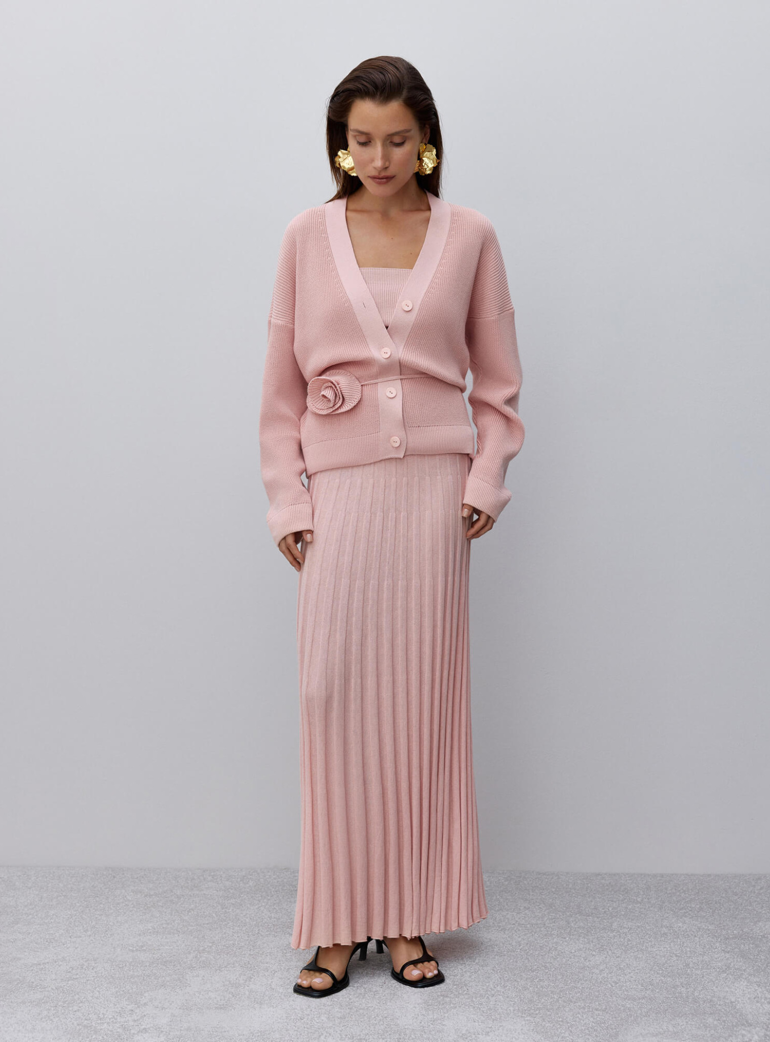 Базовый кардиган женский свободного кроя на пуговицах, которые повторяют цвет изделия. Универсальная модель с треугольным декольте и опущенной линией плеча, легко интегрируемая в гардероб в холодный сезон. Сочетается в комплекте с юбкой гофре и топом.