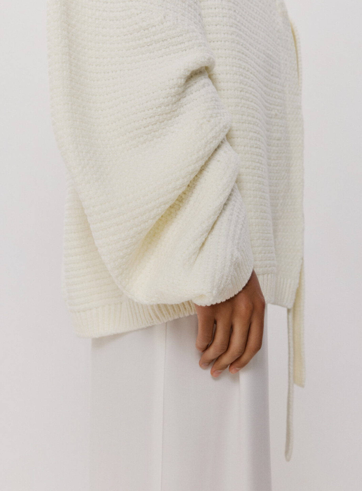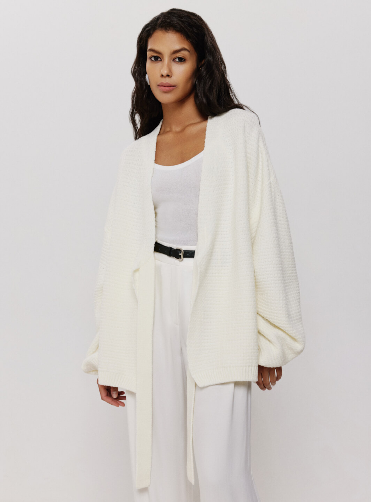 Кардиган женский оверсайз удлиненного кроя из фактурной ткани. Рукава стилизованы с помощью защипов, которые образуют несколько ниспадающих слоев, а функцию пуговиц выполняет завязка на груди. Создан для расслабленных и элегантных образов, сочетающихся с боди из полупрозрачной вискозы.