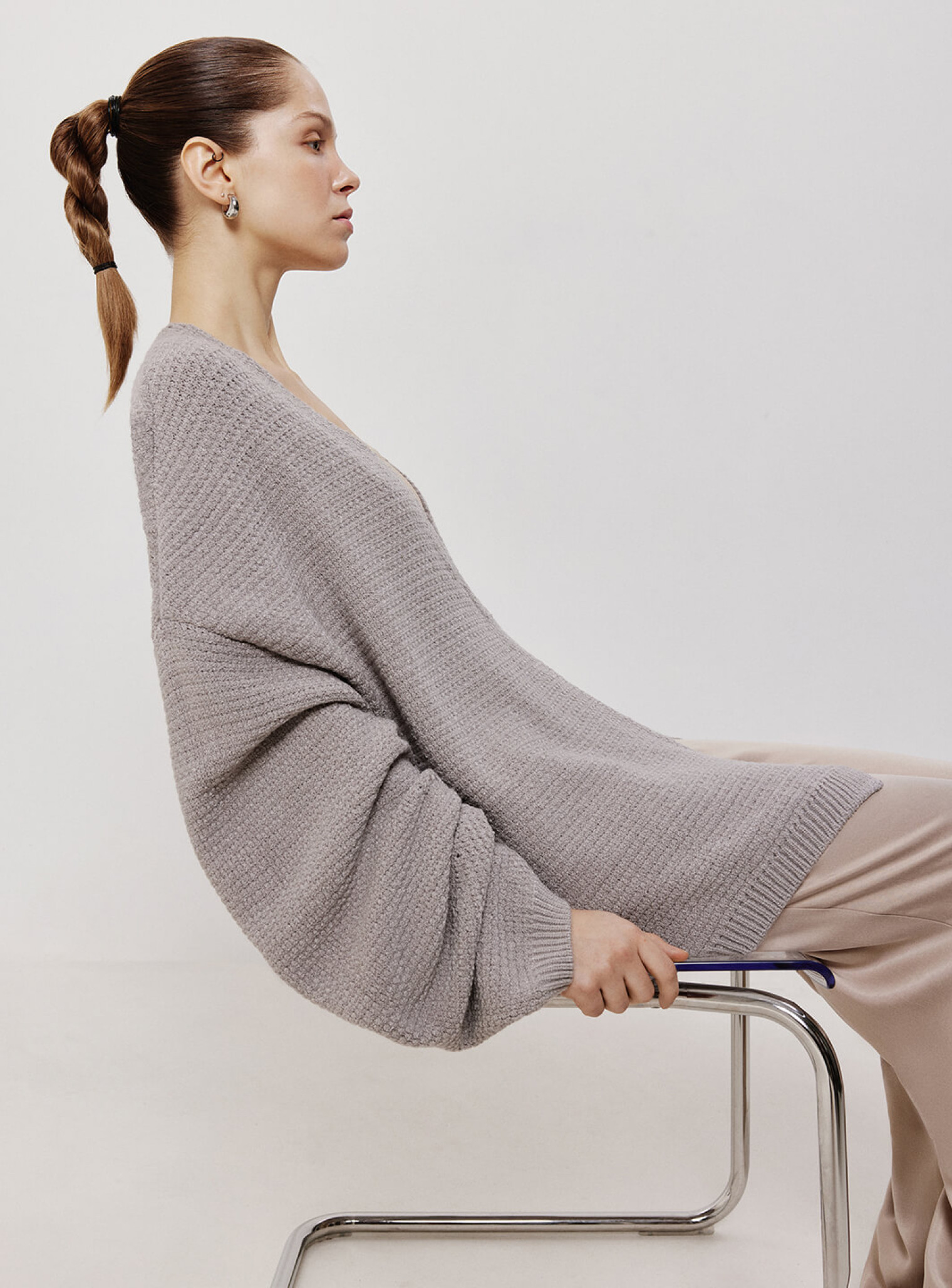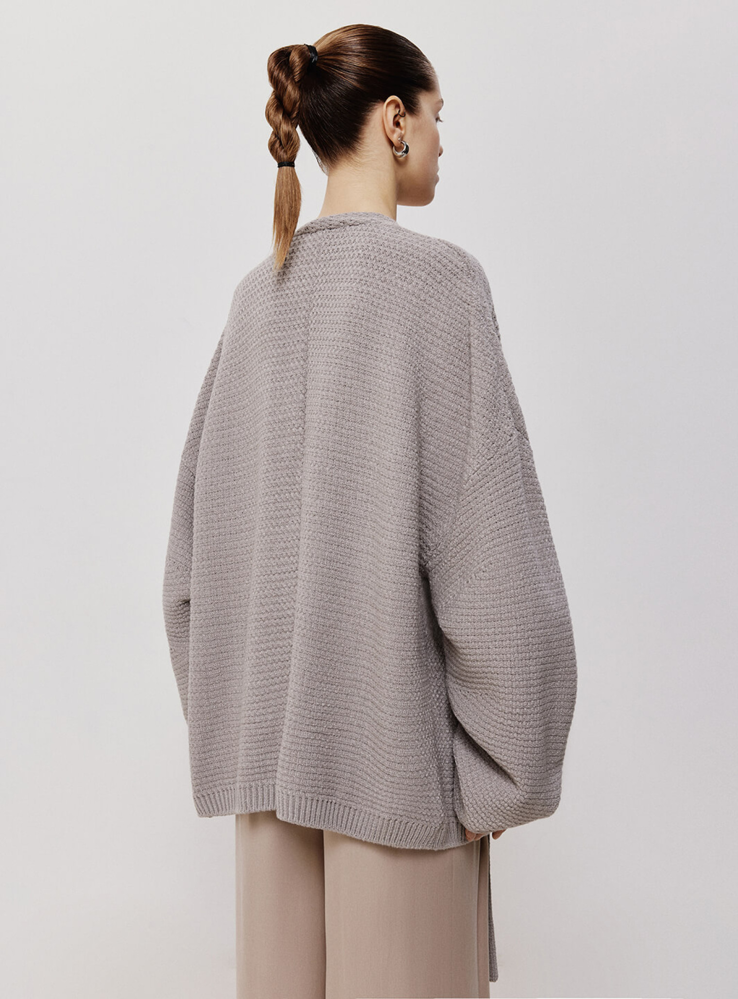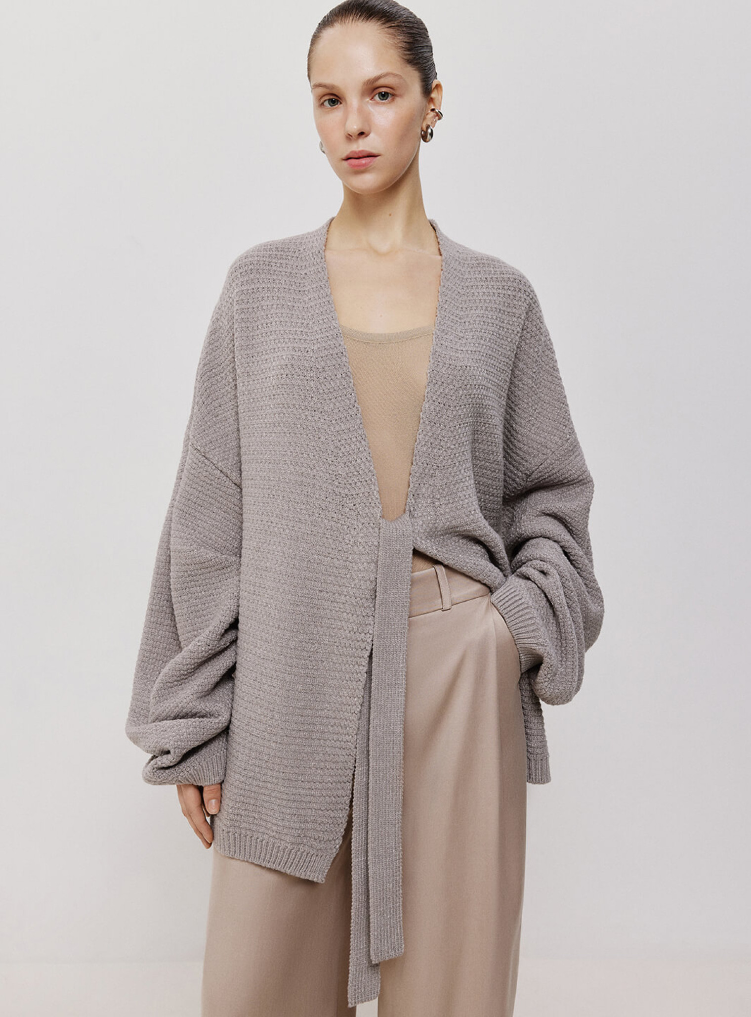 Кардиган женский оверсайз удлиненного кроя из фактурной ткани. Рукава стилизованы с помощью защипов, которые образуют несколько ниспадающих слоев, а функцию пуговиц выполняет завязка на груди. Создан для расслабленных и элегантных образов, сочетающихся с боди из полупрозрачной вискозы.