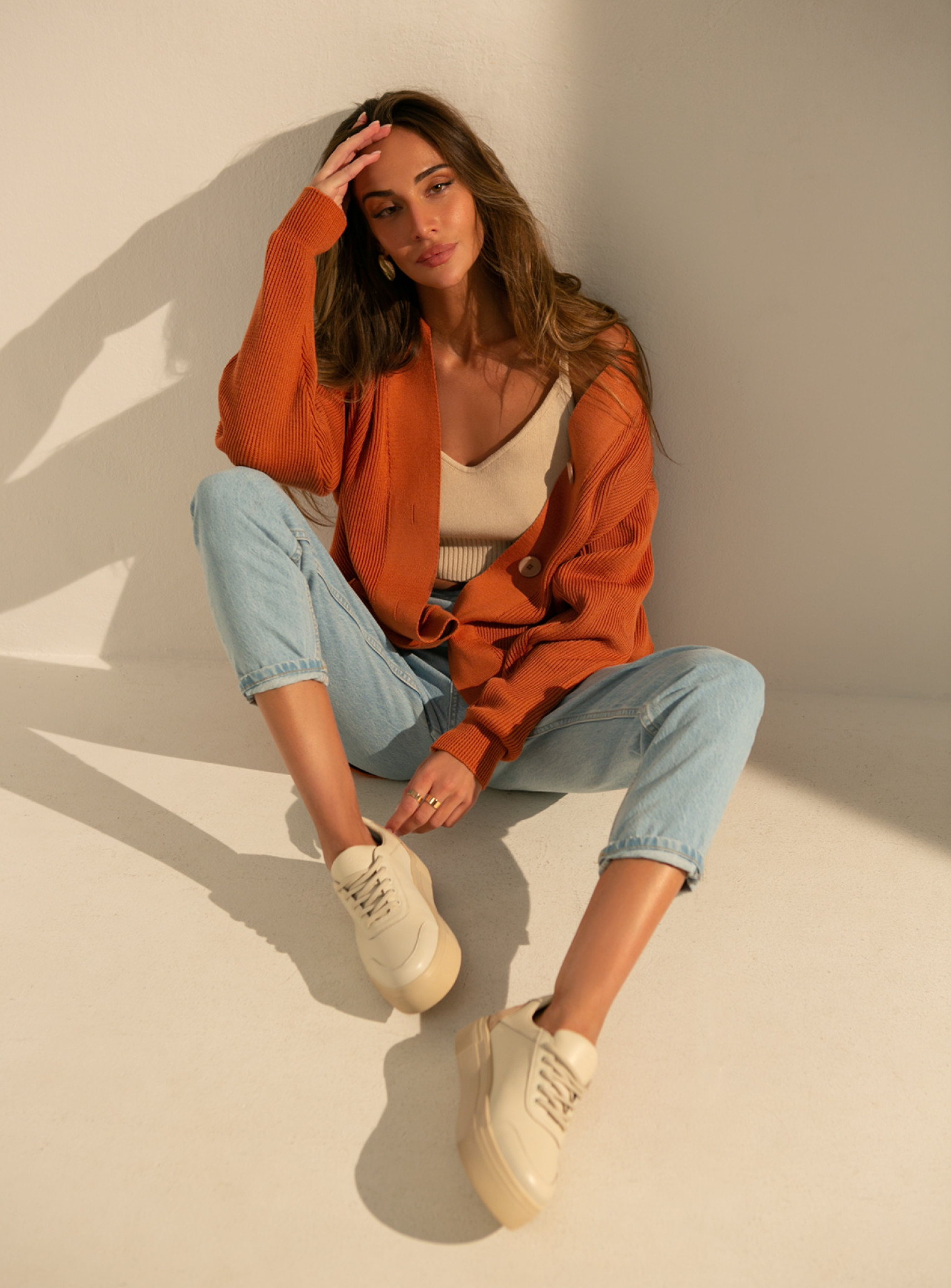 Кардиган oversize  из натуральной хлопковой нити. Идеально сочетается с фирменным топом, брюками клёш и платьем мини.
