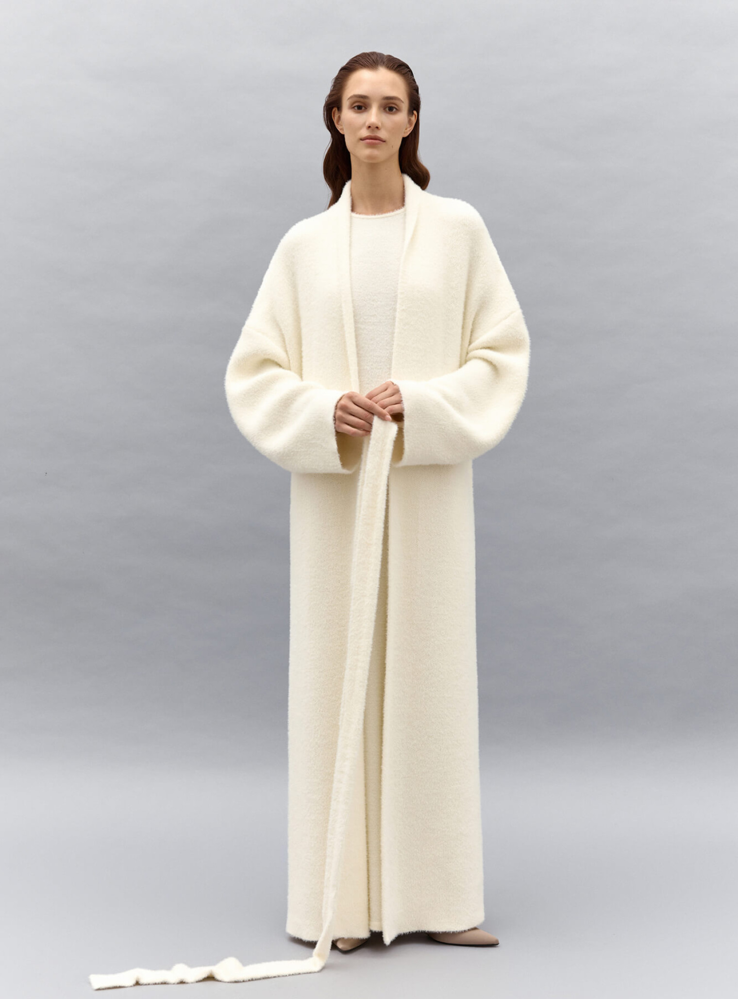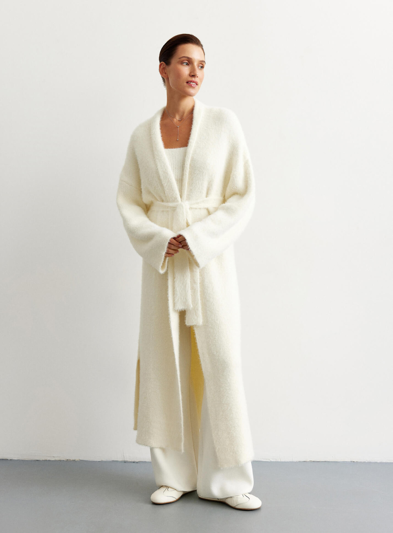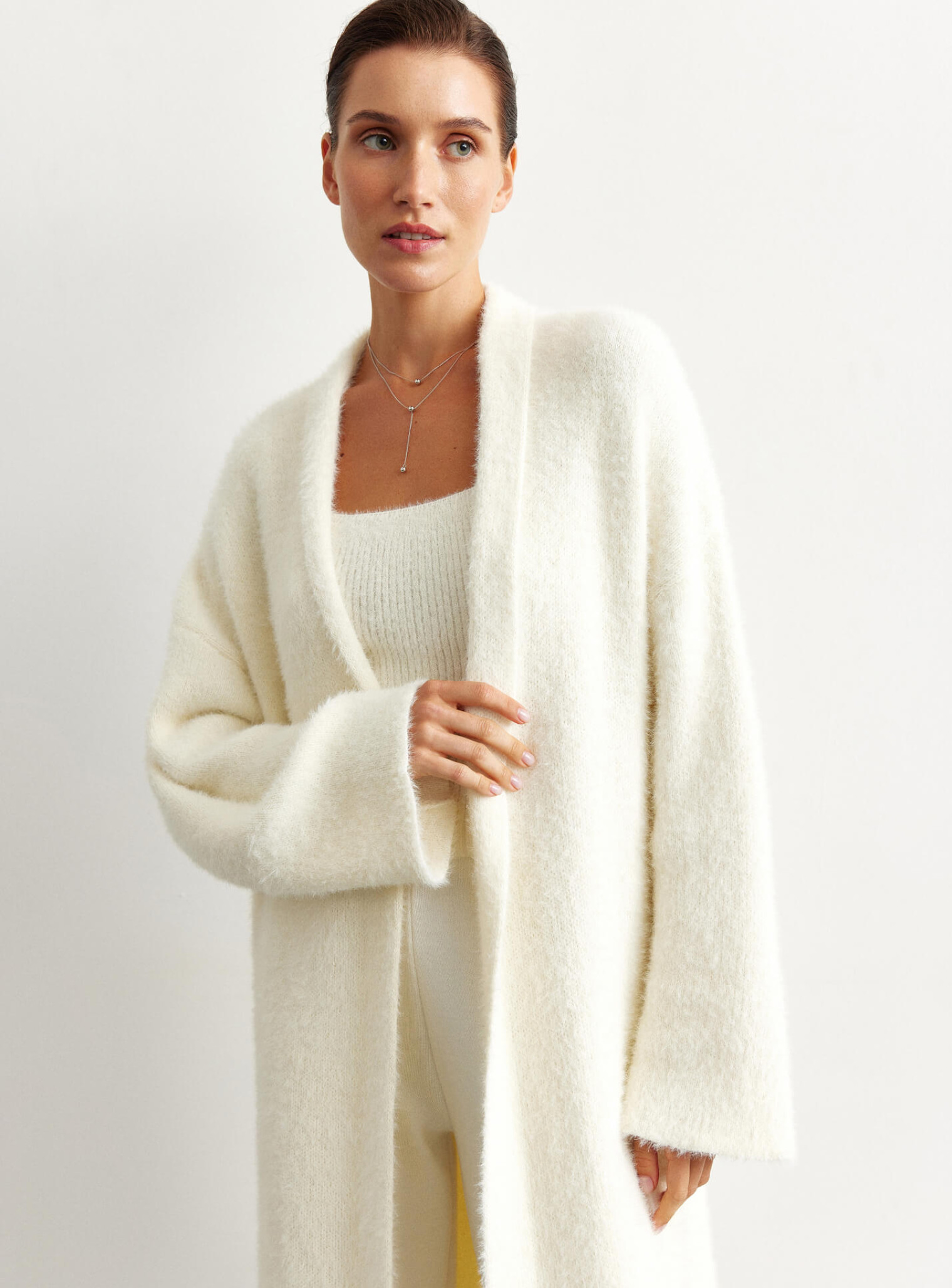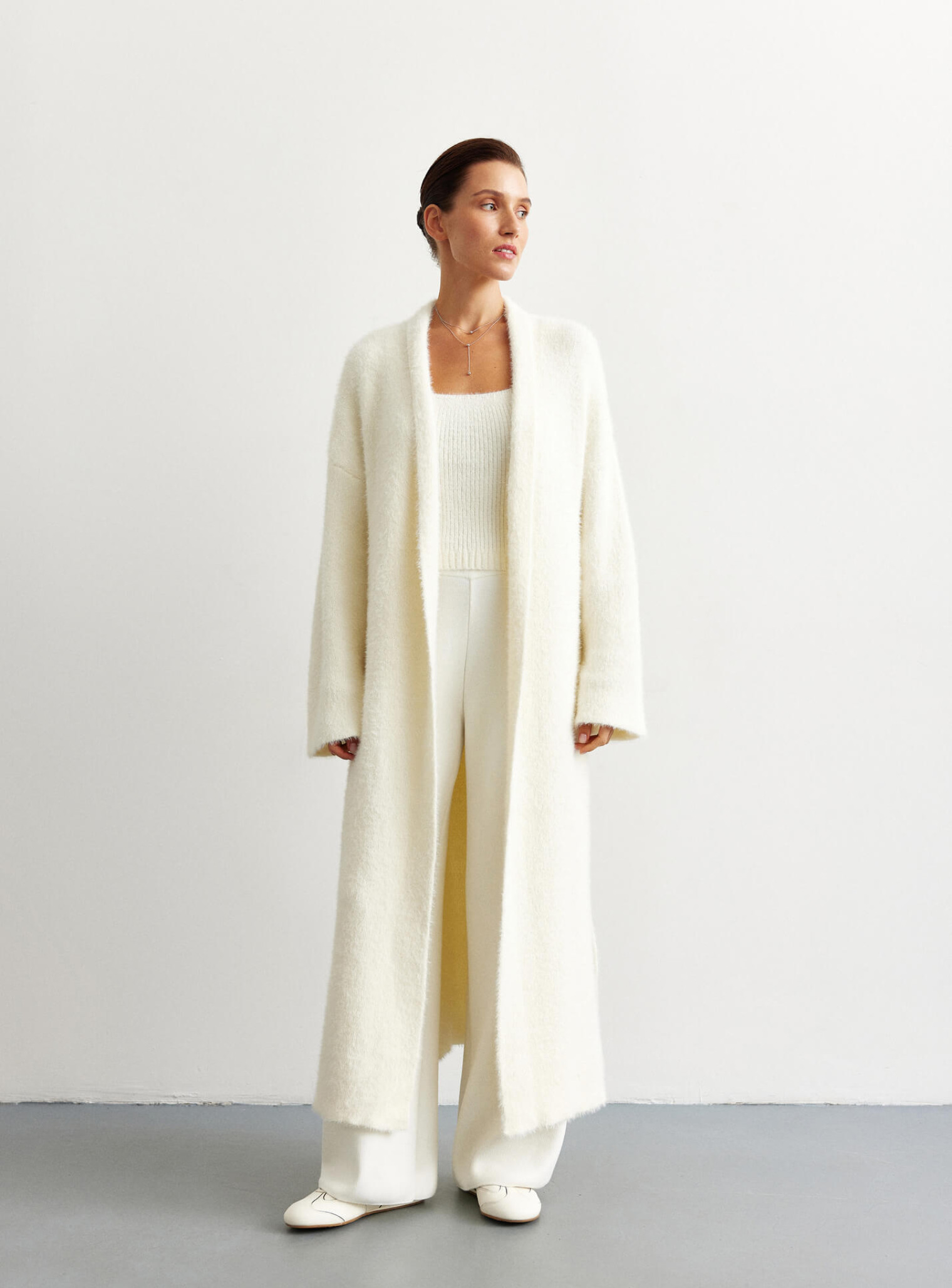 Удлиненный кардиган 115 и 122 см длинны. Выполнен из мягкой пушистой пряжи. Кардиган идеально подойдет на прохладную погоду. Комбинируется с фирменными костюмами "25 Union".