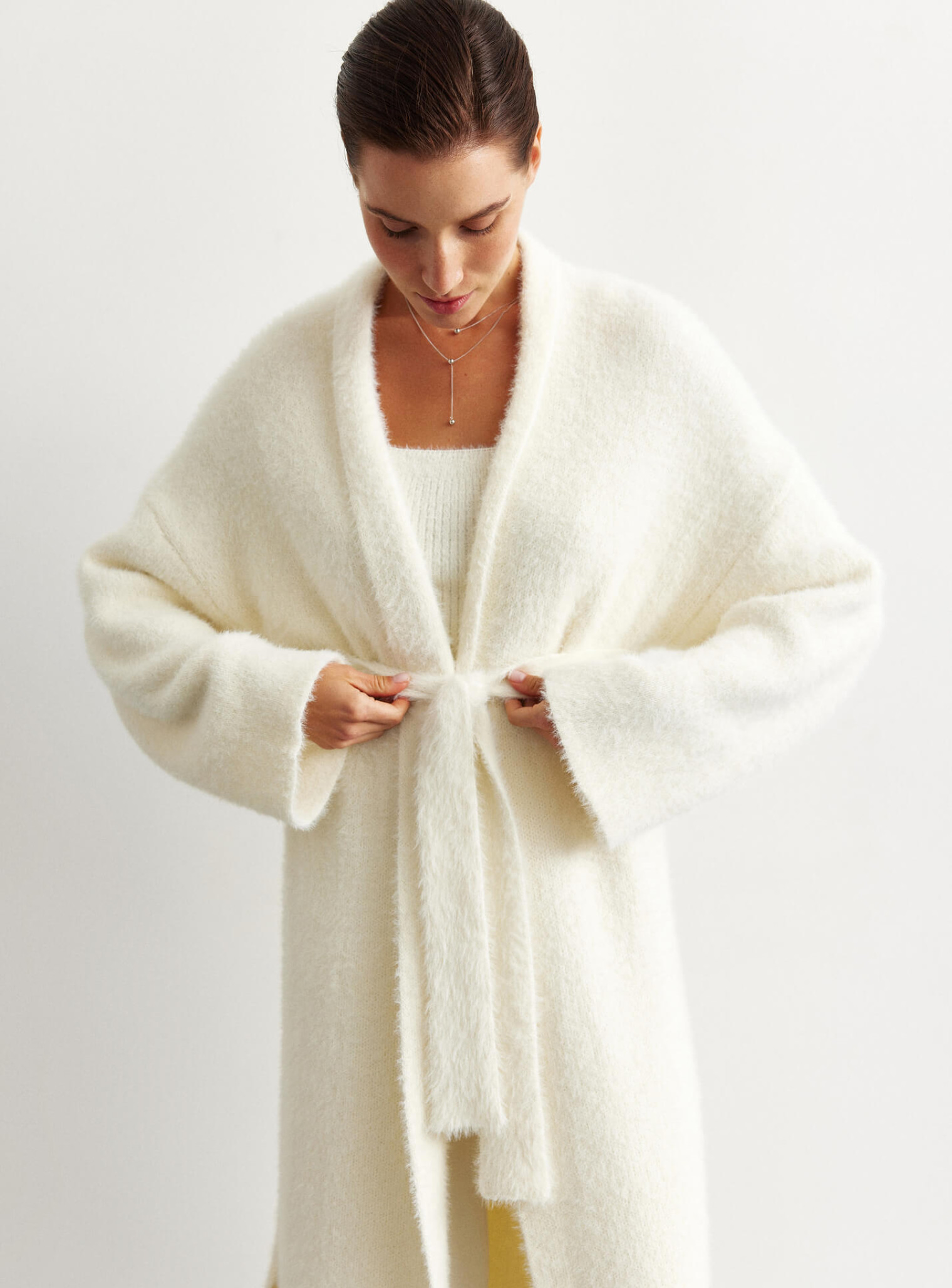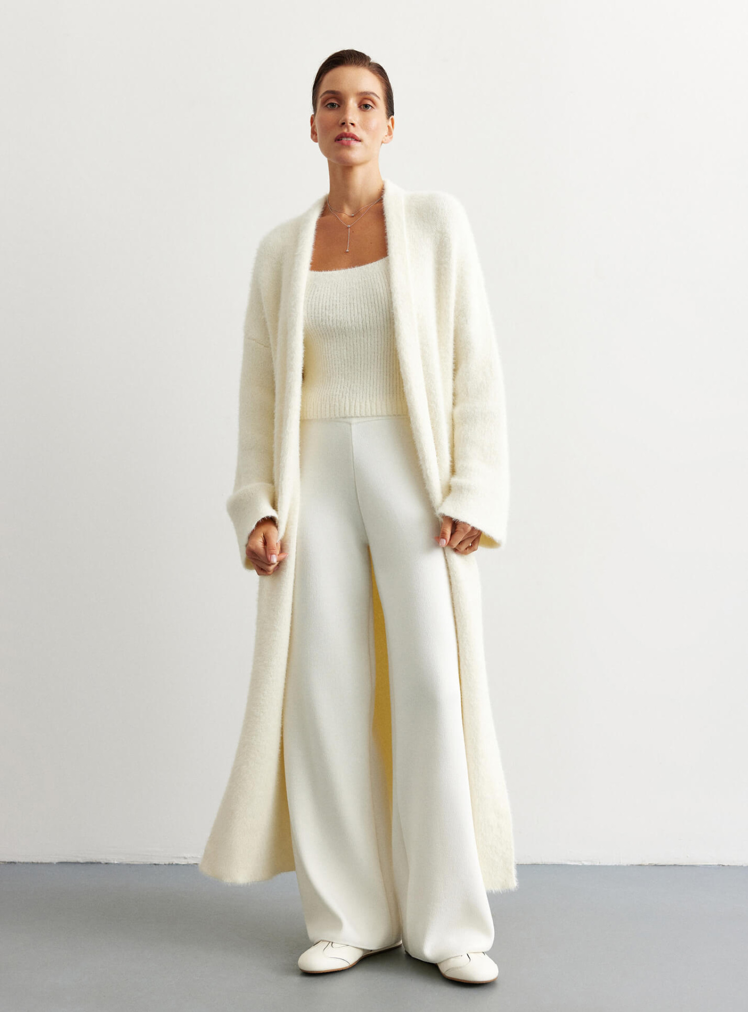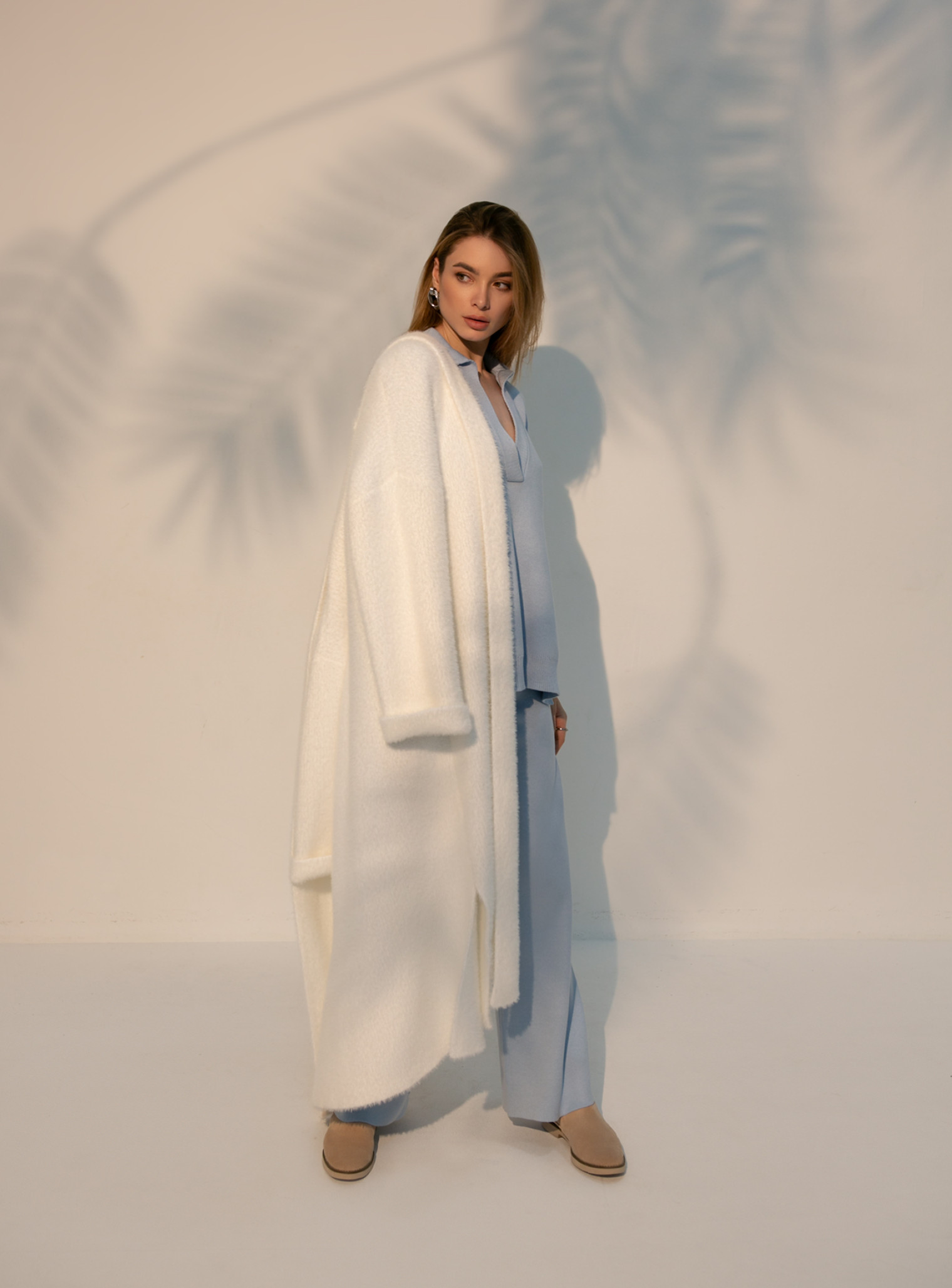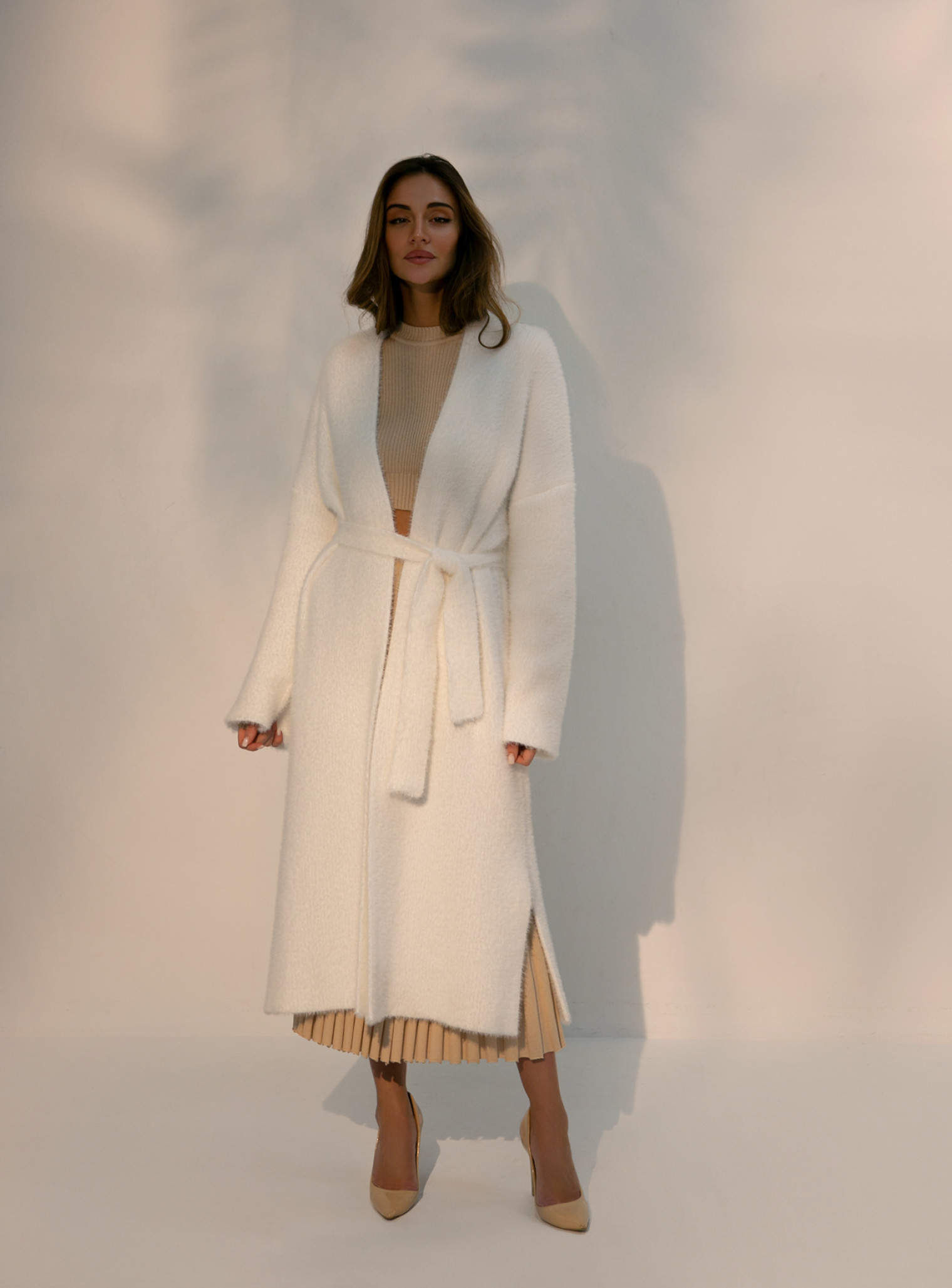 Удлиненный кардиган 115 и 122 см длинны. Выполнен из мягкой пушистой пряжи. Кардиган идеально подойдет на прохладную погоду. Комбинируется с фирменными костюмами "25 Union".