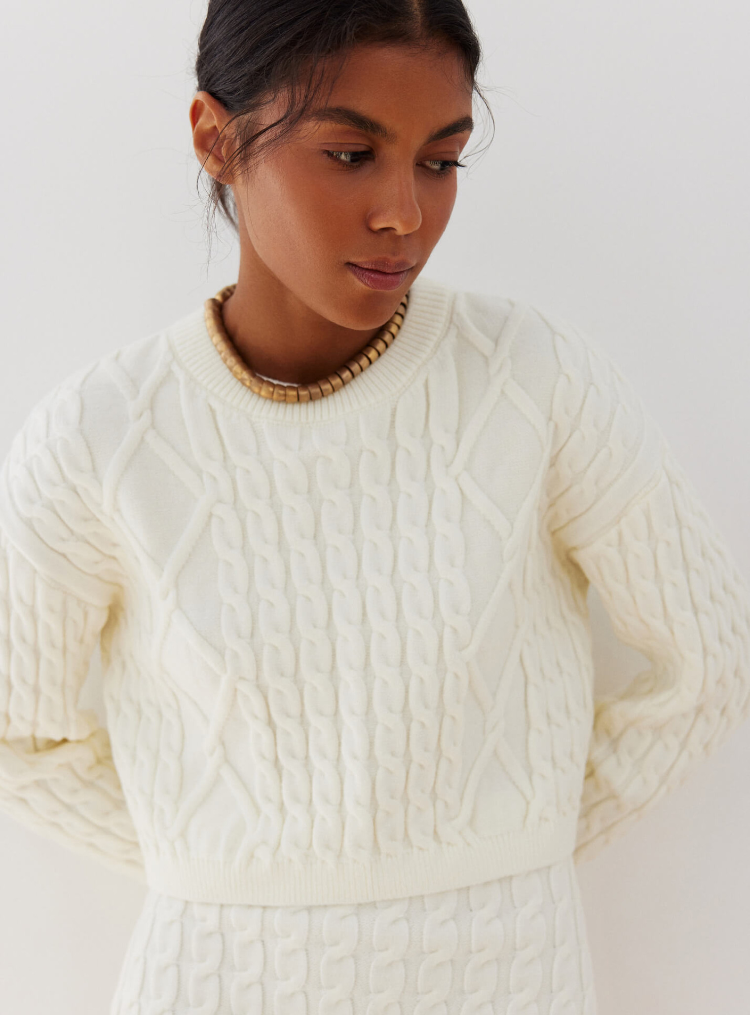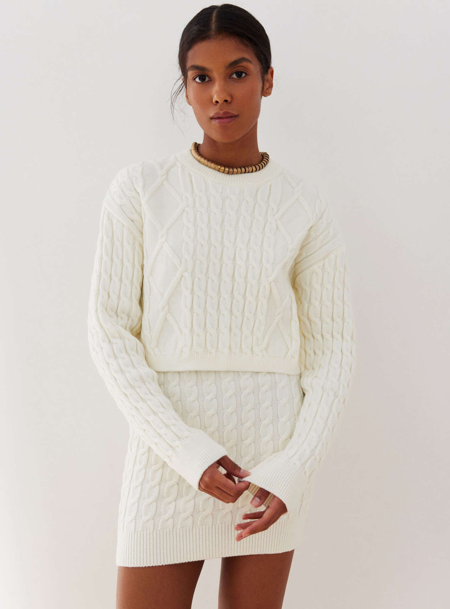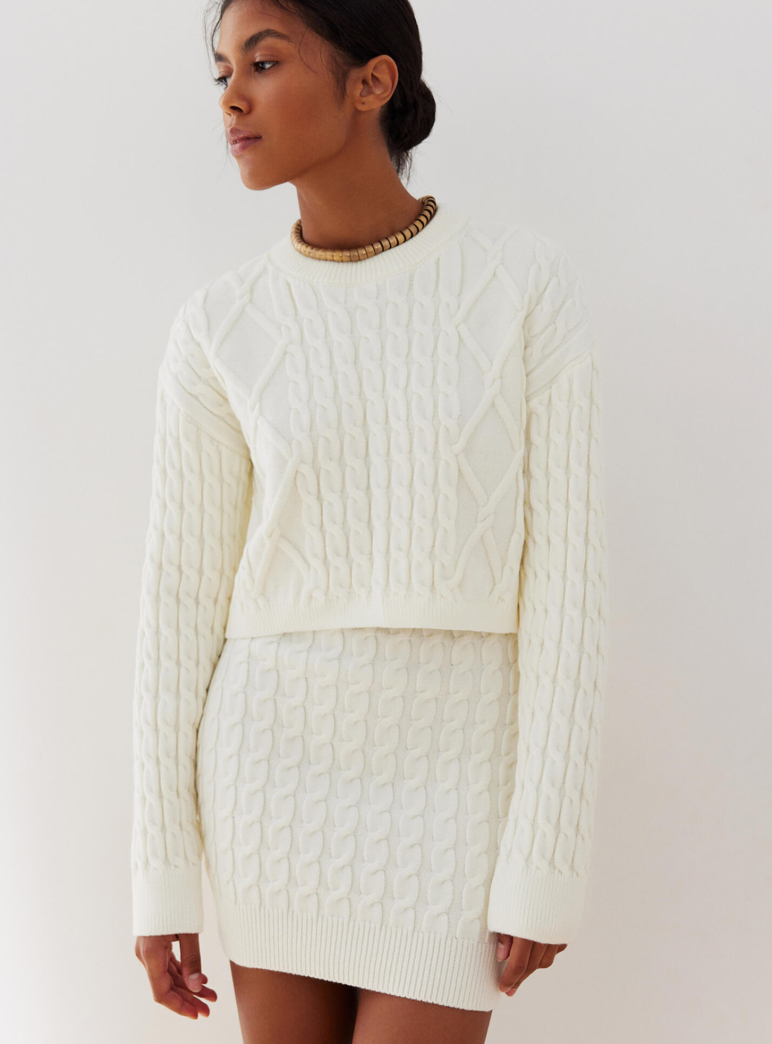 Комплект Фолен состоит из джемпера и юбки. Он выполнен в насыщенном красивом цвете, который не сможет оставить равнодушным. Юбка и джемпер украшены вязаными косами и ромбиками, поэтому изделия выглядят необычно и стильно. Укороченный верх делает талию визуально тоньше и помогает подчеркнуть изгибы фигуры.