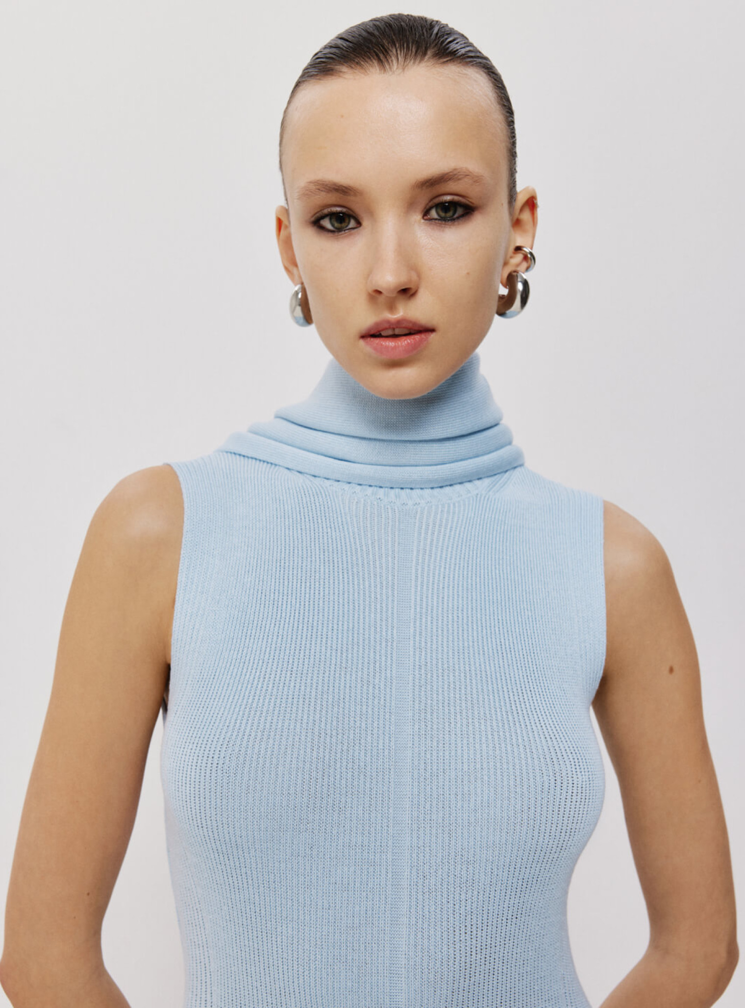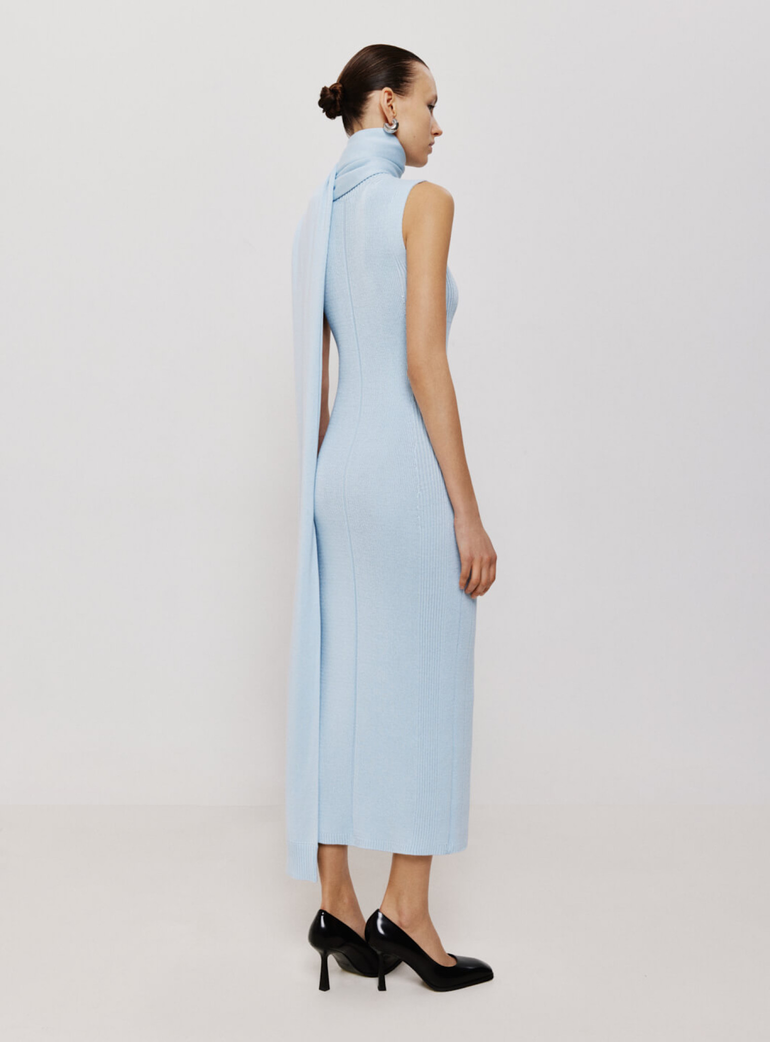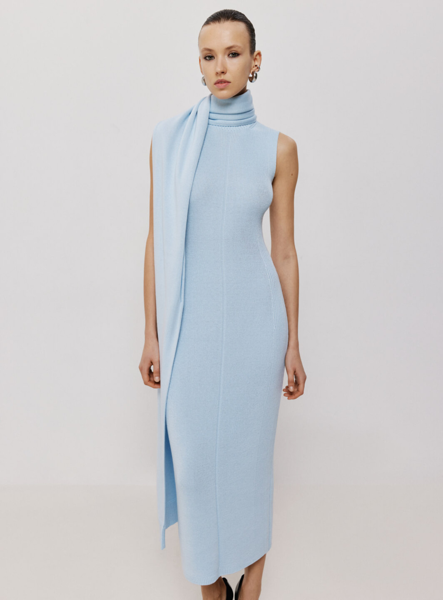 Нежное трикотажное платье голубого цвета хорошо садится по фигуре. Оно смотрится элегантно, сдержанно. Вертикальные линии вязки зрительно вытягивают силуэт. Особенность модели – комплектные рукава-трансформеры. Они делают это платье универсальным для дневного и вечернего выхода. Хлопковый трикотаж очень приятный к телу, хорошо сохраняет тепло. Дизайн платья лаконичный, и при этом оно смотрится необычно и нарядно. В комбинации с разными аксессуарами можно создавать множество образов с этой моделью.