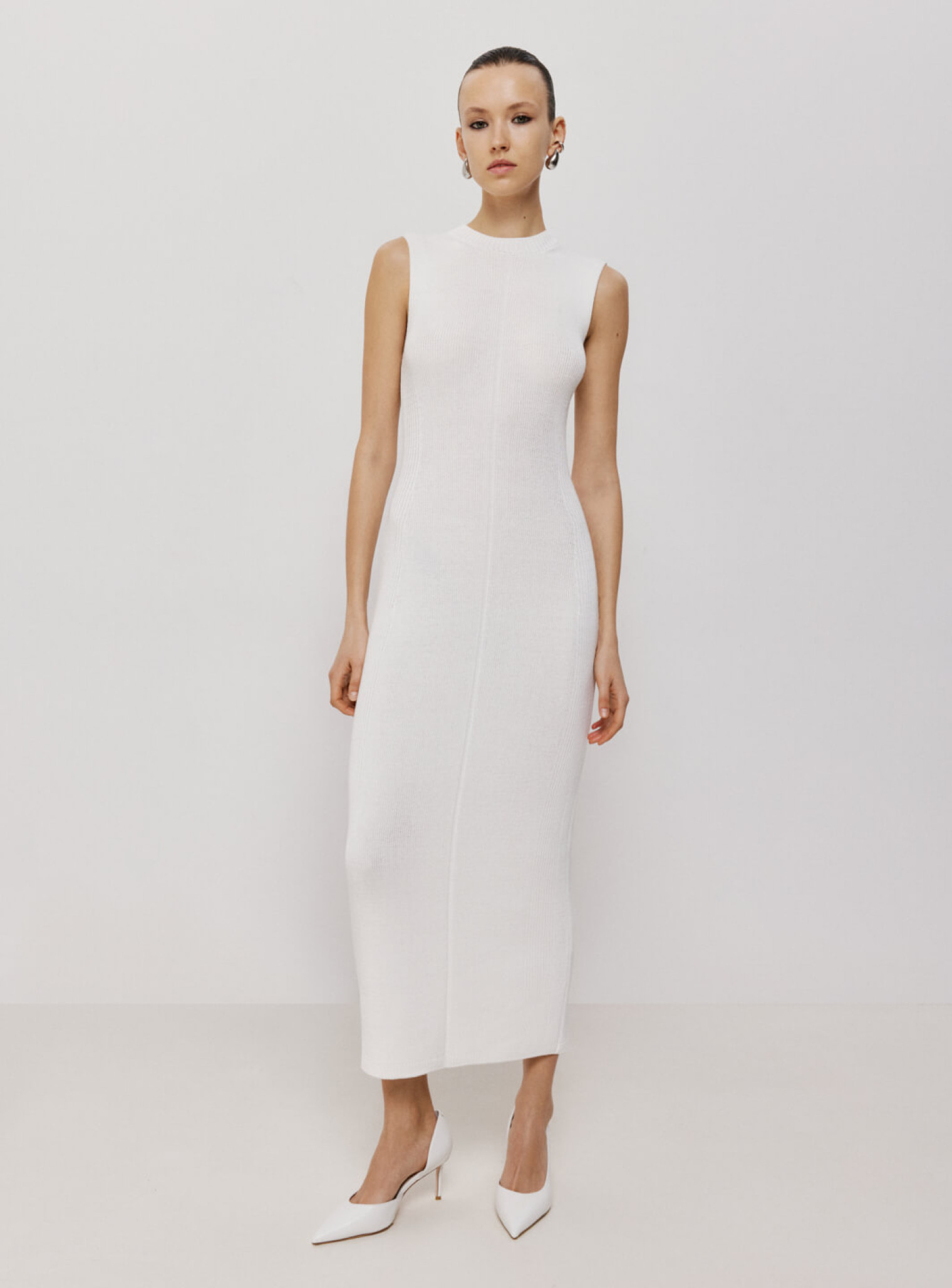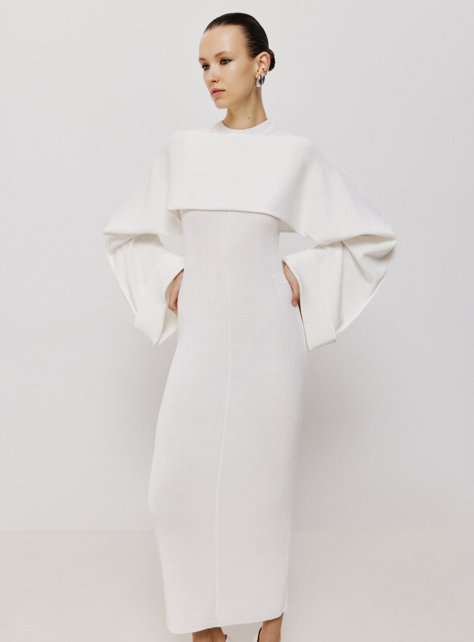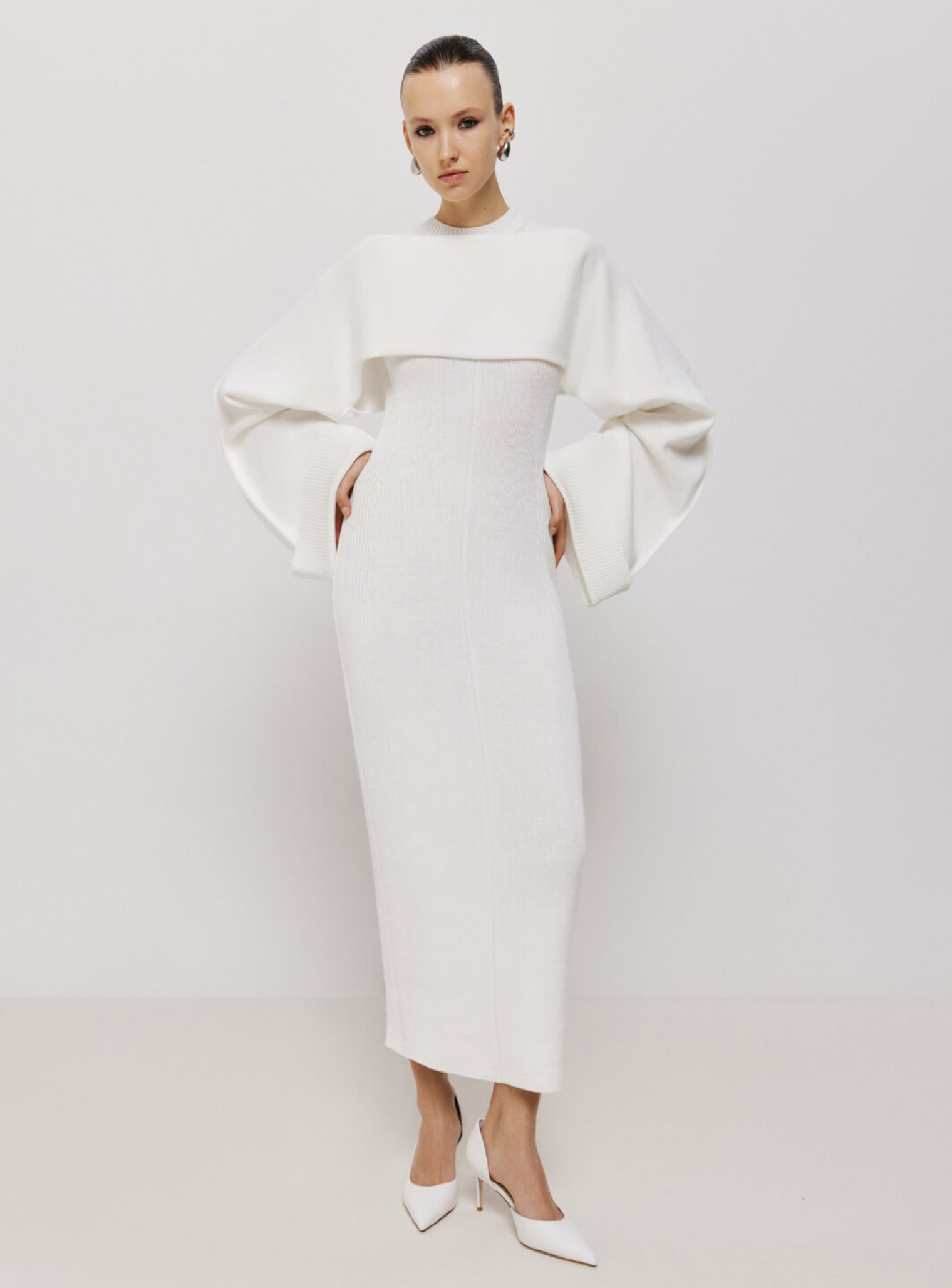 Нежное трикотажное платье молочного цвета хорошо садится по фигуре. Оно смотрится элегантно, сдержанно. Вертикальные линии вязки зрительно вытягивают силуэт. Особенность модели – комплектные рукава-трансформеры. Они делают это платье универсальным для дневного и вечернего выхода. Хлопковый трикотаж очень приятный к телу, хорошо сохраняет тепло. Дизайн платья лаконичный, и при этом оно смотрится необычно и нарядно. В комбинации с разными аксессуарами можно создавать множество образов с этой моделью.
