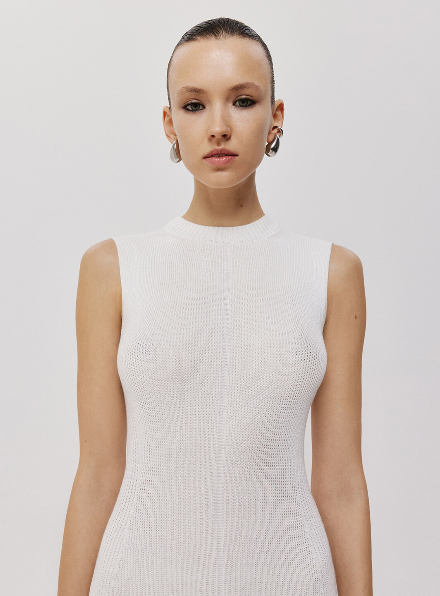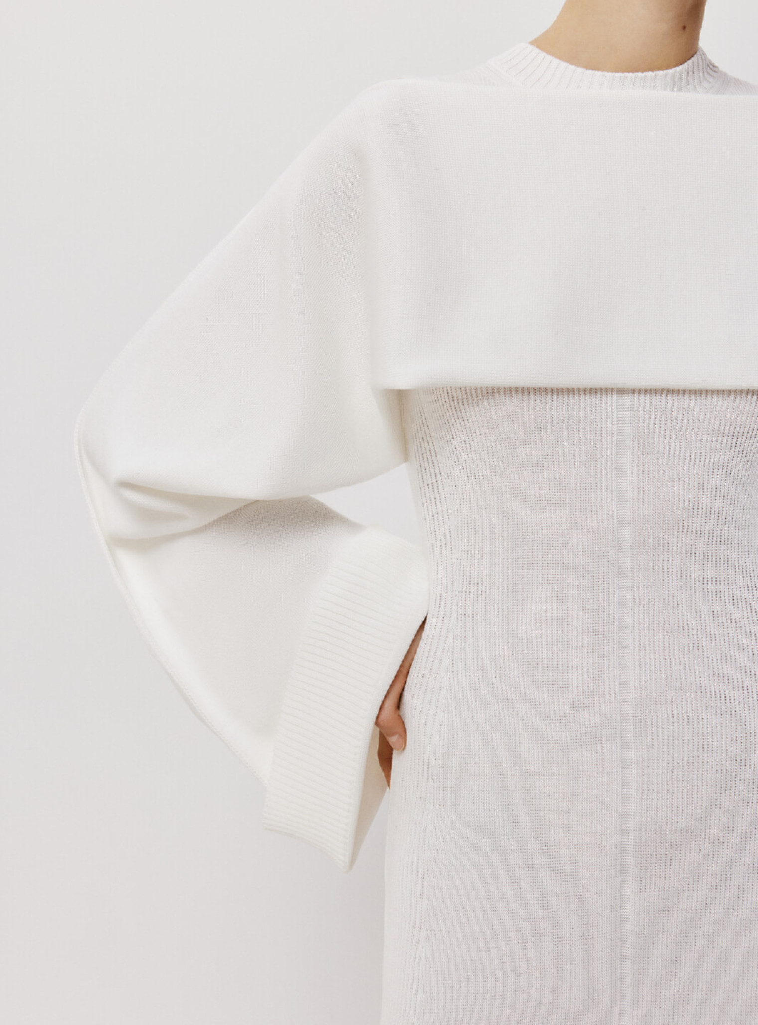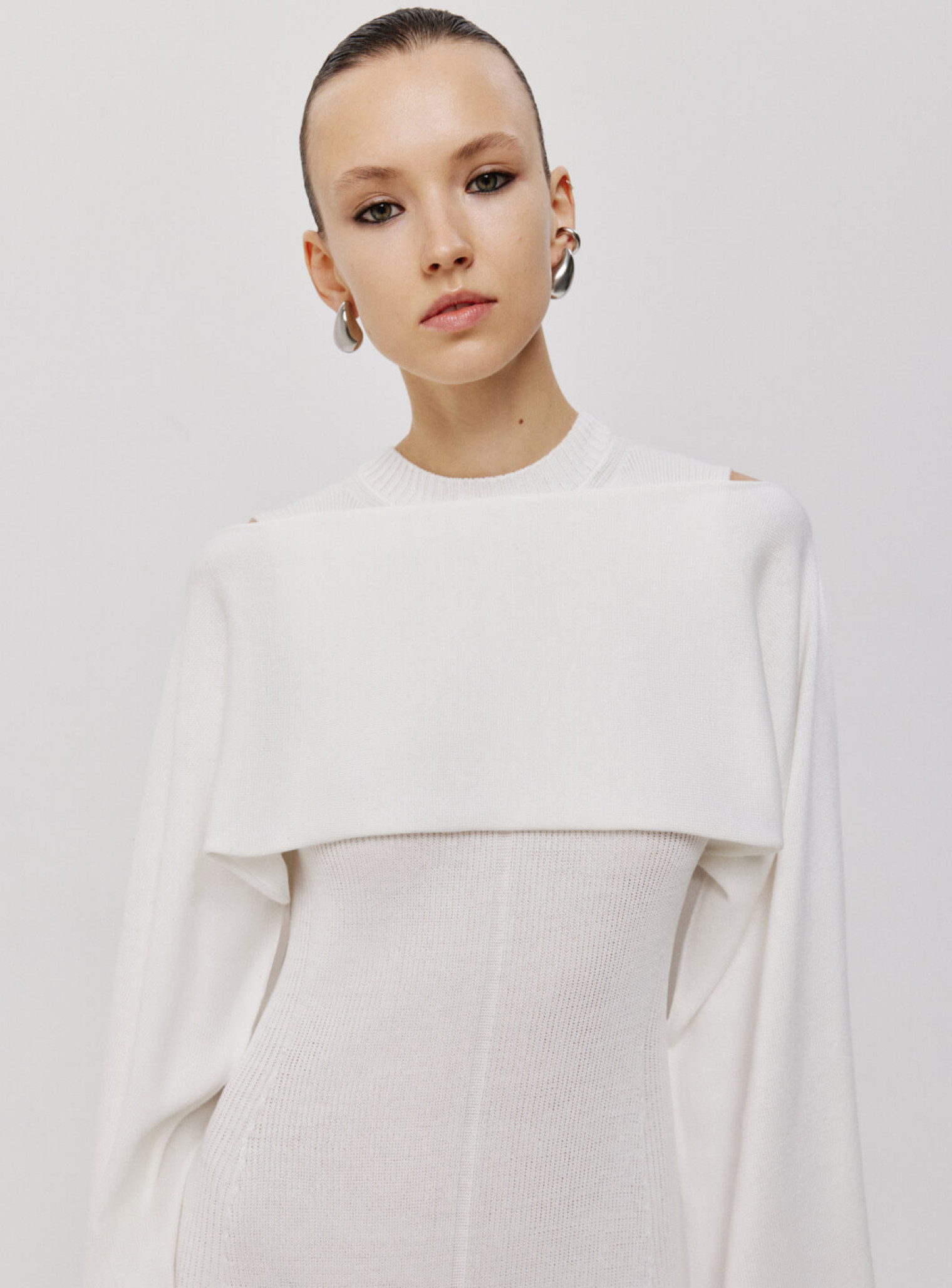 Нежное трикотажное платье молочного цвета хорошо садится по фигуре. Оно смотрится элегантно, сдержанно. Вертикальные линии вязки зрительно вытягивают силуэт. Особенность модели – комплектные рукава-трансформеры. Они делают это платье универсальным для дневного и вечернего выхода. Хлопковый трикотаж очень приятный к телу, хорошо сохраняет тепло. Дизайн платья лаконичный, и при этом оно смотрится необычно и нарядно. В комбинации с разными аксессуарами можно создавать множество образов с этой моделью.
